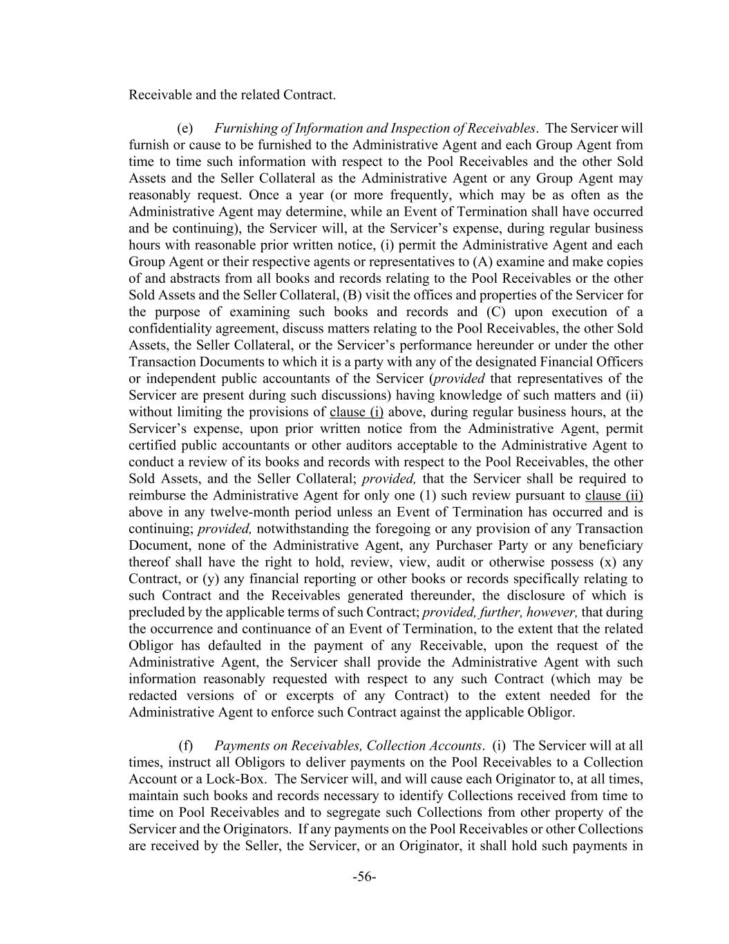 -56- Receivable and the related Contract. (e) Furnishing of Information and Inspection of Receivables. The Servicer will furnish or cause to be furnished to the Administrative Agent and each Group Agent from time to time such information with respect to the Pool Receivables and the other Sold Assets and the Seller Collateral as the Administrative Agent or any Group Agent may reasonably request. Once a year (or more frequently, which may be as often as the Administrative Agent may determine, while an Event of Termination shall have occurred and be continuing), the Servicer will, at the Servicer’s expense, during regular business hours with reasonable prior written notice, (i) permit the Administrative Agent and each Group Agent or their respective agents or representatives to (A) examine and make copies of and abstracts from all books and records relating to the Pool Receivables or the other Sold Assets and the Seller Collateral, (B) visit the offices and properties of the Servicer for the purpose of examining such books and records and (C) upon execution of a confidentiality agreement, discuss matters relating to the Pool Receivables, the other Sold Assets, the Seller Collateral, or the Servicer’s performance hereunder or under the other Transaction Documents to which it is a party with any of the designated Financial Officers or independent public accountants of the Servicer (provided that representatives of the Servicer are present during such discussions) having knowledge of such matters and (ii) without limiting the provisions of clause (i) above, during regular business hours, at the Servicer’s expense, upon prior written notice from the Administrative Agent, permit certified public accountants or other auditors acceptable to the Administrative Agent to conduct a review of its books and records with respect to the Pool Receivables, the other Sold Assets, and the Seller Collateral; provided, that the Servicer shall be required to reimburse the Administrative Agent for only one (1) such review pursuant to clause (ii) above in any twelve-month period unless an Event of Termination has occurred and is continuing; provided, notwithstanding the foregoing or any provision of any Transaction Document, none of the Administrative Agent, any Purchaser Party or any beneficiary thereof shall have the right to hold, review, view, audit or otherwise possess (x) any Contract, or (y) any financial reporting or other books or records specifically relating to such Contract and the Receivables generated thereunder, the disclosure of which is precluded by the applicable terms of such Contract; provided, further, however, that during the occurrence and continuance of an Event of Termination, to the extent that the related Obligor has defaulted in the payment of any Receivable, upon the request of the Administrative Agent, the Servicer shall provide the Administrative Agent with such information reasonably requested with respect to any such Contract (which may be redacted versions of or excerpts of any Contract) to the extent needed for the Administrative Agent to enforce such Contract against the applicable Obligor. (f) Payments on Receivables, Collection Accounts. (i) The Servicer will at all times, instruct all Obligors to deliver payments on the Pool Receivables to a Collection Account or a Lock-Box. The Servicer will, and will cause each Originator to, at all times, maintain such books and records necessary to identify Collections received from time to time on Pool Receivables and to segregate such Collections from other property of the Servicer and the Originators. If any payments on the Pool Receivables or other Collections are received by the Seller, the Servicer, or an Originator, it shall hold such payments in