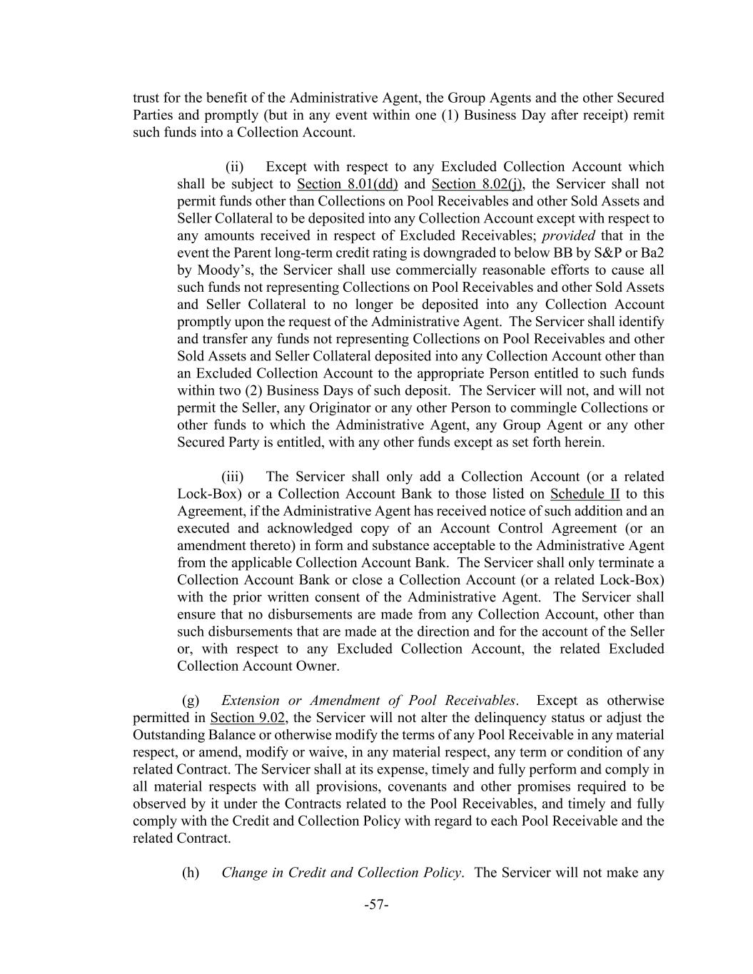 -57- trust for the benefit of the Administrative Agent, the Group Agents and the other Secured Parties and promptly (but in any event within one (1) Business Day after receipt) remit such funds into a Collection Account. (ii) Except with respect to any Excluded Collection Account which shall be subject to Section 8.01(dd) and Section 8.02(j), the Servicer shall not permit funds other than Collections on Pool Receivables and other Sold Assets and Seller Collateral to be deposited into any Collection Account except with respect to any amounts received in respect of Excluded Receivables; provided that in the event the Parent long-term credit rating is downgraded to below BB by S&P or Ba2 by Moody’s, the Servicer shall use commercially reasonable efforts to cause all such funds not representing Collections on Pool Receivables and other Sold Assets and Seller Collateral to no longer be deposited into any Collection Account promptly upon the request of the Administrative Agent. The Servicer shall identify and transfer any funds not representing Collections on Pool Receivables and other Sold Assets and Seller Collateral deposited into any Collection Account other than an Excluded Collection Account to the appropriate Person entitled to such funds within two (2) Business Days of such deposit. The Servicer will not, and will not permit the Seller, any Originator or any other Person to commingle Collections or other funds to which the Administrative Agent, any Group Agent or any other Secured Party is entitled, with any other funds except as set forth herein. (iii) The Servicer shall only add a Collection Account (or a related Lock-Box) or a Collection Account Bank to those listed on Schedule II to this Agreement, if the Administrative Agent has received notice of such addition and an executed and acknowledged copy of an Account Control Agreement (or an amendment thereto) in form and substance acceptable to the Administrative Agent from the applicable Collection Account Bank. The Servicer shall only terminate a Collection Account Bank or close a Collection Account (or a related Lock-Box) with the prior written consent of the Administrative Agent. The Servicer shall ensure that no disbursements are made from any Collection Account, other than such disbursements that are made at the direction and for the account of the Seller or, with respect to any Excluded Collection Account, the related Excluded Collection Account Owner. (g) Extension or Amendment of Pool Receivables. Except as otherwise permitted in Section 9.02, the Servicer will not alter the delinquency status or adjust the Outstanding Balance or otherwise modify the terms of any Pool Receivable in any material respect, or amend, modify or waive, in any material respect, any term or condition of any related Contract. The Servicer shall at its expense, timely and fully perform and comply in all material respects with all provisions, covenants and other promises required to be observed by it under the Contracts related to the Pool Receivables, and timely and fully comply with the Credit and Collection Policy with regard to each Pool Receivable and the related Contract. (h) Change in Credit and Collection Policy. The Servicer will not make any