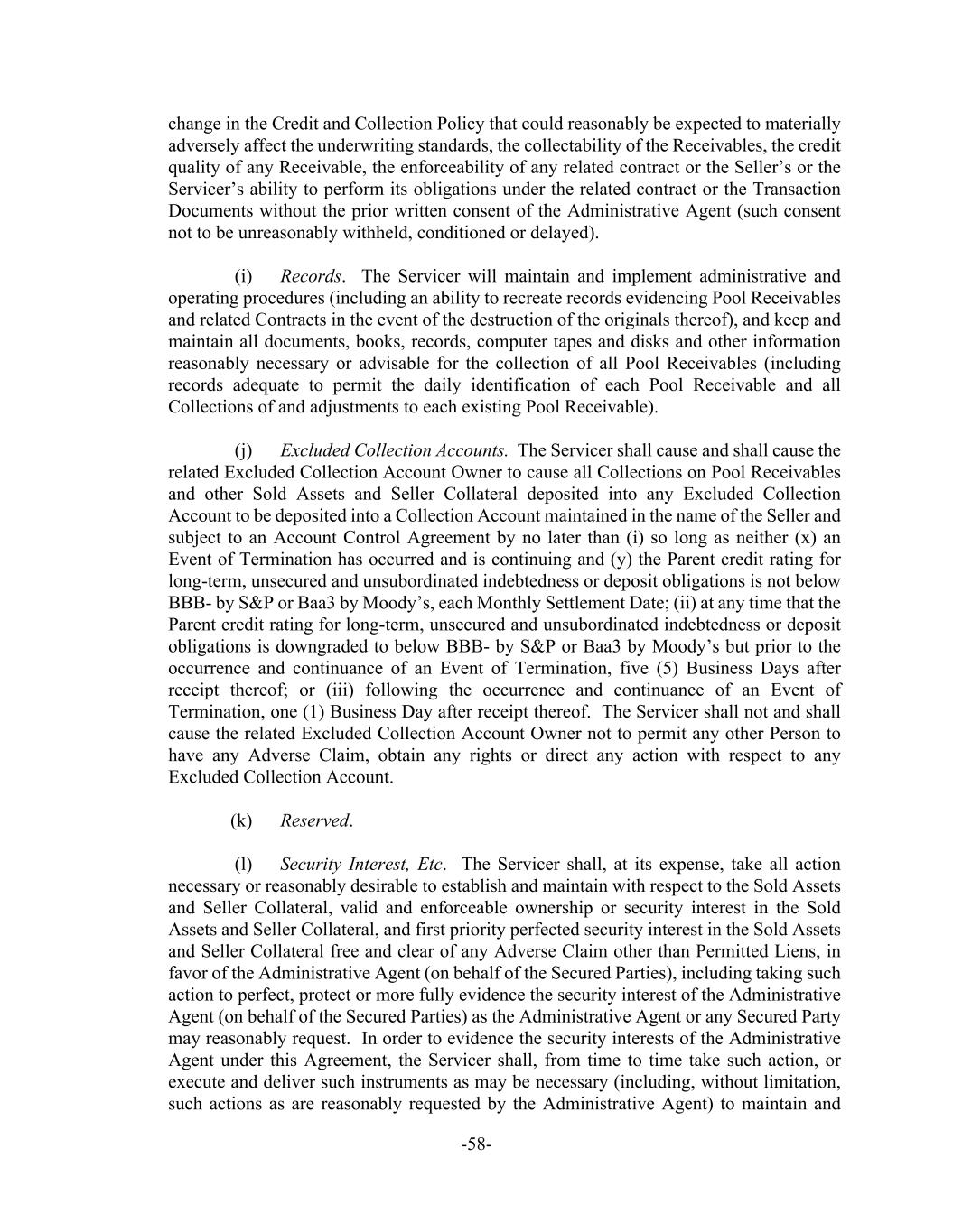 -58- change in the Credit and Collection Policy that could reasonably be expected to materially adversely affect the underwriting standards, the collectability of the Receivables, the credit quality of any Receivable, the enforceability of any related contract or the Seller’s or the Servicer’s ability to perform its obligations under the related contract or the Transaction Documents without the prior written consent of the Administrative Agent (such consent not to be unreasonably withheld, conditioned or delayed). (i) Records. The Servicer will maintain and implement administrative and operating procedures (including an ability to recreate records evidencing Pool Receivables and related Contracts in the event of the destruction of the originals thereof), and keep and maintain all documents, books, records, computer tapes and disks and other information reasonably necessary or advisable for the collection of all Pool Receivables (including records adequate to permit the daily identification of each Pool Receivable and all Collections of and adjustments to each existing Pool Receivable). (j) Excluded Collection Accounts. The Servicer shall cause and shall cause the related Excluded Collection Account Owner to cause all Collections on Pool Receivables and other Sold Assets and Seller Collateral deposited into any Excluded Collection Account to be deposited into a Collection Account maintained in the name of the Seller and subject to an Account Control Agreement by no later than (i) so long as neither (x) an Event of Termination has occurred and is continuing and (y) the Parent credit rating for long-term, unsecured and unsubordinated indebtedness or deposit obligations is not below BBB- by S&P or Baa3 by Moody’s, each Monthly Settlement Date; (ii) at any time that the Parent credit rating for long-term, unsecured and unsubordinated indebtedness or deposit obligations is downgraded to below BBB- by S&P or Baa3 by Moody’s but prior to the occurrence and continuance of an Event of Termination, five (5) Business Days after receipt thereof; or (iii) following the occurrence and continuance of an Event of Termination, one (1) Business Day after receipt thereof. The Servicer shall not and shall cause the related Excluded Collection Account Owner not to permit any other Person to have any Adverse Claim, obtain any rights or direct any action with respect to any Excluded Collection Account. (k) Reserved. (l) Security Interest, Etc. The Servicer shall, at its expense, take all action necessary or reasonably desirable to establish and maintain with respect to the Sold Assets and Seller Collateral, valid and enforceable ownership or security interest in the Sold Assets and Seller Collateral, and first priority perfected security interest in the Sold Assets and Seller Collateral free and clear of any Adverse Claim other than Permitted Liens, in favor of the Administrative Agent (on behalf of the Secured Parties), including taking such action to perfect, protect or more fully evidence the security interest of the Administrative Agent (on behalf of the Secured Parties) as the Administrative Agent or any Secured Party may reasonably request. In order to evidence the security interests of the Administrative Agent under this Agreement, the Servicer shall, from time to time take such action, or execute and deliver such instruments as may be necessary (including, without limitation, such actions as are reasonably requested by the Administrative Agent) to maintain and