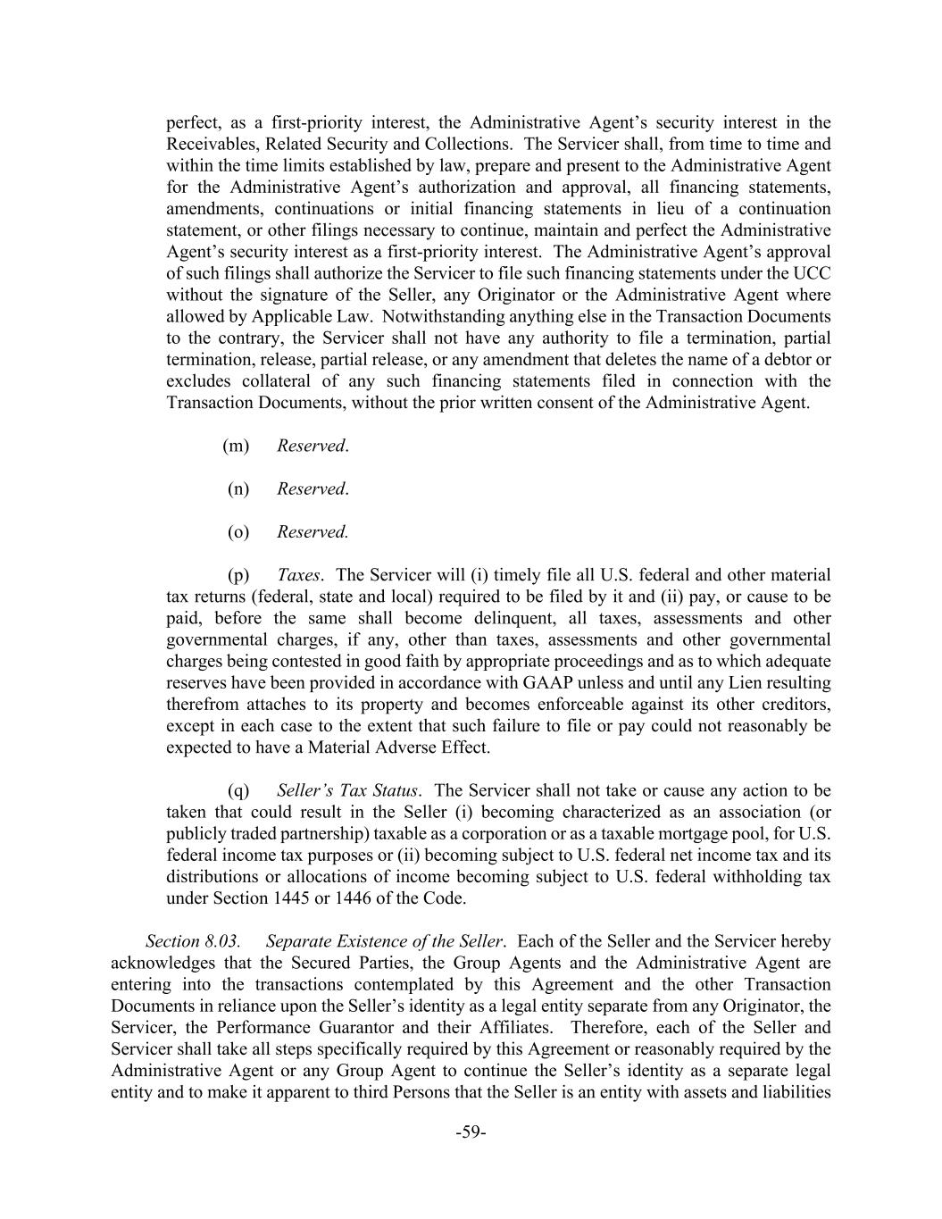 -59- perfect, as a first-priority interest, the Administrative Agent’s security interest in the Receivables, Related Security and Collections. The Servicer shall, from time to time and within the time limits established by law, prepare and present to the Administrative Agent for the Administrative Agent’s authorization and approval, all financing statements, amendments, continuations or initial financing statements in lieu of a continuation statement, or other filings necessary to continue, maintain and perfect the Administrative Agent’s security interest as a first-priority interest. The Administrative Agent’s approval of such filings shall authorize the Servicer to file such financing statements under the UCC without the signature of the Seller, any Originator or the Administrative Agent where allowed by Applicable Law. Notwithstanding anything else in the Transaction Documents to the contrary, the Servicer shall not have any authority to file a termination, partial termination, release, partial release, or any amendment that deletes the name of a debtor or excludes collateral of any such financing statements filed in connection with the Transaction Documents, without the prior written consent of the Administrative Agent. (m) Reserved. (n) Reserved. (o) Reserved. (p) Taxes. The Servicer will (i) timely file all U.S. federal and other material tax returns (federal, state and local) required to be filed by it and (ii) pay, or cause to be paid, before the same shall become delinquent, all taxes, assessments and other governmental charges, if any, other than taxes, assessments and other governmental charges being contested in good faith by appropriate proceedings and as to which adequate reserves have been provided in accordance with GAAP unless and until any Lien resulting therefrom attaches to its property and becomes enforceable against its other creditors, except in each case to the extent that such failure to file or pay could not reasonably be expected to have a Material Adverse Effect. (q) Seller’s Tax Status. The Servicer shall not take or cause any action to be taken that could result in the Seller (i) becoming characterized as an association (or publicly traded partnership) taxable as a corporation or as a taxable mortgage pool, for U.S. federal income tax purposes or (ii) becoming subject to U.S. federal net income tax and its distributions or allocations of income becoming subject to U.S. federal withholding tax under Section 1445 or 1446 of the Code. Section 8.03. Separate Existence of the Seller. Each of the Seller and the Servicer hereby acknowledges that the Secured Parties, the Group Agents and the Administrative Agent are entering into the transactions contemplated by this Agreement and the other Transaction Documents in reliance upon the Seller’s identity as a legal entity separate from any Originator, the Servicer, the Performance Guarantor and their Affiliates. Therefore, each of the Seller and Servicer shall take all steps specifically required by this Agreement or reasonably required by the Administrative Agent or any Group Agent to continue the Seller’s identity as a separate legal entity and to make it apparent to third Persons that the Seller is an entity with assets and liabilities
