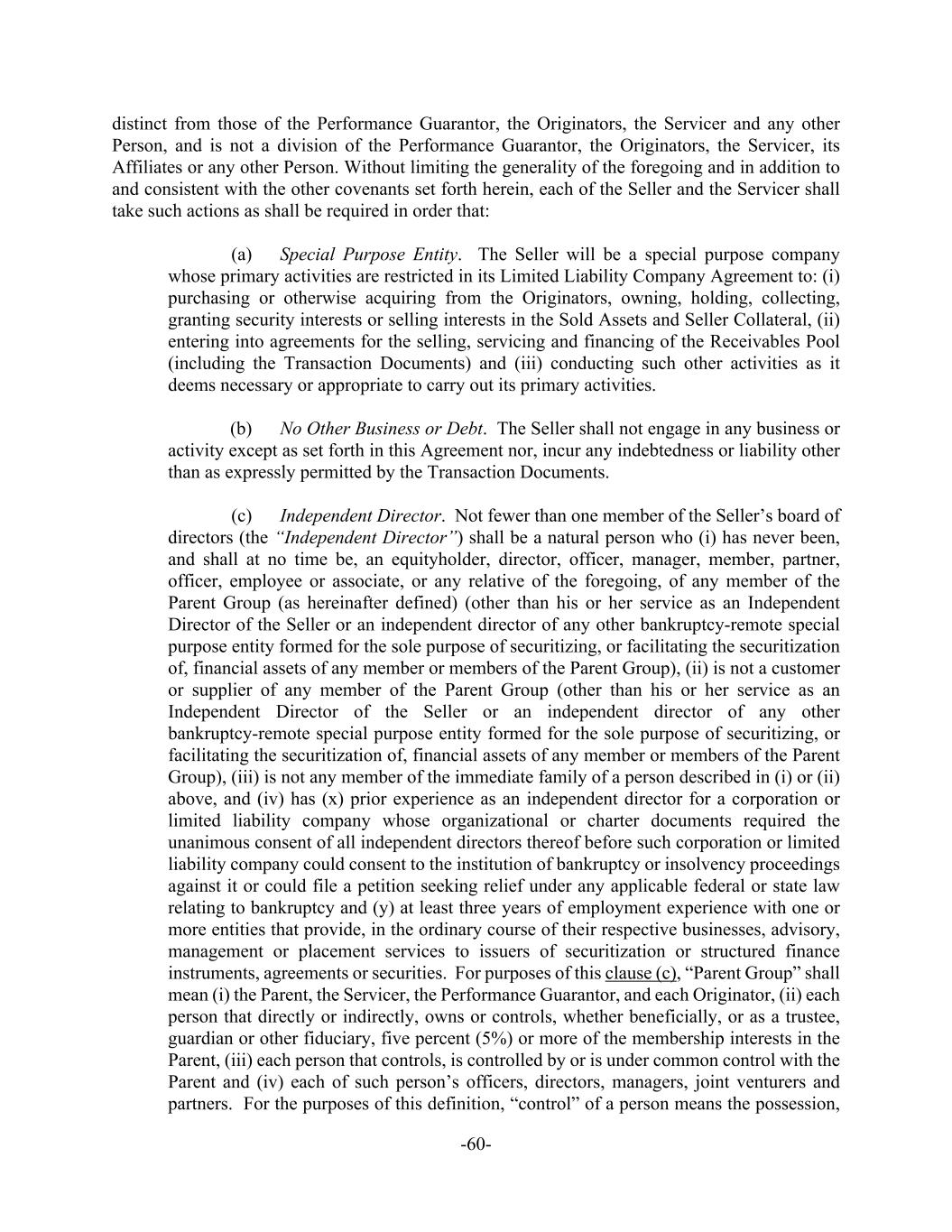 -60- distinct from those of the Performance Guarantor, the Originators, the Servicer and any other Person, and is not a division of the Performance Guarantor, the Originators, the Servicer, its Affiliates or any other Person. Without limiting the generality of the foregoing and in addition to and consistent with the other covenants set forth herein, each of the Seller and the Servicer shall take such actions as shall be required in order that: (a) Special Purpose Entity. The Seller will be a special purpose company whose primary activities are restricted in its Limited Liability Company Agreement to: (i) purchasing or otherwise acquiring from the Originators, owning, holding, collecting, granting security interests or selling interests in the Sold Assets and Seller Collateral, (ii) entering into agreements for the selling, servicing and financing of the Receivables Pool (including the Transaction Documents) and (iii) conducting such other activities as it deems necessary or appropriate to carry out its primary activities. (b) No Other Business or Debt. The Seller shall not engage in any business or activity except as set forth in this Agreement nor, incur any indebtedness or liability other than as expressly permitted by the Transaction Documents. (c) Independent Director. Not fewer than one member of the Seller’s board of directors (the “Independent Director”) shall be a natural person who (i) has never been, and shall at no time be, an equityholder, director, officer, manager, member, partner, officer, employee or associate, or any relative of the foregoing, of any member of the Parent Group (as hereinafter defined) (other than his or her service as an Independent Director of the Seller or an independent director of any other bankruptcy-remote special purpose entity formed for the sole purpose of securitizing, or facilitating the securitization of, financial assets of any member or members of the Parent Group), (ii) is not a customer or supplier of any member of the Parent Group (other than his or her service as an Independent Director of the Seller or an independent director of any other bankruptcy-remote special purpose entity formed for the sole purpose of securitizing, or facilitating the securitization of, financial assets of any member or members of the Parent Group), (iii) is not any member of the immediate family of a person described in (i) or (ii) above, and (iv) has (x) prior experience as an independent director for a corporation or limited liability company whose organizational or charter documents required the unanimous consent of all independent directors thereof before such corporation or limited liability company could consent to the institution of bankruptcy or insolvency proceedings against it or could file a petition seeking relief under any applicable federal or state law relating to bankruptcy and (y) at least three years of employment experience with one or more entities that provide, in the ordinary course of their respective businesses, advisory, management or placement services to issuers of securitization or structured finance instruments, agreements or securities. For purposes of this clause (c), “Parent Group” shall mean (i) the Parent, the Servicer, the Performance Guarantor, and each Originator, (ii) each person that directly or indirectly, owns or controls, whether beneficially, or as a trustee, guardian or other fiduciary, five percent (5%) or more of the membership interests in the Parent, (iii) each person that controls, is controlled by or is under common control with the Parent and (iv) each of such person’s officers, directors, managers, joint venturers and partners. For the purposes of this definition, “control” of a person means the possession,