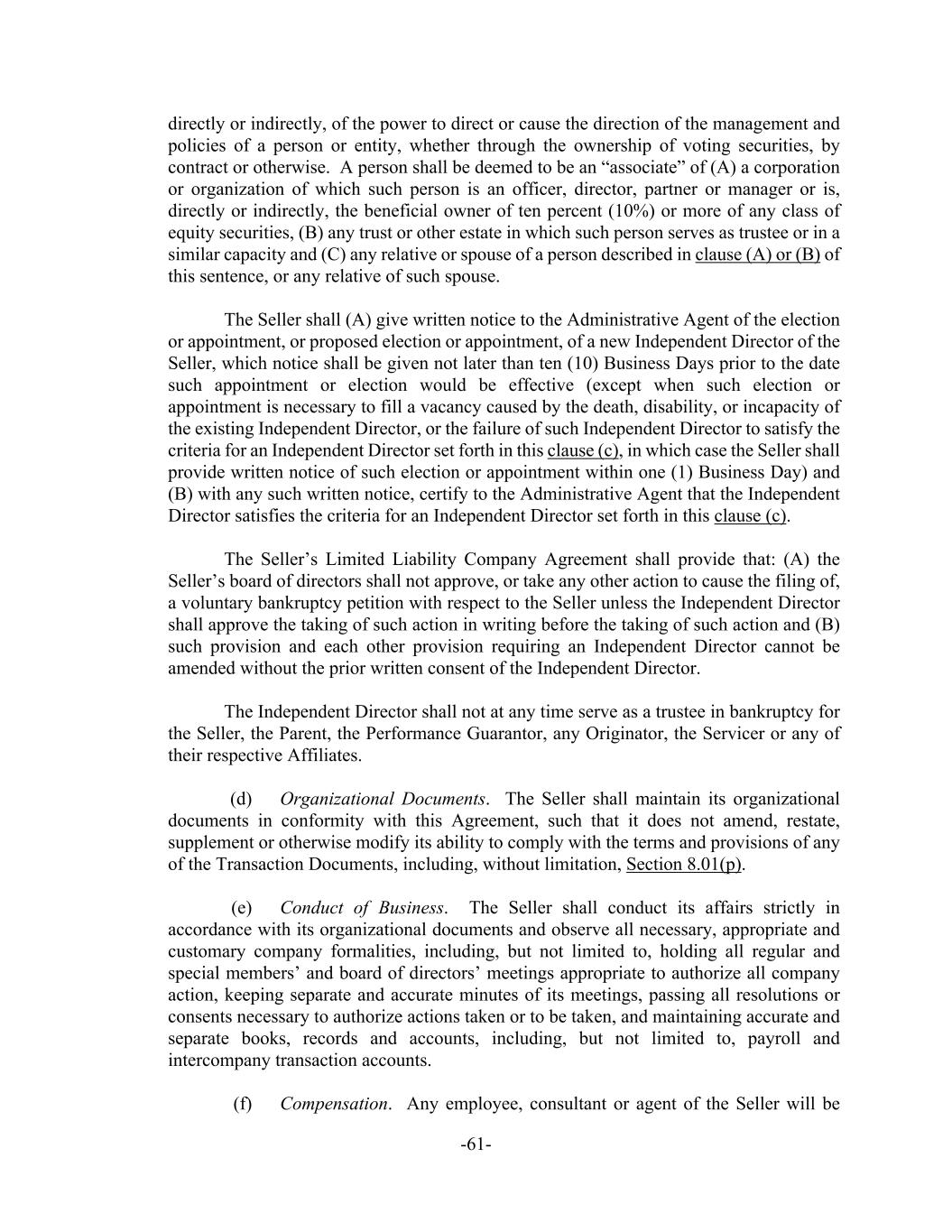-61- directly or indirectly, of the power to direct or cause the direction of the management and policies of a person or entity, whether through the ownership of voting securities, by contract or otherwise. A person shall be deemed to be an “associate” of (A) a corporation or organization of which such person is an officer, director, partner or manager or is, directly or indirectly, the beneficial owner of ten percent (10%) or more of any class of equity securities, (B) any trust or other estate in which such person serves as trustee or in a similar capacity and (C) any relative or spouse of a person described in clause (A) or (B) of this sentence, or any relative of such spouse. The Seller shall (A) give written notice to the Administrative Agent of the election or appointment, or proposed election or appointment, of a new Independent Director of the Seller, which notice shall be given not later than ten (10) Business Days prior to the date such appointment or election would be effective (except when such election or appointment is necessary to fill a vacancy caused by the death, disability, or incapacity of the existing Independent Director, or the failure of such Independent Director to satisfy the criteria for an Independent Director set forth in this clause (c), in which case the Seller shall provide written notice of such election or appointment within one (1) Business Day) and (B) with any such written notice, certify to the Administrative Agent that the Independent Director satisfies the criteria for an Independent Director set forth in this clause (c). The Seller’s Limited Liability Company Agreement shall provide that: (A) the Seller’s board of directors shall not approve, or take any other action to cause the filing of, a voluntary bankruptcy petition with respect to the Seller unless the Independent Director shall approve the taking of such action in writing before the taking of such action and (B) such provision and each other provision requiring an Independent Director cannot be amended without the prior written consent of the Independent Director. The Independent Director shall not at any time serve as a trustee in bankruptcy for the Seller, the Parent, the Performance Guarantor, any Originator, the Servicer or any of their respective Affiliates. (d) Organizational Documents. The Seller shall maintain its organizational documents in conformity with this Agreement, such that it does not amend, restate, supplement or otherwise modify its ability to comply with the terms and provisions of any of the Transaction Documents, including, without limitation, Section 8.01(p). (e) Conduct of Business. The Seller shall conduct its affairs strictly in accordance with its organizational documents and observe all necessary, appropriate and customary company formalities, including, but not limited to, holding all regular and special members’ and board of directors’ meetings appropriate to authorize all company action, keeping separate and accurate minutes of its meetings, passing all resolutions or consents necessary to authorize actions taken or to be taken, and maintaining accurate and separate books, records and accounts, including, but not limited to, payroll and intercompany transaction accounts. (f) Compensation. Any employee, consultant or agent of the Seller will be