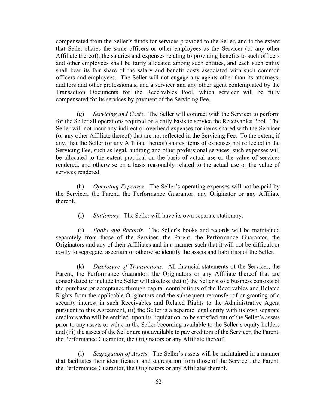 -62- compensated from the Seller’s funds for services provided to the Seller, and to the extent that Seller shares the same officers or other employees as the Servicer (or any other Affiliate thereof), the salaries and expenses relating to providing benefits to such officers and other employees shall be fairly allocated among such entities, and each such entity shall bear its fair share of the salary and benefit costs associated with such common officers and employees. The Seller will not engage any agents other than its attorneys, auditors and other professionals, and a servicer and any other agent contemplated by the Transaction Documents for the Receivables Pool, which servicer will be fully compensated for its services by payment of the Servicing Fee. (g) Servicing and Costs. The Seller will contract with the Servicer to perform for the Seller all operations required on a daily basis to service the Receivables Pool. The Seller will not incur any indirect or overhead expenses for items shared with the Servicer (or any other Affiliate thereof) that are not reflected in the Servicing Fee. To the extent, if any, that the Seller (or any Affiliate thereof) shares items of expenses not reflected in the Servicing Fee, such as legal, auditing and other professional services, such expenses will be allocated to the extent practical on the basis of actual use or the value of services rendered, and otherwise on a basis reasonably related to the actual use or the value of services rendered. (h) Operating Expenses. The Seller’s operating expenses will not be paid by the Servicer, the Parent, the Performance Guarantor, any Originator or any Affiliate thereof. (i) Stationary. The Seller will have its own separate stationary. (j) Books and Records. The Seller’s books and records will be maintained separately from those of the Servicer, the Parent, the Performance Guarantor, the Originators and any of their Affiliates and in a manner such that it will not be difficult or costly to segregate, ascertain or otherwise identify the assets and liabilities of the Seller. (k) Disclosure of Transactions. All financial statements of the Servicer, the Parent, the Performance Guarantor, the Originators or any Affiliate thereof that are consolidated to include the Seller will disclose that (i) the Seller’s sole business consists of the purchase or acceptance through capital contributions of the Receivables and Related Rights from the applicable Originators and the subsequent retransfer of or granting of a security interest in such Receivables and Related Rights to the Administrative Agent pursuant to this Agreement, (ii) the Seller is a separate legal entity with its own separate creditors who will be entitled, upon its liquidation, to be satisfied out of the Seller’s assets prior to any assets or value in the Seller becoming available to the Seller’s equity holders and (iii) the assets of the Seller are not available to pay creditors of the Servicer, the Parent, the Performance Guarantor, the Originators or any Affiliate thereof. (l) Segregation of Assets. The Seller’s assets will be maintained in a manner that facilitates their identification and segregation from those of the Servicer, the Parent, the Performance Guarantor, the Originators or any Affiliates thereof.