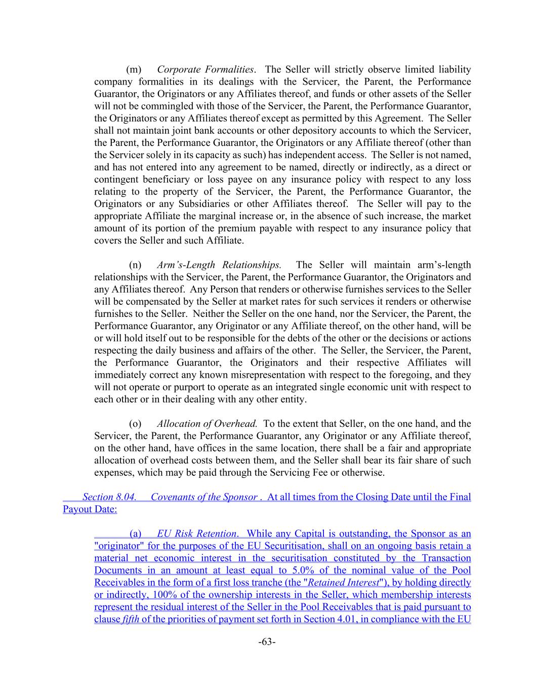 -63- (m) Corporate Formalities. The Seller will strictly observe limited liability company formalities in its dealings with the Servicer, the Parent, the Performance Guarantor, the Originators or any Affiliates thereof, and funds or other assets of the Seller will not be commingled with those of the Servicer, the Parent, the Performance Guarantor, the Originators or any Affiliates thereof except as permitted by this Agreement. The Seller shall not maintain joint bank accounts or other depository accounts to which the Servicer, the Parent, the Performance Guarantor, the Originators or any Affiliate thereof (other than the Servicer solely in its capacity as such) has independent access. The Seller is not named, and has not entered into any agreement to be named, directly or indirectly, as a direct or contingent beneficiary or loss payee on any insurance policy with respect to any loss relating to the property of the Servicer, the Parent, the Performance Guarantor, the Originators or any Subsidiaries or other Affiliates thereof. The Seller will pay to the appropriate Affiliate the marginal increase or, in the absence of such increase, the market amount of its portion of the premium payable with respect to any insurance policy that covers the Seller and such Affiliate. (n) Arm’s-Length Relationships. The Seller will maintain arm’s-length relationships with the Servicer, the Parent, the Performance Guarantor, the Originators and any Affiliates thereof. Any Person that renders or otherwise furnishes services to the Seller will be compensated by the Seller at market rates for such services it renders or otherwise furnishes to the Seller. Neither the Seller on the one hand, nor the Servicer, the Parent, the Performance Guarantor, any Originator or any Affiliate thereof, on the other hand, will be or will hold itself out to be responsible for the debts of the other or the decisions or actions respecting the daily business and affairs of the other. The Seller, the Servicer, the Parent, the Performance Guarantor, the Originators and their respective Affiliates will immediately correct any known misrepresentation with respect to the foregoing, and they will not operate or purport to operate as an integrated single economic unit with respect to each other or in their dealing with any other entity. (o) Allocation of Overhead. To the extent that Seller, on the one hand, and the Servicer, the Parent, the Performance Guarantor, any Originator or any Affiliate thereof, on the other hand, have offices in the same location, there shall be a fair and appropriate allocation of overhead costs between them, and the Seller shall bear its fair share of such expenses, which may be paid through the Servicing Fee or otherwise. Section 8.04. Covenants of the Sponsor . At all times from the Closing Date until the Final Payout Date: (a) EU Risk Retention. While any Capital is outstanding, the Sponsor as an "originator" for the purposes of the EU Securitisation, shall on an ongoing basis retain a material net economic interest in the securitisation constituted by the Transaction Documents in an amount at least equal to 5.0% of the nominal value of the Pool Receivables in the form of a first loss tranche (the "Retained Interest"), by holding directly or indirectly, 100% of the ownership interests in the Seller, which membership interests represent the residual interest of the Seller in the Pool Receivables that is paid pursuant to clause fifth of the priorities of payment set forth in Section 4.01, in compliance with the EU