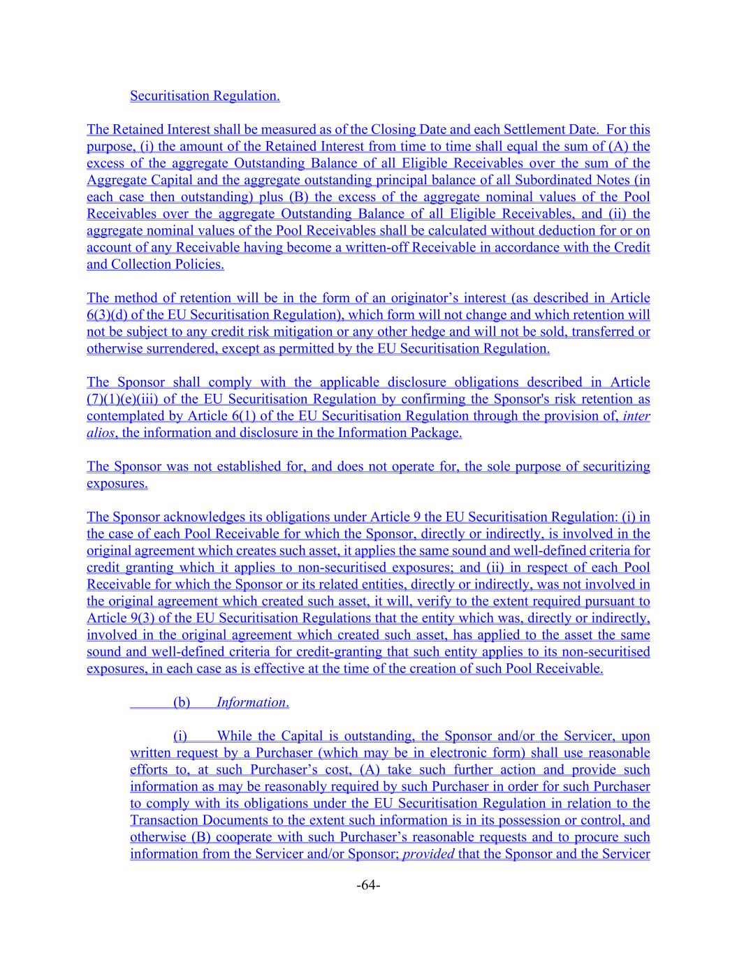 -64- Securitisation Regulation. The Retained Interest shall be measured as of the Closing Date and each Settlement Date. For this purpose, (i) the amount of the Retained Interest from time to time shall equal the sum of (A) the excess of the aggregate Outstanding Balance of all Eligible Receivables over the sum of the Aggregate Capital and the aggregate outstanding principal balance of all Subordinated Notes (in each case then outstanding) plus (B) the excess of the aggregate nominal values of the Pool Receivables over the aggregate Outstanding Balance of all Eligible Receivables, and (ii) the aggregate nominal values of the Pool Receivables shall be calculated without deduction for or on account of any Receivable having become a written-off Receivable in accordance with the Credit and Collection Policies. The method of retention will be in the form of an originator’s interest (as described in Article 6(3)(d) of the EU Securitisation Regulation), which form will not change and which retention will not be subject to any credit risk mitigation or any other hedge and will not be sold, transferred or otherwise surrendered, except as permitted by the EU Securitisation Regulation. The Sponsor shall comply with the applicable disclosure obligations described in Article (7)(1)(e)(iii) of the EU Securitisation Regulation by confirming the Sponsor's risk retention as contemplated by Article 6(1) of the EU Securitisation Regulation through the provision of, inter alios, the information and disclosure in the Information Package. The Sponsor was not established for, and does not operate for, the sole purpose of securitizing exposures. The Sponsor acknowledges its obligations under Article 9 the EU Securitisation Regulation: (i) in the case of each Pool Receivable for which the Sponsor, directly or indirectly, is involved in the original agreement which creates such asset, it applies the same sound and well-defined criteria for credit granting which it applies to non-securitised exposures; and (ii) in respect of each Pool Receivable for which the Sponsor or its related entities, directly or indirectly, was not involved in the original agreement which created such asset, it will, verify to the extent required pursuant to Article 9(3) of the EU Securitisation Regulations that the entity which was, directly or indirectly, involved in the original agreement which created such asset, has applied to the asset the same sound and well-defined criteria for credit-granting that such entity applies to its non-securitised exposures, in each case as is effective at the time of the creation of such Pool Receivable. (b) Information. (i) While the Capital is outstanding, the Sponsor and/or the Servicer, upon written request by a Purchaser (which may be in electronic form) shall use reasonable efforts to, at such Purchaser’s cost, (A) take such further action and provide such information as may be reasonably required by such Purchaser in order for such Purchaser to comply with its obligations under the EU Securitisation Regulation in relation to the Transaction Documents to the extent such information is in its possession or control, and otherwise (B) cooperate with such Purchaser’s reasonable requests and to procure such information from the Servicer and/or Sponsor; provided that the Sponsor and the Servicer