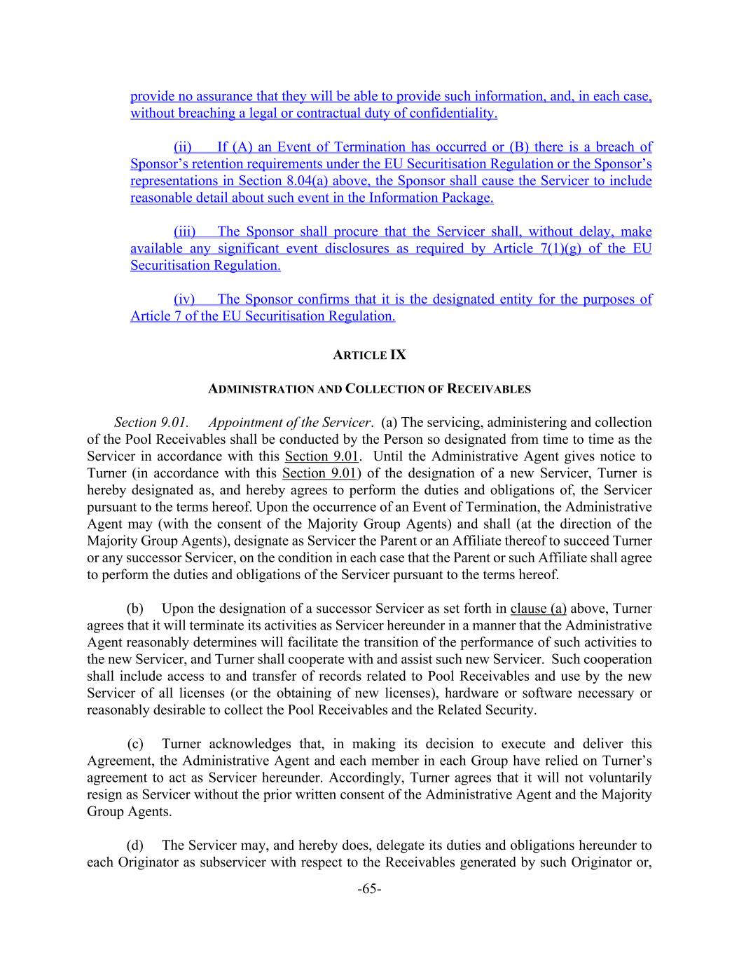-65- provide no assurance that they will be able to provide such information, and, in each case, without breaching a legal or contractual duty of confidentiality. (ii) If (A) an Event of Termination has occurred or (B) there is a breach of Sponsor’s retention requirements under the EU Securitisation Regulation or the Sponsor’s representations in Section 8.04(a) above, the Sponsor shall cause the Servicer to include reasonable detail about such event in the Information Package. (iii) The Sponsor shall procure that the Servicer shall, without delay, make available any significant event disclosures as required by Article 7(1)(g) of the EU Securitisation Regulation. (iv) The Sponsor confirms that it is the designated entity for the purposes of Article 7 of the EU Securitisation Regulation. ARTICLE IX ADMINISTRATION AND COLLECTION OF RECEIVABLES Section 9.01. Appointment of the Servicer. (a) The servicing, administering and collection of the Pool Receivables shall be conducted by the Person so designated from time to time as the Servicer in accordance with this Section 9.01. Until the Administrative Agent gives notice to Turner (in accordance with this Section 9.01) of the designation of a new Servicer, Turner is hereby designated as, and hereby agrees to perform the duties and obligations of, the Servicer pursuant to the terms hereof. Upon the occurrence of an Event of Termination, the Administrative Agent may (with the consent of the Majority Group Agents) and shall (at the direction of the Majority Group Agents), designate as Servicer the Parent or an Affiliate thereof to succeed Turner or any successor Servicer, on the condition in each case that the Parent or such Affiliate shall agree to perform the duties and obligations of the Servicer pursuant to the terms hereof. (b) Upon the designation of a successor Servicer as set forth in clause (a) above, Turner agrees that it will terminate its activities as Servicer hereunder in a manner that the Administrative Agent reasonably determines will facilitate the transition of the performance of such activities to the new Servicer, and Turner shall cooperate with and assist such new Servicer. Such cooperation shall include access to and transfer of records related to Pool Receivables and use by the new Servicer of all licenses (or the obtaining of new licenses), hardware or software necessary or reasonably desirable to collect the Pool Receivables and the Related Security. (c) Turner acknowledges that, in making its decision to execute and deliver this Agreement, the Administrative Agent and each member in each Group have relied on Turner’s agreement to act as Servicer hereunder. Accordingly, Turner agrees that it will not voluntarily resign as Servicer without the prior written consent of the Administrative Agent and the Majority Group Agents. (d) The Servicer may, and hereby does, delegate its duties and obligations hereunder to each Originator as subservicer with respect to the Receivables generated by such Originator or,