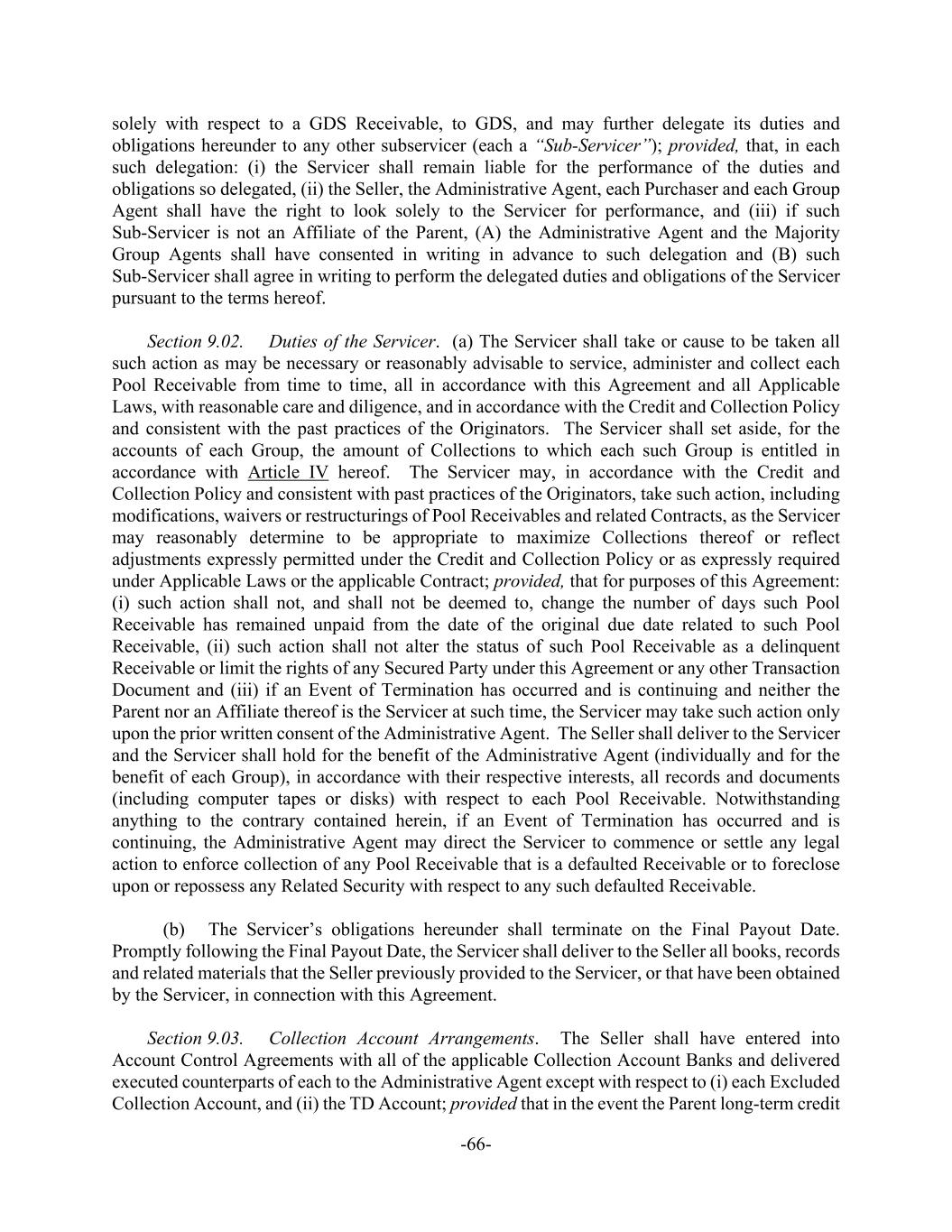 -66- solely with respect to a GDS Receivable, to GDS, and may further delegate its duties and obligations hereunder to any other subservicer (each a “Sub-Servicer”); provided, that, in each such delegation: (i) the Servicer shall remain liable for the performance of the duties and obligations so delegated, (ii) the Seller, the Administrative Agent, each Purchaser and each Group Agent shall have the right to look solely to the Servicer for performance, and (iii) if such Sub-Servicer is not an Affiliate of the Parent, (A) the Administrative Agent and the Majority Group Agents shall have consented in writing in advance to such delegation and (B) such Sub-Servicer shall agree in writing to perform the delegated duties and obligations of the Servicer pursuant to the terms hereof. Section 9.02. Duties of the Servicer. (a) The Servicer shall take or cause to be taken all such action as may be necessary or reasonably advisable to service, administer and collect each Pool Receivable from time to time, all in accordance with this Agreement and all Applicable Laws, with reasonable care and diligence, and in accordance with the Credit and Collection Policy and consistent with the past practices of the Originators. The Servicer shall set aside, for the accounts of each Group, the amount of Collections to which each such Group is entitled in accordance with Article IV hereof. The Servicer may, in accordance with the Credit and Collection Policy and consistent with past practices of the Originators, take such action, including modifications, waivers or restructurings of Pool Receivables and related Contracts, as the Servicer may reasonably determine to be appropriate to maximize Collections thereof or reflect adjustments expressly permitted under the Credit and Collection Policy or as expressly required under Applicable Laws or the applicable Contract; provided, that for purposes of this Agreement: (i) such action shall not, and shall not be deemed to, change the number of days such Pool Receivable has remained unpaid from the date of the original due date related to such Pool Receivable, (ii) such action shall not alter the status of such Pool Receivable as a delinquent Receivable or limit the rights of any Secured Party under this Agreement or any other Transaction Document and (iii) if an Event of Termination has occurred and is continuing and neither the Parent nor an Affiliate thereof is the Servicer at such time, the Servicer may take such action only upon the prior written consent of the Administrative Agent. The Seller shall deliver to the Servicer and the Servicer shall hold for the benefit of the Administrative Agent (individually and for the benefit of each Group), in accordance with their respective interests, all records and documents (including computer tapes or disks) with respect to each Pool Receivable. Notwithstanding anything to the contrary contained herein, if an Event of Termination has occurred and is continuing, the Administrative Agent may direct the Servicer to commence or settle any legal action to enforce collection of any Pool Receivable that is a defaulted Receivable or to foreclose upon or repossess any Related Security with respect to any such defaulted Receivable. (b) The Servicer’s obligations hereunder shall terminate on the Final Payout Date. Promptly following the Final Payout Date, the Servicer shall deliver to the Seller all books, records and related materials that the Seller previously provided to the Servicer, or that have been obtained by the Servicer, in connection with this Agreement. Section 9.03. Collection Account Arrangements. The Seller shall have entered into Account Control Agreements with all of the applicable Collection Account Banks and delivered executed counterparts of each to the Administrative Agent except with respect to (i) each Excluded Collection Account, and (ii) the TD Account; provided that in the event the Parent long-term credit