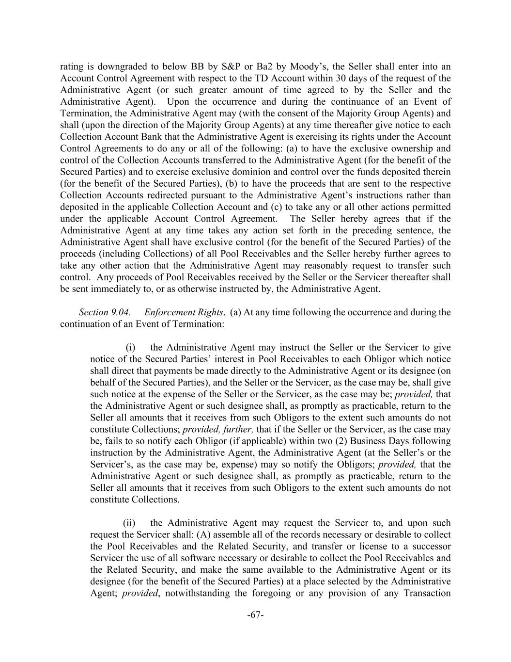 -67- rating is downgraded to below BB by S&P or Ba2 by Moody’s, the Seller shall enter into an Account Control Agreement with respect to the TD Account within 30 days of the request of the Administrative Agent (or such greater amount of time agreed to by the Seller and the Administrative Agent). Upon the occurrence and during the continuance of an Event of Termination, the Administrative Agent may (with the consent of the Majority Group Agents) and shall (upon the direction of the Majority Group Agents) at any time thereafter give notice to each Collection Account Bank that the Administrative Agent is exercising its rights under the Account Control Agreements to do any or all of the following: (a) to have the exclusive ownership and control of the Collection Accounts transferred to the Administrative Agent (for the benefit of the Secured Parties) and to exercise exclusive dominion and control over the funds deposited therein (for the benefit of the Secured Parties), (b) to have the proceeds that are sent to the respective Collection Accounts redirected pursuant to the Administrative Agent’s instructions rather than deposited in the applicable Collection Account and (c) to take any or all other actions permitted under the applicable Account Control Agreement. The Seller hereby agrees that if the Administrative Agent at any time takes any action set forth in the preceding sentence, the Administrative Agent shall have exclusive control (for the benefit of the Secured Parties) of the proceeds (including Collections) of all Pool Receivables and the Seller hereby further agrees to take any other action that the Administrative Agent may reasonably request to transfer such control. Any proceeds of Pool Receivables received by the Seller or the Servicer thereafter shall be sent immediately to, or as otherwise instructed by, the Administrative Agent. Section 9.04. Enforcement Rights. (a) At any time following the occurrence and during the continuation of an Event of Termination: (i) the Administrative Agent may instruct the Seller or the Servicer to give notice of the Secured Parties’ interest in Pool Receivables to each Obligor which notice shall direct that payments be made directly to the Administrative Agent or its designee (on behalf of the Secured Parties), and the Seller or the Servicer, as the case may be, shall give such notice at the expense of the Seller or the Servicer, as the case may be; provided, that the Administrative Agent or such designee shall, as promptly as practicable, return to the Seller all amounts that it receives from such Obligors to the extent such amounts do not constitute Collections; provided, further, that if the Seller or the Servicer, as the case may be, fails to so notify each Obligor (if applicable) within two (2) Business Days following instruction by the Administrative Agent, the Administrative Agent (at the Seller’s or the Servicer’s, as the case may be, expense) may so notify the Obligors; provided, that the Administrative Agent or such designee shall, as promptly as practicable, return to the Seller all amounts that it receives from such Obligors to the extent such amounts do not constitute Collections. (ii) the Administrative Agent may request the Servicer to, and upon such request the Servicer shall: (A) assemble all of the records necessary or desirable to collect the Pool Receivables and the Related Security, and transfer or license to a successor Servicer the use of all software necessary or desirable to collect the Pool Receivables and the Related Security, and make the same available to the Administrative Agent or its designee (for the benefit of the Secured Parties) at a place selected by the Administrative Agent; provided, notwithstanding the foregoing or any provision of any Transaction