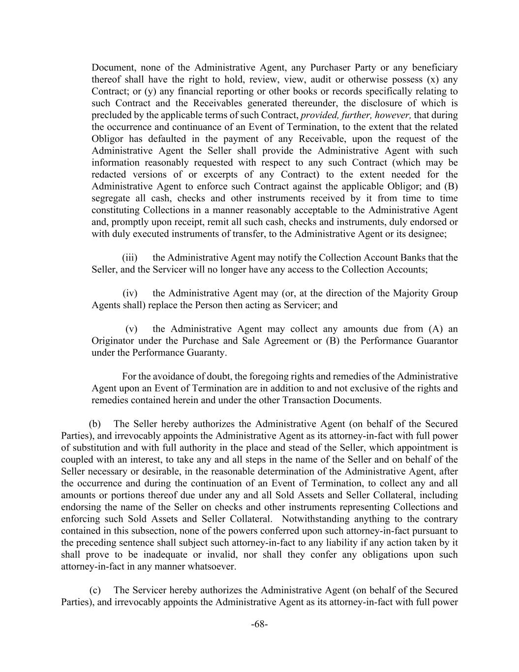-68- Document, none of the Administrative Agent, any Purchaser Party or any beneficiary thereof shall have the right to hold, review, view, audit or otherwise possess (x) any Contract; or (y) any financial reporting or other books or records specifically relating to such Contract and the Receivables generated thereunder, the disclosure of which is precluded by the applicable terms of such Contract, provided, further, however, that during the occurrence and continuance of an Event of Termination, to the extent that the related Obligor has defaulted in the payment of any Receivable, upon the request of the Administrative Agent the Seller shall provide the Administrative Agent with such information reasonably requested with respect to any such Contract (which may be redacted versions of or excerpts of any Contract) to the extent needed for the Administrative Agent to enforce such Contract against the applicable Obligor; and (B) segregate all cash, checks and other instruments received by it from time to time constituting Collections in a manner reasonably acceptable to the Administrative Agent and, promptly upon receipt, remit all such cash, checks and instruments, duly endorsed or with duly executed instruments of transfer, to the Administrative Agent or its designee; (iii) the Administrative Agent may notify the Collection Account Banks that the Seller, and the Servicer will no longer have any access to the Collection Accounts; (iv) the Administrative Agent may (or, at the direction of the Majority Group Agents shall) replace the Person then acting as Servicer; and (v) the Administrative Agent may collect any amounts due from (A) an Originator under the Purchase and Sale Agreement or (B) the Performance Guarantor under the Performance Guaranty. For the avoidance of doubt, the foregoing rights and remedies of the Administrative Agent upon an Event of Termination are in addition to and not exclusive of the rights and remedies contained herein and under the other Transaction Documents. (b) The Seller hereby authorizes the Administrative Agent (on behalf of the Secured Parties), and irrevocably appoints the Administrative Agent as its attorney-in-fact with full power of substitution and with full authority in the place and stead of the Seller, which appointment is coupled with an interest, to take any and all steps in the name of the Seller and on behalf of the Seller necessary or desirable, in the reasonable determination of the Administrative Agent, after the occurrence and during the continuation of an Event of Termination, to collect any and all amounts or portions thereof due under any and all Sold Assets and Seller Collateral, including endorsing the name of the Seller on checks and other instruments representing Collections and enforcing such Sold Assets and Seller Collateral. Notwithstanding anything to the contrary contained in this subsection, none of the powers conferred upon such attorney-in-fact pursuant to the preceding sentence shall subject such attorney-in-fact to any liability if any action taken by it shall prove to be inadequate or invalid, nor shall they confer any obligations upon such attorney-in-fact in any manner whatsoever. (c) The Servicer hereby authorizes the Administrative Agent (on behalf of the Secured Parties), and irrevocably appoints the Administrative Agent as its attorney-in-fact with full power