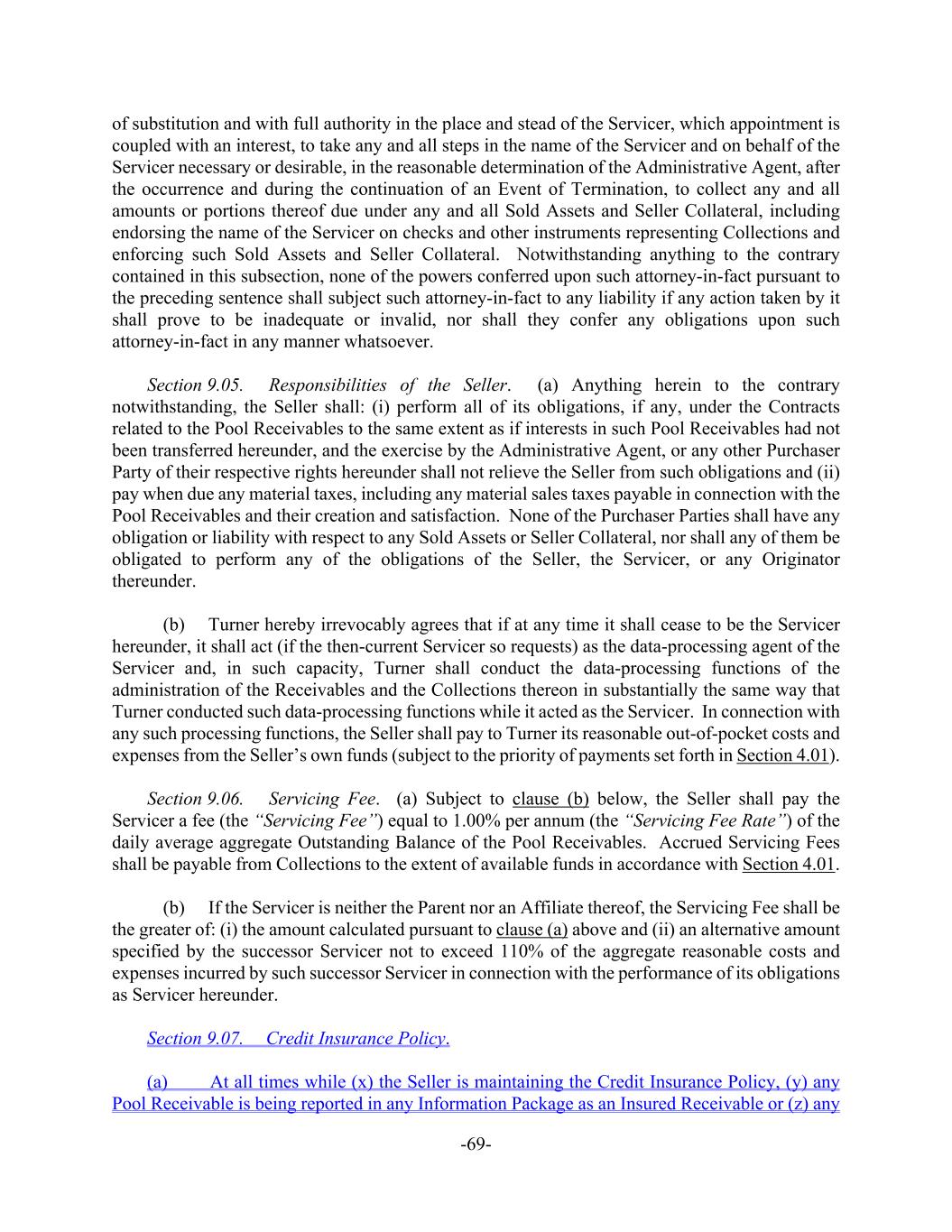 -69- of substitution and with full authority in the place and stead of the Servicer, which appointment is coupled with an interest, to take any and all steps in the name of the Servicer and on behalf of the Servicer necessary or desirable, in the reasonable determination of the Administrative Agent, after the occurrence and during the continuation of an Event of Termination, to collect any and all amounts or portions thereof due under any and all Sold Assets and Seller Collateral, including endorsing the name of the Servicer on checks and other instruments representing Collections and enforcing such Sold Assets and Seller Collateral. Notwithstanding anything to the contrary contained in this subsection, none of the powers conferred upon such attorney-in-fact pursuant to the preceding sentence shall subject such attorney-in-fact to any liability if any action taken by it shall prove to be inadequate or invalid, nor shall they confer any obligations upon such attorney-in-fact in any manner whatsoever. Section 9.05. Responsibilities of the Seller. (a) Anything herein to the contrary notwithstanding, the Seller shall: (i) perform all of its obligations, if any, under the Contracts related to the Pool Receivables to the same extent as if interests in such Pool Receivables had not been transferred hereunder, and the exercise by the Administrative Agent, or any other Purchaser Party of their respective rights hereunder shall not relieve the Seller from such obligations and (ii) pay when due any material taxes, including any material sales taxes payable in connection with the Pool Receivables and their creation and satisfaction. None of the Purchaser Parties shall have any obligation or liability with respect to any Sold Assets or Seller Collateral, nor shall any of them be obligated to perform any of the obligations of the Seller, the Servicer, or any Originator thereunder. (b) Turner hereby irrevocably agrees that if at any time it shall cease to be the Servicer hereunder, it shall act (if the then-current Servicer so requests) as the data-processing agent of the Servicer and, in such capacity, Turner shall conduct the data-processing functions of the administration of the Receivables and the Collections thereon in substantially the same way that Turner conducted such data-processing functions while it acted as the Servicer. In connection with any such processing functions, the Seller shall pay to Turner its reasonable out-of-pocket costs and expenses from the Seller’s own funds (subject to the priority of payments set forth in Section 4.01). Section 9.06. Servicing Fee. (a) Subject to clause (b) below, the Seller shall pay the Servicer a fee (the “Servicing Fee”) equal to 1.00% per annum (the “Servicing Fee Rate”) of the daily average aggregate Outstanding Balance of the Pool Receivables. Accrued Servicing Fees shall be payable from Collections to the extent of available funds in accordance with Section 4.01. (b) If the Servicer is neither the Parent nor an Affiliate thereof, the Servicing Fee shall be the greater of: (i) the amount calculated pursuant to clause (a) above and (ii) an alternative amount specified by the successor Servicer not to exceed 110% of the aggregate reasonable costs and expenses incurred by such successor Servicer in connection with the performance of its obligations as Servicer hereunder. Section 9.07. Credit Insurance Policy. (a) At all times while (x) the Seller is maintaining the Credit Insurance Policy, (y) any Pool Receivable is being reported in any Information Package as an Insured Receivable or (z) any