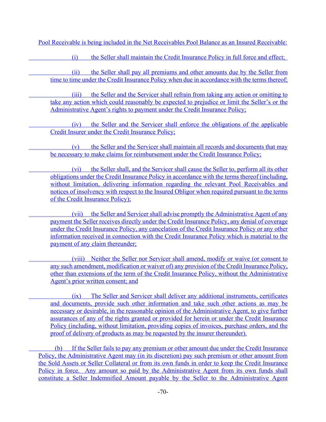 -70- Pool Receivable is being included in the Net Receivables Pool Balance as an Insured Receivable: (i) the Seller shall maintain the Credit Insurance Policy in full force and effect; (ii) the Seller shall pay all premiums and other amounts due by the Seller from time to time under the Credit Insurance Policy when due in accordance with the terms thereof; (iii) the Seller and the Servicer shall refrain from taking any action or omitting to take any action which could reasonably be expected to prejudice or limit the Seller’s or the Administrative Agent’s rights to payment under the Credit Insurance Policy; (iv) the Seller and the Servicer shall enforce the obligations of the applicable Credit Insurer under the Credit Insurance Policy; (v) the Seller and the Servicer shall maintain all records and documents that may be necessary to make claims for reimbursement under the Credit Insurance Policy; (vi) the Seller shall, and the Servicer shall cause the Seller to, perform all its other obligations under the Credit Insurance Policy in accordance with the terms thereof (including, without limitation, delivering information regarding the relevant Pool Receivables and notices of insolvency with respect to the Insured Obligor when required pursuant to the terms of the Credit Insurance Policy); (vii) the Seller and Servicer shall advise promptly the Administrative Agent of any payment the Seller receives directly under the Credit Insurance Policy, any denial of coverage under the Credit Insurance Policy, any cancelation of the Credit Insurance Policy or any other information received in connection with the Credit Insurance Policy which is material to the payment of any claim thereunder; (viii) Neither the Seller nor Servicer shall amend, modify or waive (or consent to any such amendment, modification or waiver of) any provision of the Credit Insurance Policy, other than extensions of the term of the Credit Insurance Policy, without the Administrative Agent’s prior written consent; and (ix) The Seller and Servicer shall deliver any additional instruments, certificates and documents, provide such other information and take such other actions as may be necessary or desirable, in the reasonable opinion of the Administrative Agent, to give further assurances of any of the rights granted or provided for herein or under the Credit Insurance Policy (including, without limitation, providing copies of invoices, purchase orders, and the proof of delivery of products as may be requested by the insurer thereunder). (b) If the Seller fails to pay any premium or other amount due under the Credit Insurance Policy, the Administrative Agent may (in its discretion) pay such premium or other amount from the Sold Assets or Seller Collateral or from its own funds in order to keep the Credit Insurance Policy in force. Any amount so paid by the Administrative Agent from its own funds shall constitute a Seller Indemnified Amount payable by the Seller to the Administrative Agent