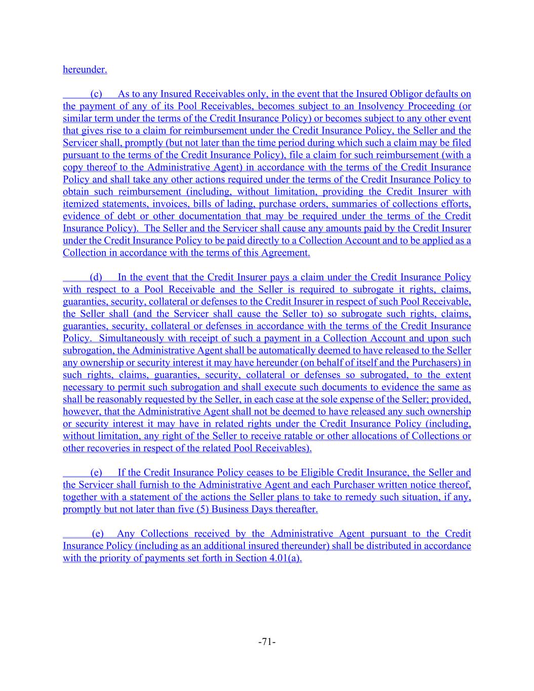 -71- hereunder. (c) As to any Insured Receivables only, in the event that the Insured Obligor defaults on the payment of any of its Pool Receivables, becomes subject to an Insolvency Proceeding (or similar term under the terms of the Credit Insurance Policy) or becomes subject to any other event that gives rise to a claim for reimbursement under the Credit Insurance Policy, the Seller and the Servicer shall, promptly (but not later than the time period during which such a claim may be filed pursuant to the terms of the Credit Insurance Policy), file a claim for such reimbursement (with a copy thereof to the Administrative Agent) in accordance with the terms of the Credit Insurance Policy and shall take any other actions required under the terms of the Credit Insurance Policy to obtain such reimbursement (including, without limitation, providing the Credit Insurer with itemized statements, invoices, bills of lading, purchase orders, summaries of collections efforts, evidence of debt or other documentation that may be required under the terms of the Credit Insurance Policy). The Seller and the Servicer shall cause any amounts paid by the Credit Insurer under the Credit Insurance Policy to be paid directly to a Collection Account and to be applied as a Collection in accordance with the terms of this Agreement. (d) In the event that the Credit Insurer pays a claim under the Credit Insurance Policy with respect to a Pool Receivable and the Seller is required to subrogate it rights, claims, guaranties, security, collateral or defenses to the Credit Insurer in respect of such Pool Receivable, the Seller shall (and the Servicer shall cause the Seller to) so subrogate such rights, claims, guaranties, security, collateral or defenses in accordance with the terms of the Credit Insurance Policy. Simultaneously with receipt of such a payment in a Collection Account and upon such subrogation, the Administrative Agent shall be automatically deemed to have released to the Seller any ownership or security interest it may have hereunder (on behalf of itself and the Purchasers) in such rights, claims, guaranties, security, collateral or defenses so subrogated, to the extent necessary to permit such subrogation and shall execute such documents to evidence the same as shall be reasonably requested by the Seller, in each case at the sole expense of the Seller; provided, however, that the Administrative Agent shall not be deemed to have released any such ownership or security interest it may have in related rights under the Credit Insurance Policy (including, without limitation, any right of the Seller to receive ratable or other allocations of Collections or other recoveries in respect of the related Pool Receivables). (e) If the Credit Insurance Policy ceases to be Eligible Credit Insurance, the Seller and the Servicer shall furnish to the Administrative Agent and each Purchaser written notice thereof, together with a statement of the actions the Seller plans to take to remedy such situation, if any, promptly but not later than five (5) Business Days thereafter. (e) Any Collections received by the Administrative Agent pursuant to the Credit Insurance Policy (including as an additional insured thereunder) shall be distributed in accordance with the priority of payments set forth in Section 4.01(a).