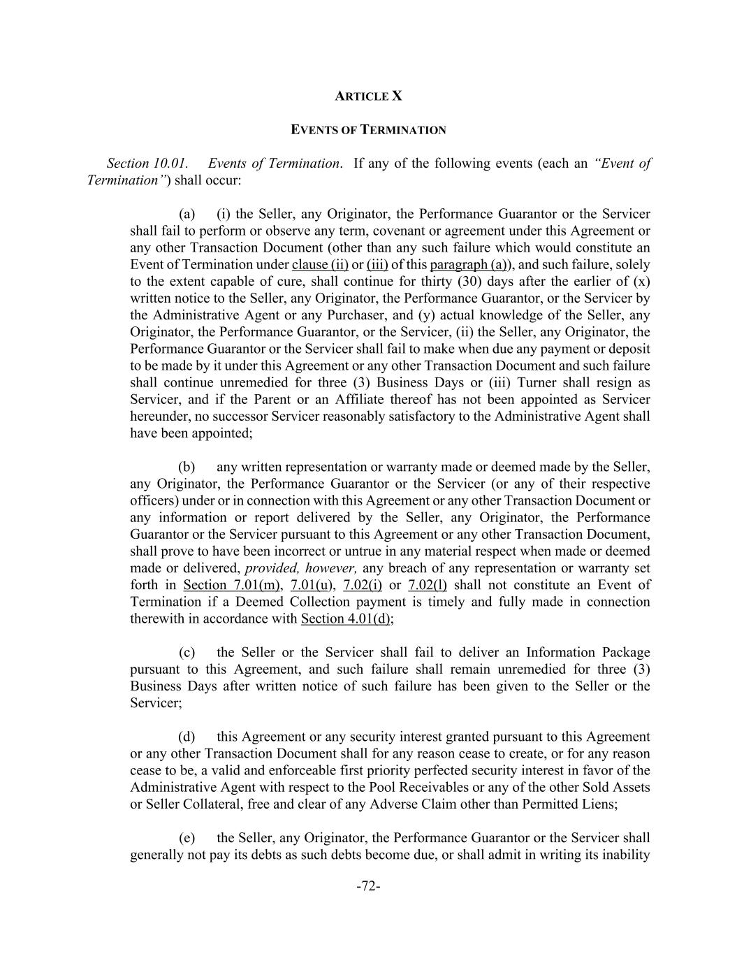 -72- ARTICLE X EVENTS OF TERMINATION Section 10.01. Events of Termination. If any of the following events (each an “Event of Termination”) shall occur: (a) (i) the Seller, any Originator, the Performance Guarantor or the Servicer shall fail to perform or observe any term, covenant or agreement under this Agreement or any other Transaction Document (other than any such failure which would constitute an Event of Termination under clause (ii) or (iii) of this paragraph (a)), and such failure, solely to the extent capable of cure, shall continue for thirty (30) days after the earlier of (x) written notice to the Seller, any Originator, the Performance Guarantor, or the Servicer by the Administrative Agent or any Purchaser, and (y) actual knowledge of the Seller, any Originator, the Performance Guarantor, or the Servicer, (ii) the Seller, any Originator, the Performance Guarantor or the Servicer shall fail to make when due any payment or deposit to be made by it under this Agreement or any other Transaction Document and such failure shall continue unremedied for three (3) Business Days or (iii) Turner shall resign as Servicer, and if the Parent or an Affiliate thereof has not been appointed as Servicer hereunder, no successor Servicer reasonably satisfactory to the Administrative Agent shall have been appointed; (b) any written representation or warranty made or deemed made by the Seller, any Originator, the Performance Guarantor or the Servicer (or any of their respective officers) under or in connection with this Agreement or any other Transaction Document or any information or report delivered by the Seller, any Originator, the Performance Guarantor or the Servicer pursuant to this Agreement or any other Transaction Document, shall prove to have been incorrect or untrue in any material respect when made or deemed made or delivered, provided, however, any breach of any representation or warranty set forth in Section 7.01(m), 7.01(u), 7.02(i) or 7.02(l) shall not constitute an Event of Termination if a Deemed Collection payment is timely and fully made in connection therewith in accordance with Section 4.01(d); (c) the Seller or the Servicer shall fail to deliver an Information Package pursuant to this Agreement, and such failure shall remain unremedied for three (3) Business Days after written notice of such failure has been given to the Seller or the Servicer; (d) this Agreement or any security interest granted pursuant to this Agreement or any other Transaction Document shall for any reason cease to create, or for any reason cease to be, a valid and enforceable first priority perfected security interest in favor of the Administrative Agent with respect to the Pool Receivables or any of the other Sold Assets or Seller Collateral, free and clear of any Adverse Claim other than Permitted Liens; (e) the Seller, any Originator, the Performance Guarantor or the Servicer shall generally not pay its debts as such debts become due, or shall admit in writing its inability