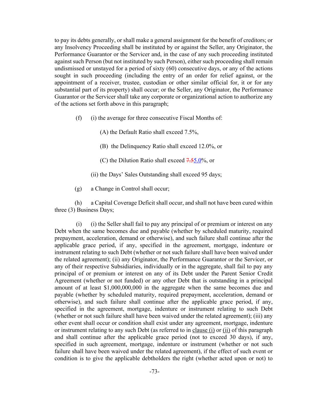 -73- to pay its debts generally, or shall make a general assignment for the benefit of creditors; or any Insolvency Proceeding shall be instituted by or against the Seller, any Originator, the Performance Guarantor or the Servicer and, in the case of any such proceeding instituted against such Person (but not instituted by such Person), either such proceeding shall remain undismissed or unstayed for a period of sixty (60) consecutive days, or any of the actions sought in such proceeding (including the entry of an order for relief against, or the appointment of a receiver, trustee, custodian or other similar official for, it or for any substantial part of its property) shall occur; or the Seller, any Originator, the Performance Guarantor or the Servicer shall take any corporate or organizational action to authorize any of the actions set forth above in this paragraph; (f) (i) the average for three consecutive Fiscal Months of: (A) the Default Ratio shall exceed 7.5%, (B) the Delinquency Ratio shall exceed 12.0%, or (C) the Dilution Ratio shall exceed 7.55.0%, or (ii) the Days’ Sales Outstanding shall exceed 95 days; (g) a Change in Control shall occur; (h) a Capital Coverage Deficit shall occur, and shall not have been cured within three (3) Business Days; (i) (i) the Seller shall fail to pay any principal of or premium or interest on any Debt when the same becomes due and payable (whether by scheduled maturity, required prepayment, acceleration, demand or otherwise), and such failure shall continue after the applicable grace period, if any, specified in the agreement, mortgage, indenture or instrument relating to such Debt (whether or not such failure shall have been waived under the related agreement); (ii) any Originator, the Performance Guarantor or the Servicer, or any of their respective Subsidiaries, individually or in the aggregate, shall fail to pay any principal of or premium or interest on any of its Debt under the Parent Senior Credit Agreement (whether or not funded) or any other Debt that is outstanding in a principal amount of at least $1,000,000,000 in the aggregate when the same becomes due and payable (whether by scheduled maturity, required prepayment, acceleration, demand or otherwise), and such failure shall continue after the applicable grace period, if any, specified in the agreement, mortgage, indenture or instrument relating to such Debt (whether or not such failure shall have been waived under the related agreement); (iii) any other event shall occur or condition shall exist under any agreement, mortgage, indenture or instrument relating to any such Debt (as referred to in clause (i) or (ii) of this paragraph and shall continue after the applicable grace period (not to exceed 30 days), if any, specified in such agreement, mortgage, indenture or instrument (whether or not such failure shall have been waived under the related agreement), if the effect of such event or condition is to give the applicable debtholders the right (whether acted upon or not) to