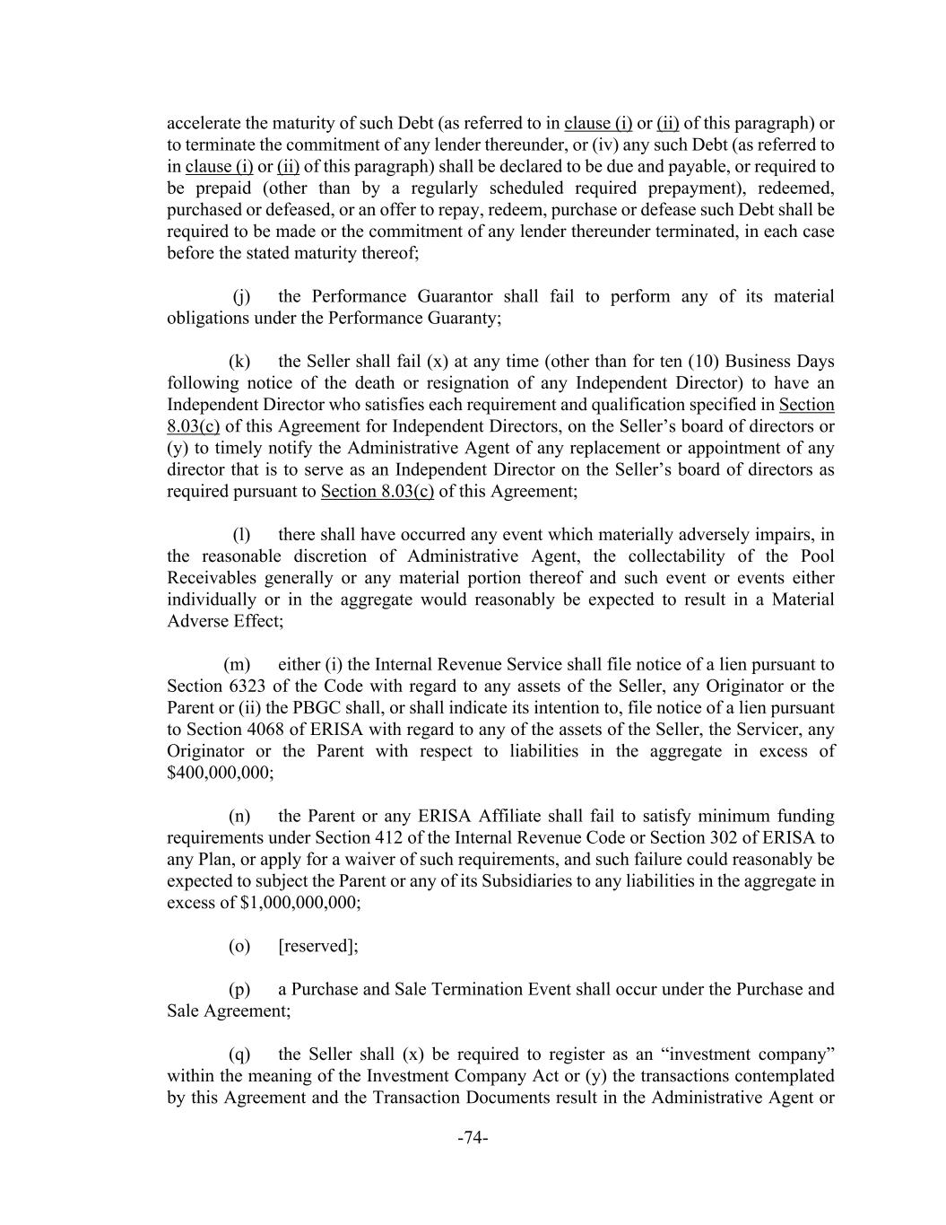 -74- accelerate the maturity of such Debt (as referred to in clause (i) or (ii) of this paragraph) or to terminate the commitment of any lender thereunder, or (iv) any such Debt (as referred to in clause (i) or (ii) of this paragraph) shall be declared to be due and payable, or required to be prepaid (other than by a regularly scheduled required prepayment), redeemed, purchased or defeased, or an offer to repay, redeem, purchase or defease such Debt shall be required to be made or the commitment of any lender thereunder terminated, in each case before the stated maturity thereof; (j) the Performance Guarantor shall fail to perform any of its material obligations under the Performance Guaranty; (k) the Seller shall fail (x) at any time (other than for ten (10) Business Days following notice of the death or resignation of any Independent Director) to have an Independent Director who satisfies each requirement and qualification specified in Section 8.03(c) of this Agreement for Independent Directors, on the Seller’s board of directors or (y) to timely notify the Administrative Agent of any replacement or appointment of any director that is to serve as an Independent Director on the Seller’s board of directors as required pursuant to Section 8.03(c) of this Agreement; (l) there shall have occurred any event which materially adversely impairs, in the reasonable discretion of Administrative Agent, the collectability of the Pool Receivables generally or any material portion thereof and such event or events either individually or in the aggregate would reasonably be expected to result in a Material Adverse Effect; (m) either (i) the Internal Revenue Service shall file notice of a lien pursuant to Section 6323 of the Code with regard to any assets of the Seller, any Originator or the Parent or (ii) the PBGC shall, or shall indicate its intention to, file notice of a lien pursuant to Section 4068 of ERISA with regard to any of the assets of the Seller, the Servicer, any Originator or the Parent with respect to liabilities in the aggregate in excess of $400,000,000; (n) the Parent or any ERISA Affiliate shall fail to satisfy minimum funding requirements under Section 412 of the Internal Revenue Code or Section 302 of ERISA to any Plan, or apply for a waiver of such requirements, and such failure could reasonably be expected to subject the Parent or any of its Subsidiaries to any liabilities in the aggregate in excess of $1,000,000,000; (o) [reserved]; (p) a Purchase and Sale Termination Event shall occur under the Purchase and Sale Agreement; (q) the Seller shall (x) be required to register as an “investment company” within the meaning of the Investment Company Act or (y) the transactions contemplated by this Agreement and the Transaction Documents result in the Administrative Agent or