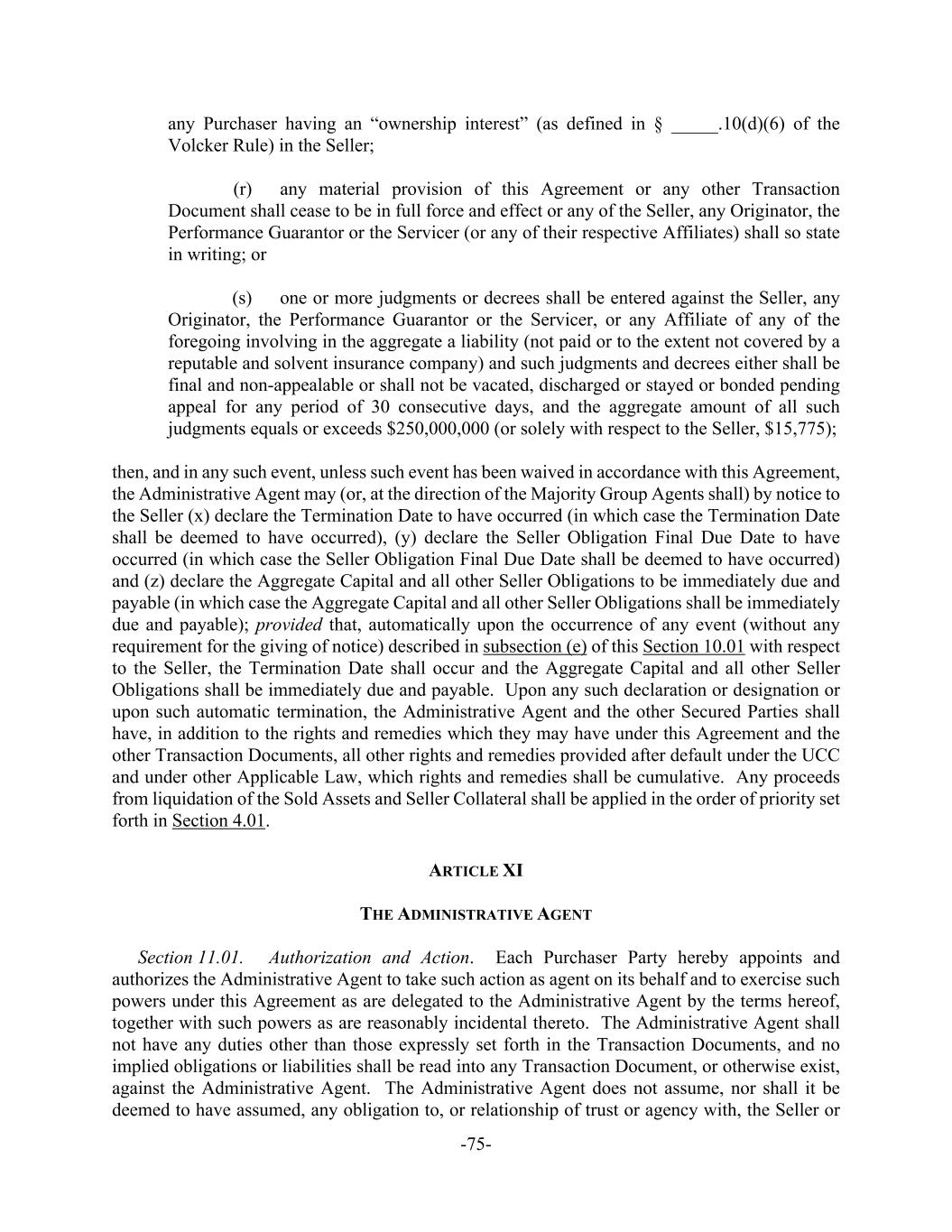 -75- any Purchaser having an “ownership interest” (as defined in § _____.10(d)(6) of the Volcker Rule) in the Seller; (r) any material provision of this Agreement or any other Transaction Document shall cease to be in full force and effect or any of the Seller, any Originator, the Performance Guarantor or the Servicer (or any of their respective Affiliates) shall so state in writing; or (s) one or more judgments or decrees shall be entered against the Seller, any Originator, the Performance Guarantor or the Servicer, or any Affiliate of any of the foregoing involving in the aggregate a liability (not paid or to the extent not covered by a reputable and solvent insurance company) and such judgments and decrees either shall be final and non-appealable or shall not be vacated, discharged or stayed or bonded pending appeal for any period of 30 consecutive days, and the aggregate amount of all such judgments equals or exceeds $250,000,000 (or solely with respect to the Seller, $15,775); then, and in any such event, unless such event has been waived in accordance with this Agreement, the Administrative Agent may (or, at the direction of the Majority Group Agents shall) by notice to the Seller (x) declare the Termination Date to have occurred (in which case the Termination Date shall be deemed to have occurred), (y) declare the Seller Obligation Final Due Date to have occurred (in which case the Seller Obligation Final Due Date shall be deemed to have occurred) and (z) declare the Aggregate Capital and all other Seller Obligations to be immediately due and payable (in which case the Aggregate Capital and all other Seller Obligations shall be immediately due and payable); provided that, automatically upon the occurrence of any event (without any requirement for the giving of notice) described in subsection (e) of this Section 10.01 with respect to the Seller, the Termination Date shall occur and the Aggregate Capital and all other Seller Obligations shall be immediately due and payable. Upon any such declaration or designation or upon such automatic termination, the Administrative Agent and the other Secured Parties shall have, in addition to the rights and remedies which they may have under this Agreement and the other Transaction Documents, all other rights and remedies provided after default under the UCC and under other Applicable Law, which rights and remedies shall be cumulative. Any proceeds from liquidation of the Sold Assets and Seller Collateral shall be applied in the order of priority set forth in Section 4.01. ARTICLE XI THE ADMINISTRATIVE AGENT Section 11.01. Authorization and Action. Each Purchaser Party hereby appoints and authorizes the Administrative Agent to take such action as agent on its behalf and to exercise such powers under this Agreement as are delegated to the Administrative Agent by the terms hereof, together with such powers as are reasonably incidental thereto. The Administrative Agent shall not have any duties other than those expressly set forth in the Transaction Documents, and no implied obligations or liabilities shall be read into any Transaction Document, or otherwise exist, against the Administrative Agent. The Administrative Agent does not assume, nor shall it be deemed to have assumed, any obligation to, or relationship of trust or agency with, the Seller or
