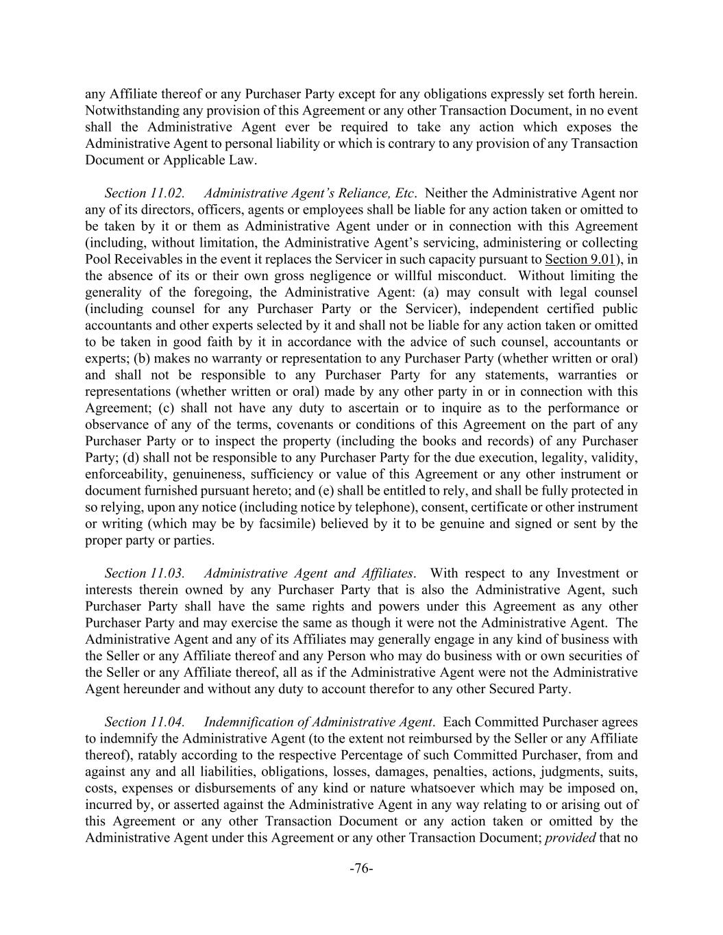 -76- any Affiliate thereof or any Purchaser Party except for any obligations expressly set forth herein. Notwithstanding any provision of this Agreement or any other Transaction Document, in no event shall the Administrative Agent ever be required to take any action which exposes the Administrative Agent to personal liability or which is contrary to any provision of any Transaction Document or Applicable Law. Section 11.02. Administrative Agent’s Reliance, Etc. Neither the Administrative Agent nor any of its directors, officers, agents or employees shall be liable for any action taken or omitted to be taken by it or them as Administrative Agent under or in connection with this Agreement (including, without limitation, the Administrative Agent’s servicing, administering or collecting Pool Receivables in the event it replaces the Servicer in such capacity pursuant to Section 9.01), in the absence of its or their own gross negligence or willful misconduct. Without limiting the generality of the foregoing, the Administrative Agent: (a) may consult with legal counsel (including counsel for any Purchaser Party or the Servicer), independent certified public accountants and other experts selected by it and shall not be liable for any action taken or omitted to be taken in good faith by it in accordance with the advice of such counsel, accountants or experts; (b) makes no warranty or representation to any Purchaser Party (whether written or oral) and shall not be responsible to any Purchaser Party for any statements, warranties or representations (whether written or oral) made by any other party in or in connection with this Agreement; (c) shall not have any duty to ascertain or to inquire as to the performance or observance of any of the terms, covenants or conditions of this Agreement on the part of any Purchaser Party or to inspect the property (including the books and records) of any Purchaser Party; (d) shall not be responsible to any Purchaser Party for the due execution, legality, validity, enforceability, genuineness, sufficiency or value of this Agreement or any other instrument or document furnished pursuant hereto; and (e) shall be entitled to rely, and shall be fully protected in so relying, upon any notice (including notice by telephone), consent, certificate or other instrument or writing (which may be by facsimile) believed by it to be genuine and signed or sent by the proper party or parties. Section 11.03. Administrative Agent and Affiliates. With respect to any Investment or interests therein owned by any Purchaser Party that is also the Administrative Agent, such Purchaser Party shall have the same rights and powers under this Agreement as any other Purchaser Party and may exercise the same as though it were not the Administrative Agent. The Administrative Agent and any of its Affiliates may generally engage in any kind of business with the Seller or any Affiliate thereof and any Person who may do business with or own securities of the Seller or any Affiliate thereof, all as if the Administrative Agent were not the Administrative Agent hereunder and without any duty to account therefor to any other Secured Party. Section 11.04. Indemnification of Administrative Agent. Each Committed Purchaser agrees to indemnify the Administrative Agent (to the extent not reimbursed by the Seller or any Affiliate thereof), ratably according to the respective Percentage of such Committed Purchaser, from and against any and all liabilities, obligations, losses, damages, penalties, actions, judgments, suits, costs, expenses or disbursements of any kind or nature whatsoever which may be imposed on, incurred by, or asserted against the Administrative Agent in any way relating to or arising out of this Agreement or any other Transaction Document or any action taken or omitted by the Administrative Agent under this Agreement or any other Transaction Document; provided that no