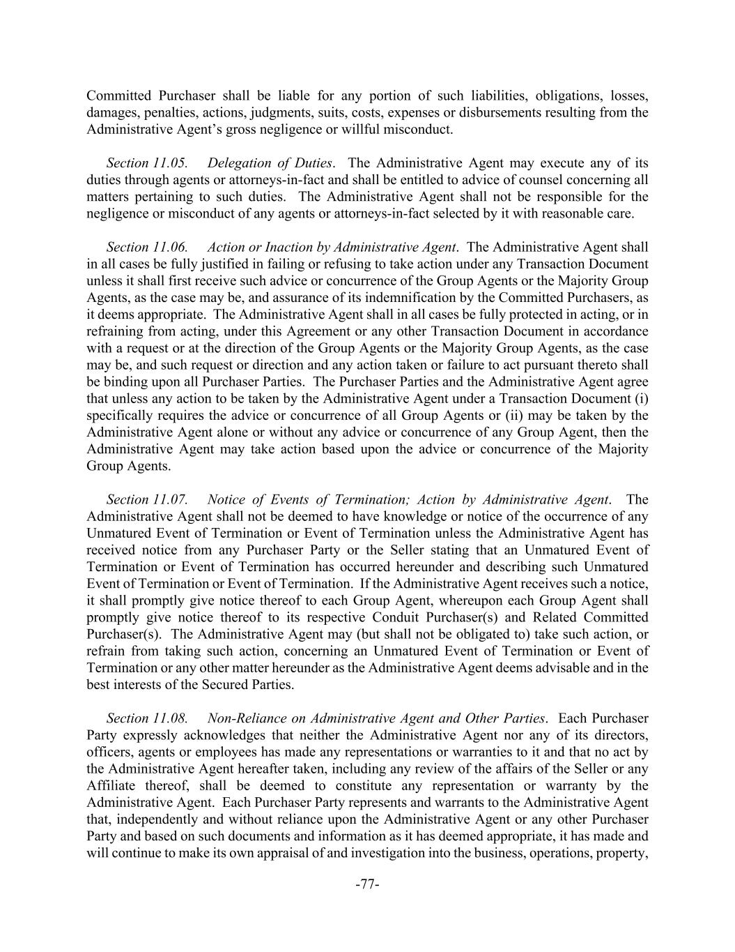 -77- Committed Purchaser shall be liable for any portion of such liabilities, obligations, losses, damages, penalties, actions, judgments, suits, costs, expenses or disbursements resulting from the Administrative Agent’s gross negligence or willful misconduct. Section 11.05. Delegation of Duties. The Administrative Agent may execute any of its duties through agents or attorneys-in-fact and shall be entitled to advice of counsel concerning all matters pertaining to such duties. The Administrative Agent shall not be responsible for the negligence or misconduct of any agents or attorneys-in-fact selected by it with reasonable care. Section 11.06. Action or Inaction by Administrative Agent. The Administrative Agent shall in all cases be fully justified in failing or refusing to take action under any Transaction Document unless it shall first receive such advice or concurrence of the Group Agents or the Majority Group Agents, as the case may be, and assurance of its indemnification by the Committed Purchasers, as it deems appropriate. The Administrative Agent shall in all cases be fully protected in acting, or in refraining from acting, under this Agreement or any other Transaction Document in accordance with a request or at the direction of the Group Agents or the Majority Group Agents, as the case may be, and such request or direction and any action taken or failure to act pursuant thereto shall be binding upon all Purchaser Parties. The Purchaser Parties and the Administrative Agent agree that unless any action to be taken by the Administrative Agent under a Transaction Document (i) specifically requires the advice or concurrence of all Group Agents or (ii) may be taken by the Administrative Agent alone or without any advice or concurrence of any Group Agent, then the Administrative Agent may take action based upon the advice or concurrence of the Majority Group Agents. Section 11.07. Notice of Events of Termination; Action by Administrative Agent. The Administrative Agent shall not be deemed to have knowledge or notice of the occurrence of any Unmatured Event of Termination or Event of Termination unless the Administrative Agent has received notice from any Purchaser Party or the Seller stating that an Unmatured Event of Termination or Event of Termination has occurred hereunder and describing such Unmatured Event of Termination or Event of Termination. If the Administrative Agent receives such a notice, it shall promptly give notice thereof to each Group Agent, whereupon each Group Agent shall promptly give notice thereof to its respective Conduit Purchaser(s) and Related Committed Purchaser(s). The Administrative Agent may (but shall not be obligated to) take such action, or refrain from taking such action, concerning an Unmatured Event of Termination or Event of Termination or any other matter hereunder as the Administrative Agent deems advisable and in the best interests of the Secured Parties. Section 11.08. Non-Reliance on Administrative Agent and Other Parties. Each Purchaser Party expressly acknowledges that neither the Administrative Agent nor any of its directors, officers, agents or employees has made any representations or warranties to it and that no act by the Administrative Agent hereafter taken, including any review of the affairs of the Seller or any Affiliate thereof, shall be deemed to constitute any representation or warranty by the Administrative Agent. Each Purchaser Party represents and warrants to the Administrative Agent that, independently and without reliance upon the Administrative Agent or any other Purchaser Party and based on such documents and information as it has deemed appropriate, it has made and will continue to make its own appraisal of and investigation into the business, operations, property,