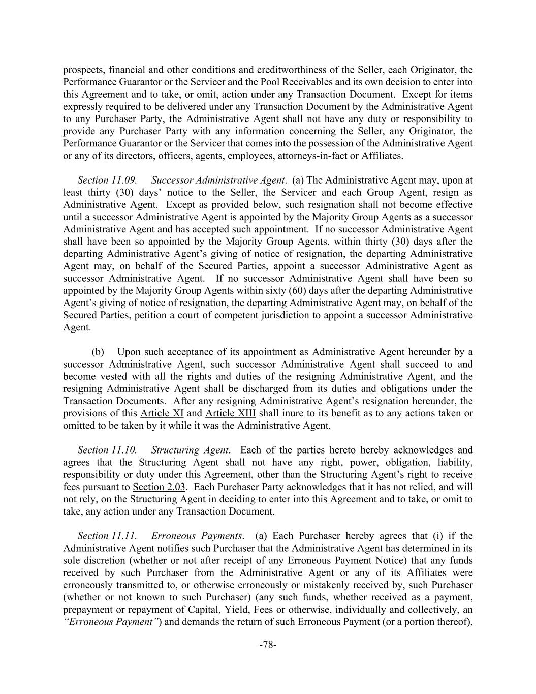 -78- prospects, financial and other conditions and creditworthiness of the Seller, each Originator, the Performance Guarantor or the Servicer and the Pool Receivables and its own decision to enter into this Agreement and to take, or omit, action under any Transaction Document. Except for items expressly required to be delivered under any Transaction Document by the Administrative Agent to any Purchaser Party, the Administrative Agent shall not have any duty or responsibility to provide any Purchaser Party with any information concerning the Seller, any Originator, the Performance Guarantor or the Servicer that comes into the possession of the Administrative Agent or any of its directors, officers, agents, employees, attorneys-in-fact or Affiliates. Section 11.09. Successor Administrative Agent. (a) The Administrative Agent may, upon at least thirty (30) days’ notice to the Seller, the Servicer and each Group Agent, resign as Administrative Agent. Except as provided below, such resignation shall not become effective until a successor Administrative Agent is appointed by the Majority Group Agents as a successor Administrative Agent and has accepted such appointment. If no successor Administrative Agent shall have been so appointed by the Majority Group Agents, within thirty (30) days after the departing Administrative Agent’s giving of notice of resignation, the departing Administrative Agent may, on behalf of the Secured Parties, appoint a successor Administrative Agent as successor Administrative Agent. If no successor Administrative Agent shall have been so appointed by the Majority Group Agents within sixty (60) days after the departing Administrative Agent’s giving of notice of resignation, the departing Administrative Agent may, on behalf of the Secured Parties, petition a court of competent jurisdiction to appoint a successor Administrative Agent. (b) Upon such acceptance of its appointment as Administrative Agent hereunder by a successor Administrative Agent, such successor Administrative Agent shall succeed to and become vested with all the rights and duties of the resigning Administrative Agent, and the resigning Administrative Agent shall be discharged from its duties and obligations under the Transaction Documents. After any resigning Administrative Agent’s resignation hereunder, the provisions of this Article XI and Article XIII shall inure to its benefit as to any actions taken or omitted to be taken by it while it was the Administrative Agent. Section 11.10. Structuring Agent. Each of the parties hereto hereby acknowledges and agrees that the Structuring Agent shall not have any right, power, obligation, liability, responsibility or duty under this Agreement, other than the Structuring Agent’s right to receive fees pursuant to Section 2.03. Each Purchaser Party acknowledges that it has not relied, and will not rely, on the Structuring Agent in deciding to enter into this Agreement and to take, or omit to take, any action under any Transaction Document. Section 11.11. Erroneous Payments. (a) Each Purchaser hereby agrees that (i) if the Administrative Agent notifies such Purchaser that the Administrative Agent has determined in its sole discretion (whether or not after receipt of any Erroneous Payment Notice) that any funds received by such Purchaser from the Administrative Agent or any of its Affiliates were erroneously transmitted to, or otherwise erroneously or mistakenly received by, such Purchaser (whether or not known to such Purchaser) (any such funds, whether received as a payment, prepayment or repayment of Capital, Yield, Fees or otherwise, individually and collectively, an “Erroneous Payment”) and demands the return of such Erroneous Payment (or a portion thereof),