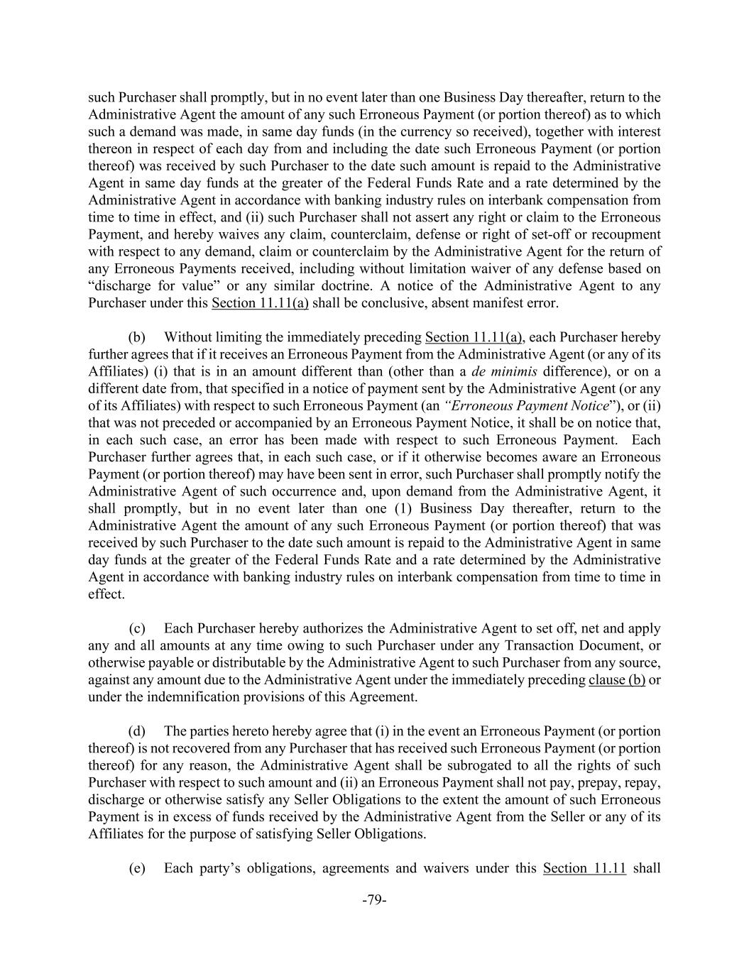 -79- such Purchaser shall promptly, but in no event later than one Business Day thereafter, return to the Administrative Agent the amount of any such Erroneous Payment (or portion thereof) as to which such a demand was made, in same day funds (in the currency so received), together with interest thereon in respect of each day from and including the date such Erroneous Payment (or portion thereof) was received by such Purchaser to the date such amount is repaid to the Administrative Agent in same day funds at the greater of the Federal Funds Rate and a rate determined by the Administrative Agent in accordance with banking industry rules on interbank compensation from time to time in effect, and (ii) such Purchaser shall not assert any right or claim to the Erroneous Payment, and hereby waives any claim, counterclaim, defense or right of set-off or recoupment with respect to any demand, claim or counterclaim by the Administrative Agent for the return of any Erroneous Payments received, including without limitation waiver of any defense based on “discharge for value” or any similar doctrine. A notice of the Administrative Agent to any Purchaser under this Section 11.11(a) shall be conclusive, absent manifest error. (b) Without limiting the immediately preceding Section 11.11(a), each Purchaser hereby further agrees that if it receives an Erroneous Payment from the Administrative Agent (or any of its Affiliates) (i) that is in an amount different than (other than a de minimis difference), or on a different date from, that specified in a notice of payment sent by the Administrative Agent (or any of its Affiliates) with respect to such Erroneous Payment (an “Erroneous Payment Notice”), or (ii) that was not preceded or accompanied by an Erroneous Payment Notice, it shall be on notice that, in each such case, an error has been made with respect to such Erroneous Payment. Each Purchaser further agrees that, in each such case, or if it otherwise becomes aware an Erroneous Payment (or portion thereof) may have been sent in error, such Purchaser shall promptly notify the Administrative Agent of such occurrence and, upon demand from the Administrative Agent, it shall promptly, but in no event later than one (1) Business Day thereafter, return to the Administrative Agent the amount of any such Erroneous Payment (or portion thereof) that was received by such Purchaser to the date such amount is repaid to the Administrative Agent in same day funds at the greater of the Federal Funds Rate and a rate determined by the Administrative Agent in accordance with banking industry rules on interbank compensation from time to time in effect. (c) Each Purchaser hereby authorizes the Administrative Agent to set off, net and apply any and all amounts at any time owing to such Purchaser under any Transaction Document, or otherwise payable or distributable by the Administrative Agent to such Purchaser from any source, against any amount due to the Administrative Agent under the immediately preceding clause (b) or under the indemnification provisions of this Agreement. (d) The parties hereto hereby agree that (i) in the event an Erroneous Payment (or portion thereof) is not recovered from any Purchaser that has received such Erroneous Payment (or portion thereof) for any reason, the Administrative Agent shall be subrogated to all the rights of such Purchaser with respect to such amount and (ii) an Erroneous Payment shall not pay, prepay, repay, discharge or otherwise satisfy any Seller Obligations to the extent the amount of such Erroneous Payment is in excess of funds received by the Administrative Agent from the Seller or any of its Affiliates for the purpose of satisfying Seller Obligations. (e) Each party’s obligations, agreements and waivers under this Section 11.11 shall