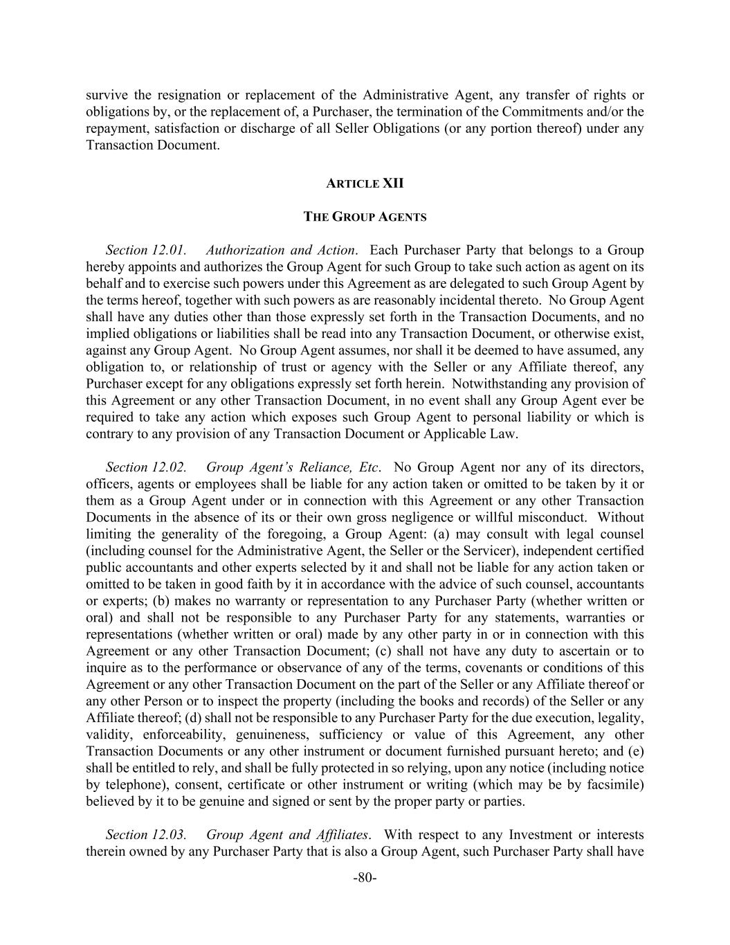 -80- survive the resignation or replacement of the Administrative Agent, any transfer of rights or obligations by, or the replacement of, a Purchaser, the termination of the Commitments and/or the repayment, satisfaction or discharge of all Seller Obligations (or any portion thereof) under any Transaction Document. ARTICLE XII THE GROUP AGENTS Section 12.01. Authorization and Action. Each Purchaser Party that belongs to a Group hereby appoints and authorizes the Group Agent for such Group to take such action as agent on its behalf and to exercise such powers under this Agreement as are delegated to such Group Agent by the terms hereof, together with such powers as are reasonably incidental thereto. No Group Agent shall have any duties other than those expressly set forth in the Transaction Documents, and no implied obligations or liabilities shall be read into any Transaction Document, or otherwise exist, against any Group Agent. No Group Agent assumes, nor shall it be deemed to have assumed, any obligation to, or relationship of trust or agency with the Seller or any Affiliate thereof, any Purchaser except for any obligations expressly set forth herein. Notwithstanding any provision of this Agreement or any other Transaction Document, in no event shall any Group Agent ever be required to take any action which exposes such Group Agent to personal liability or which is contrary to any provision of any Transaction Document or Applicable Law. Section 12.02. Group Agent’s Reliance, Etc. No Group Agent nor any of its directors, officers, agents or employees shall be liable for any action taken or omitted to be taken by it or them as a Group Agent under or in connection with this Agreement or any other Transaction Documents in the absence of its or their own gross negligence or willful misconduct. Without limiting the generality of the foregoing, a Group Agent: (a) may consult with legal counsel (including counsel for the Administrative Agent, the Seller or the Servicer), independent certified public accountants and other experts selected by it and shall not be liable for any action taken or omitted to be taken in good faith by it in accordance with the advice of such counsel, accountants or experts; (b) makes no warranty or representation to any Purchaser Party (whether written or oral) and shall not be responsible to any Purchaser Party for any statements, warranties or representations (whether written or oral) made by any other party in or in connection with this Agreement or any other Transaction Document; (c) shall not have any duty to ascertain or to inquire as to the performance or observance of any of the terms, covenants or conditions of this Agreement or any other Transaction Document on the part of the Seller or any Affiliate thereof or any other Person or to inspect the property (including the books and records) of the Seller or any Affiliate thereof; (d) shall not be responsible to any Purchaser Party for the due execution, legality, validity, enforceability, genuineness, sufficiency or value of this Agreement, any other Transaction Documents or any other instrument or document furnished pursuant hereto; and (e) shall be entitled to rely, and shall be fully protected in so relying, upon any notice (including notice by telephone), consent, certificate or other instrument or writing (which may be by facsimile) believed by it to be genuine and signed or sent by the proper party or parties. Section 12.03. Group Agent and Affiliates. With respect to any Investment or interests therein owned by any Purchaser Party that is also a Group Agent, such Purchaser Party shall have