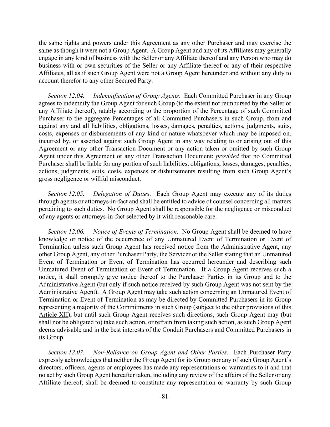 -81- the same rights and powers under this Agreement as any other Purchaser and may exercise the same as though it were not a Group Agent. A Group Agent and any of its Affiliates may generally engage in any kind of business with the Seller or any Affiliate thereof and any Person who may do business with or own securities of the Seller or any Affiliate thereof or any of their respective Affiliates, all as if such Group Agent were not a Group Agent hereunder and without any duty to account therefor to any other Secured Party. Section 12.04. Indemnification of Group Agents. Each Committed Purchaser in any Group agrees to indemnify the Group Agent for such Group (to the extent not reimbursed by the Seller or any Affiliate thereof), ratably according to the proportion of the Percentage of such Committed Purchaser to the aggregate Percentages of all Committed Purchasers in such Group, from and against any and all liabilities, obligations, losses, damages, penalties, actions, judgments, suits, costs, expenses or disbursements of any kind or nature whatsoever which may be imposed on, incurred by, or asserted against such Group Agent in any way relating to or arising out of this Agreement or any other Transaction Document or any action taken or omitted by such Group Agent under this Agreement or any other Transaction Document; provided that no Committed Purchaser shall be liable for any portion of such liabilities, obligations, losses, damages, penalties, actions, judgments, suits, costs, expenses or disbursements resulting from such Group Agent’s gross negligence or willful misconduct. Section 12.05. Delegation of Duties. Each Group Agent may execute any of its duties through agents or attorneys-in-fact and shall be entitled to advice of counsel concerning all matters pertaining to such duties. No Group Agent shall be responsible for the negligence or misconduct of any agents or attorneys-in-fact selected by it with reasonable care. Section 12.06. Notice of Events of Termination. No Group Agent shall be deemed to have knowledge or notice of the occurrence of any Unmatured Event of Termination or Event of Termination unless such Group Agent has received notice from the Administrative Agent, any other Group Agent, any other Purchaser Party, the Servicer or the Seller stating that an Unmatured Event of Termination or Event of Termination has occurred hereunder and describing such Unmatured Event of Termination or Event of Termination. If a Group Agent receives such a notice, it shall promptly give notice thereof to the Purchaser Parties in its Group and to the Administrative Agent (but only if such notice received by such Group Agent was not sent by the Administrative Agent). A Group Agent may take such action concerning an Unmatured Event of Termination or Event of Termination as may be directed by Committed Purchasers in its Group representing a majority of the Commitments in such Group (subject to the other provisions of this Article XII), but until such Group Agent receives such directions, such Group Agent may (but shall not be obligated to) take such action, or refrain from taking such action, as such Group Agent deems advisable and in the best interests of the Conduit Purchasers and Committed Purchasers in its Group. Section 12.07. Non-Reliance on Group Agent and Other Parties. Each Purchaser Party expressly acknowledges that neither the Group Agent for its Group nor any of such Group Agent’s directors, officers, agents or employees has made any representations or warranties to it and that no act by such Group Agent hereafter taken, including any review of the affairs of the Seller or any Affiliate thereof, shall be deemed to constitute any representation or warranty by such Group