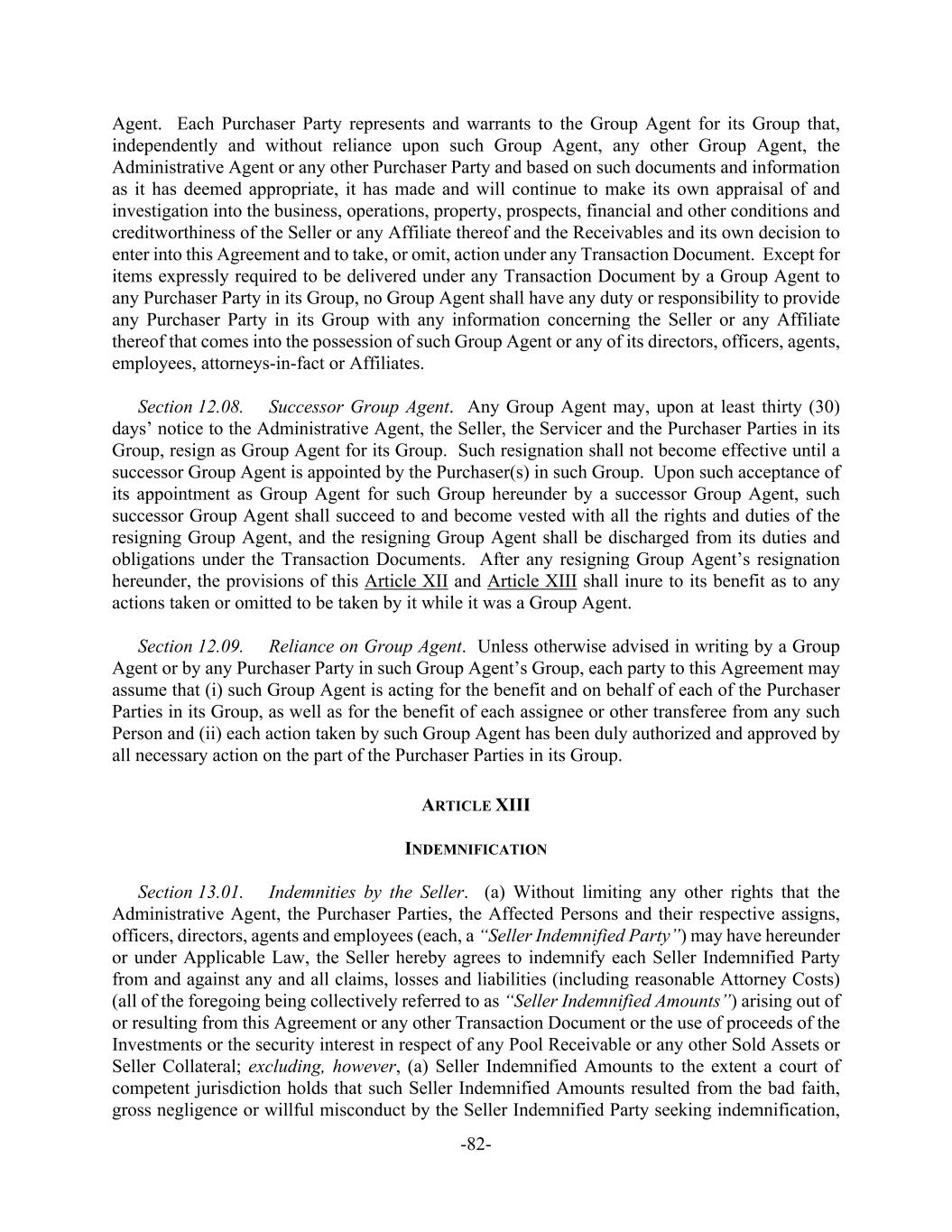 -82- Agent. Each Purchaser Party represents and warrants to the Group Agent for its Group that, independently and without reliance upon such Group Agent, any other Group Agent, the Administrative Agent or any other Purchaser Party and based on such documents and information as it has deemed appropriate, it has made and will continue to make its own appraisal of and investigation into the business, operations, property, prospects, financial and other conditions and creditworthiness of the Seller or any Affiliate thereof and the Receivables and its own decision to enter into this Agreement and to take, or omit, action under any Transaction Document. Except for items expressly required to be delivered under any Transaction Document by a Group Agent to any Purchaser Party in its Group, no Group Agent shall have any duty or responsibility to provide any Purchaser Party in its Group with any information concerning the Seller or any Affiliate thereof that comes into the possession of such Group Agent or any of its directors, officers, agents, employees, attorneys-in-fact or Affiliates. Section 12.08. Successor Group Agent. Any Group Agent may, upon at least thirty (30) days’ notice to the Administrative Agent, the Seller, the Servicer and the Purchaser Parties in its Group, resign as Group Agent for its Group. Such resignation shall not become effective until a successor Group Agent is appointed by the Purchaser(s) in such Group. Upon such acceptance of its appointment as Group Agent for such Group hereunder by a successor Group Agent, such successor Group Agent shall succeed to and become vested with all the rights and duties of the resigning Group Agent, and the resigning Group Agent shall be discharged from its duties and obligations under the Transaction Documents. After any resigning Group Agent’s resignation hereunder, the provisions of this Article XII and Article XIII shall inure to its benefit as to any actions taken or omitted to be taken by it while it was a Group Agent. Section 12.09. Reliance on Group Agent. Unless otherwise advised in writing by a Group Agent or by any Purchaser Party in such Group Agent’s Group, each party to this Agreement may assume that (i) such Group Agent is acting for the benefit and on behalf of each of the Purchaser Parties in its Group, as well as for the benefit of each assignee or other transferee from any such Person and (ii) each action taken by such Group Agent has been duly authorized and approved by all necessary action on the part of the Purchaser Parties in its Group. ARTICLE XIII INDEMNIFICATION Section 13.01. Indemnities by the Seller. (a) Without limiting any other rights that the Administrative Agent, the Purchaser Parties, the Affected Persons and their respective assigns, officers, directors, agents and employees (each, a “Seller Indemnified Party”) may have hereunder or under Applicable Law, the Seller hereby agrees to indemnify each Seller Indemnified Party from and against any and all claims, losses and liabilities (including reasonable Attorney Costs) (all of the foregoing being collectively referred to as “Seller Indemnified Amounts”) arising out of or resulting from this Agreement or any other Transaction Document or the use of proceeds of the Investments or the security interest in respect of any Pool Receivable or any other Sold Assets or Seller Collateral; excluding, however, (a) Seller Indemnified Amounts to the extent a court of competent jurisdiction holds that such Seller Indemnified Amounts resulted from the bad faith, gross negligence or willful misconduct by the Seller Indemnified Party seeking indemnification,