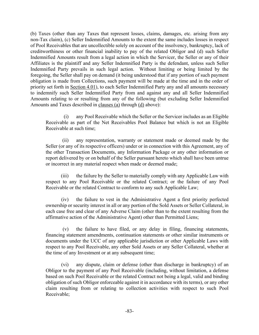 -83- (b) Taxes (other than any Taxes that represent losses, claims, damages, etc. arising from any non-Tax claim), (c) Seller Indemnified Amounts to the extent the same includes losses in respect of Pool Receivables that are uncollectible solely on account of the insolvency, bankruptcy, lack of creditworthiness or other financial inability to pay of the related Obligor and (d) such Seller Indemnified Amounts result from a legal action in which the Servicer, the Seller or any of their Affiliates is the plaintiff and any Seller Indemnified Party is the defendant, unless such Seller Indemnified Party prevails in such legal action. Without limiting or being limited by the foregoing, the Seller shall pay on demand (it being understood that if any portion of such payment obligation is made from Collections, such payment will be made at the time and in the order of priority set forth in Section 4.01), to each Seller Indemnified Party any and all amounts necessary to indemnify such Seller Indemnified Party from and against any and all Seller Indemnified Amounts relating to or resulting from any of the following (but excluding Seller Indemnified Amounts and Taxes described in clauses (a) through (d) above): (i) any Pool Receivable which the Seller or the Servicer includes as an Eligible Receivable as part of the Net Receivables Pool Balance but which is not an Eligible Receivable at such time; (ii) any representation, warranty or statement made or deemed made by the Seller (or any of its respective officers) under or in connection with this Agreement, any of the other Transaction Documents, any Information Package or any other information or report delivered by or on behalf of the Seller pursuant hereto which shall have been untrue or incorrect in any material respect when made or deemed made; (iii) the failure by the Seller to materially comply with any Applicable Law with respect to any Pool Receivable or the related Contract; or the failure of any Pool Receivable or the related Contract to conform to any such Applicable Law; (iv) the failure to vest in the Administrative Agent a first priority perfected ownership or security interest in all or any portion of the Sold Assets or Seller Collateral, in each case free and clear of any Adverse Claim (other than to the extent resulting from the affirmative action of the Administrative Agent) other than Permitted Liens; (v) the failure to have filed, or any delay in filing, financing statements, financing statement amendments, continuation statements or other similar instruments or documents under the UCC of any applicable jurisdiction or other Applicable Laws with respect to any Pool Receivable, any other Sold Assets or any Seller Collateral, whether at the time of any Investment or at any subsequent time; (vi) any dispute, claim or defense (other than discharge in bankruptcy) of an Obligor to the payment of any Pool Receivable (including, without limitation, a defense based on such Pool Receivable or the related Contract not being a legal, valid and binding obligation of such Obligor enforceable against it in accordance with its terms), or any other claim resulting from or relating to collection activities with respect to such Pool Receivable;