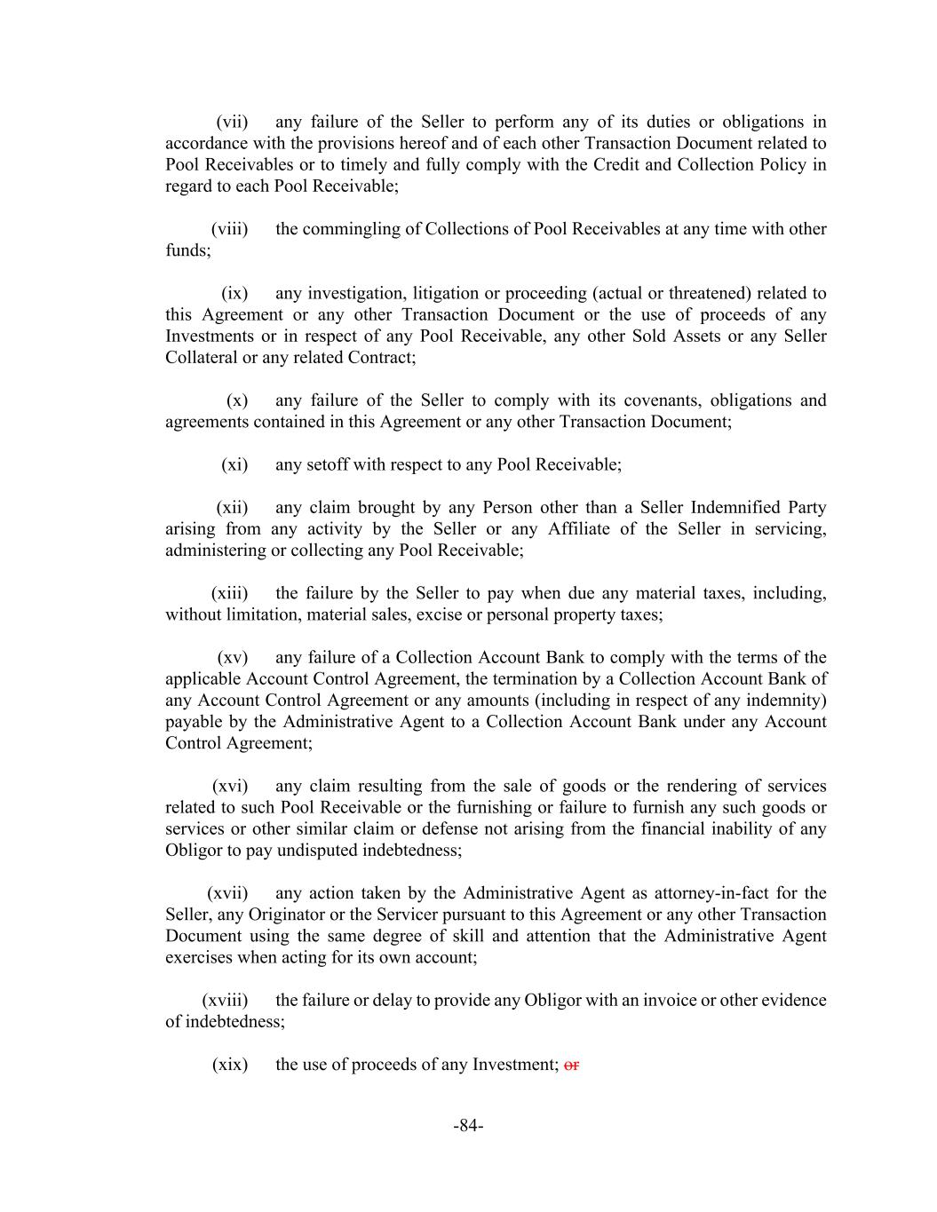 -84- (vii) any failure of the Seller to perform any of its duties or obligations in accordance with the provisions hereof and of each other Transaction Document related to Pool Receivables or to timely and fully comply with the Credit and Collection Policy in regard to each Pool Receivable; (viii) the commingling of Collections of Pool Receivables at any time with other funds; (ix) any investigation, litigation or proceeding (actual or threatened) related to this Agreement or any other Transaction Document or the use of proceeds of any Investments or in respect of any Pool Receivable, any other Sold Assets or any Seller Collateral or any related Contract; (x) any failure of the Seller to comply with its covenants, obligations and agreements contained in this Agreement or any other Transaction Document; (xi) any setoff with respect to any Pool Receivable; (xii) any claim brought by any Person other than a Seller Indemnified Party arising from any activity by the Seller or any Affiliate of the Seller in servicing, administering or collecting any Pool Receivable; (xiii) the failure by the Seller to pay when due any material taxes, including, without limitation, material sales, excise or personal property taxes; (xv) any failure of a Collection Account Bank to comply with the terms of the applicable Account Control Agreement, the termination by a Collection Account Bank of any Account Control Agreement or any amounts (including in respect of any indemnity) payable by the Administrative Agent to a Collection Account Bank under any Account Control Agreement; (xvi) any claim resulting from the sale of goods or the rendering of services related to such Pool Receivable or the furnishing or failure to furnish any such goods or services or other similar claim or defense not arising from the financial inability of any Obligor to pay undisputed indebtedness; (xvii) any action taken by the Administrative Agent as attorney-in-fact for the Seller, any Originator or the Servicer pursuant to this Agreement or any other Transaction Document using the same degree of skill and attention that the Administrative Agent exercises when acting for its own account; (xviii) the failure or delay to provide any Obligor with an invoice or other evidence of indebtedness; (xix) the use of proceeds of any Investment; or