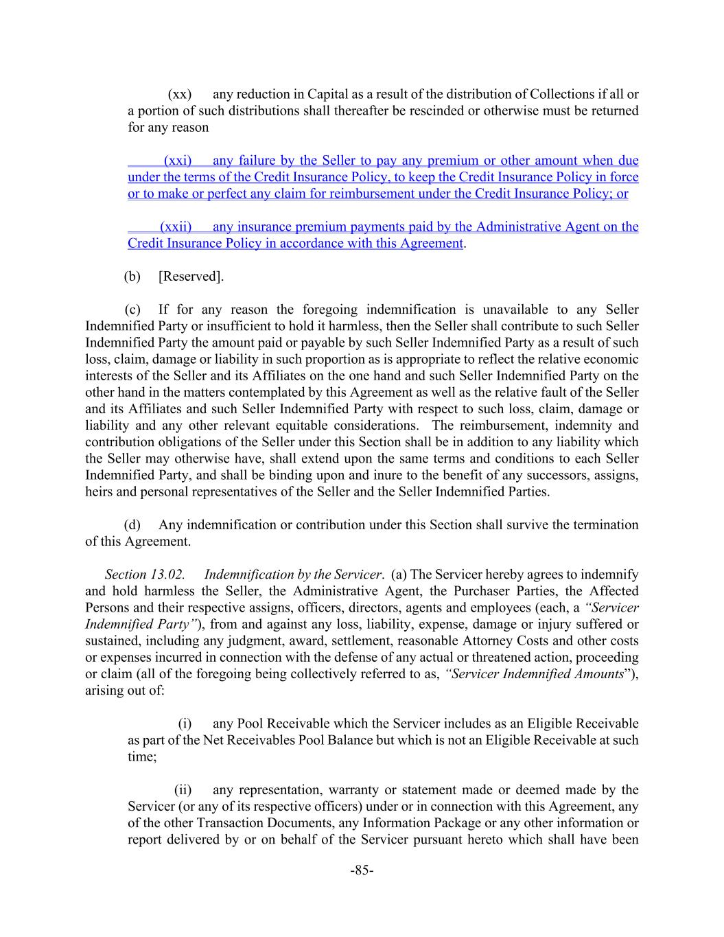 -85- (xx) any reduction in Capital as a result of the distribution of Collections if all or a portion of such distributions shall thereafter be rescinded or otherwise must be returned for any reason (xxi) any failure by the Seller to pay any premium or other amount when due under the terms of the Credit Insurance Policy, to keep the Credit Insurance Policy in force or to make or perfect any claim for reimbursement under the Credit Insurance Policy; or (xxii) any insurance premium payments paid by the Administrative Agent on the Credit Insurance Policy in accordance with this Agreement. (b) [Reserved]. (c) If for any reason the foregoing indemnification is unavailable to any Seller Indemnified Party or insufficient to hold it harmless, then the Seller shall contribute to such Seller Indemnified Party the amount paid or payable by such Seller Indemnified Party as a result of such loss, claim, damage or liability in such proportion as is appropriate to reflect the relative economic interests of the Seller and its Affiliates on the one hand and such Seller Indemnified Party on the other hand in the matters contemplated by this Agreement as well as the relative fault of the Seller and its Affiliates and such Seller Indemnified Party with respect to such loss, claim, damage or liability and any other relevant equitable considerations. The reimbursement, indemnity and contribution obligations of the Seller under this Section shall be in addition to any liability which the Seller may otherwise have, shall extend upon the same terms and conditions to each Seller Indemnified Party, and shall be binding upon and inure to the benefit of any successors, assigns, heirs and personal representatives of the Seller and the Seller Indemnified Parties. (d) Any indemnification or contribution under this Section shall survive the termination of this Agreement. Section 13.02. Indemnification by the Servicer. (a) The Servicer hereby agrees to indemnify and hold harmless the Seller, the Administrative Agent, the Purchaser Parties, the Affected Persons and their respective assigns, officers, directors, agents and employees (each, a “Servicer Indemnified Party”), from and against any loss, liability, expense, damage or injury suffered or sustained, including any judgment, award, settlement, reasonable Attorney Costs and other costs or expenses incurred in connection with the defense of any actual or threatened action, proceeding or claim (all of the foregoing being collectively referred to as, “Servicer Indemnified Amounts”), arising out of: (i) any Pool Receivable which the Servicer includes as an Eligible Receivable as part of the Net Receivables Pool Balance but which is not an Eligible Receivable at such time; (ii) any representation, warranty or statement made or deemed made by the Servicer (or any of its respective officers) under or in connection with this Agreement, any of the other Transaction Documents, any Information Package or any other information or report delivered by or on behalf of the Servicer pursuant hereto which shall have been