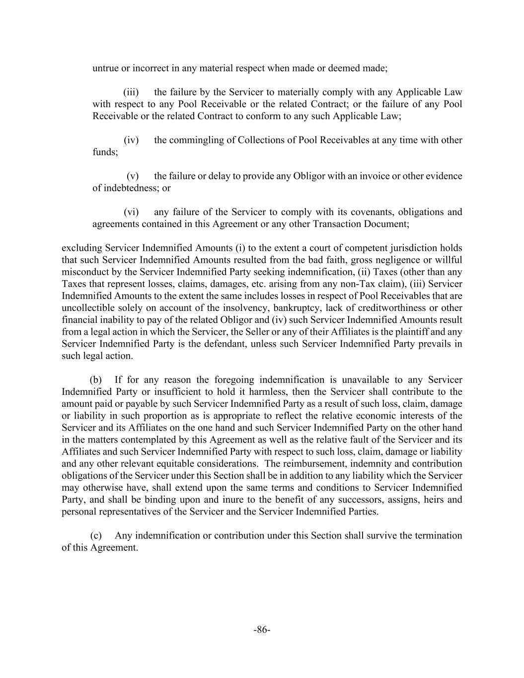 -86- untrue or incorrect in any material respect when made or deemed made; (iii) the failure by the Servicer to materially comply with any Applicable Law with respect to any Pool Receivable or the related Contract; or the failure of any Pool Receivable or the related Contract to conform to any such Applicable Law; (iv) the commingling of Collections of Pool Receivables at any time with other funds; (v) the failure or delay to provide any Obligor with an invoice or other evidence of indebtedness; or (vi) any failure of the Servicer to comply with its covenants, obligations and agreements contained in this Agreement or any other Transaction Document; excluding Servicer Indemnified Amounts (i) to the extent a court of competent jurisdiction holds that such Servicer Indemnified Amounts resulted from the bad faith, gross negligence or willful misconduct by the Servicer Indemnified Party seeking indemnification, (ii) Taxes (other than any Taxes that represent losses, claims, damages, etc. arising from any non-Tax claim), (iii) Servicer Indemnified Amounts to the extent the same includes losses in respect of Pool Receivables that are uncollectible solely on account of the insolvency, bankruptcy, lack of creditworthiness or other financial inability to pay of the related Obligor and (iv) such Servicer Indemnified Amounts result from a legal action in which the Servicer, the Seller or any of their Affiliates is the plaintiff and any Servicer Indemnified Party is the defendant, unless such Servicer Indemnified Party prevails in such legal action. (b) If for any reason the foregoing indemnification is unavailable to any Servicer Indemnified Party or insufficient to hold it harmless, then the Servicer shall contribute to the amount paid or payable by such Servicer Indemnified Party as a result of such loss, claim, damage or liability in such proportion as is appropriate to reflect the relative economic interests of the Servicer and its Affiliates on the one hand and such Servicer Indemnified Party on the other hand in the matters contemplated by this Agreement as well as the relative fault of the Servicer and its Affiliates and such Servicer Indemnified Party with respect to such loss, claim, damage or liability and any other relevant equitable considerations. The reimbursement, indemnity and contribution obligations of the Servicer under this Section shall be in addition to any liability which the Servicer may otherwise have, shall extend upon the same terms and conditions to Servicer Indemnified Party, and shall be binding upon and inure to the benefit of any successors, assigns, heirs and personal representatives of the Servicer and the Servicer Indemnified Parties. (c) Any indemnification or contribution under this Section shall survive the termination of this Agreement.