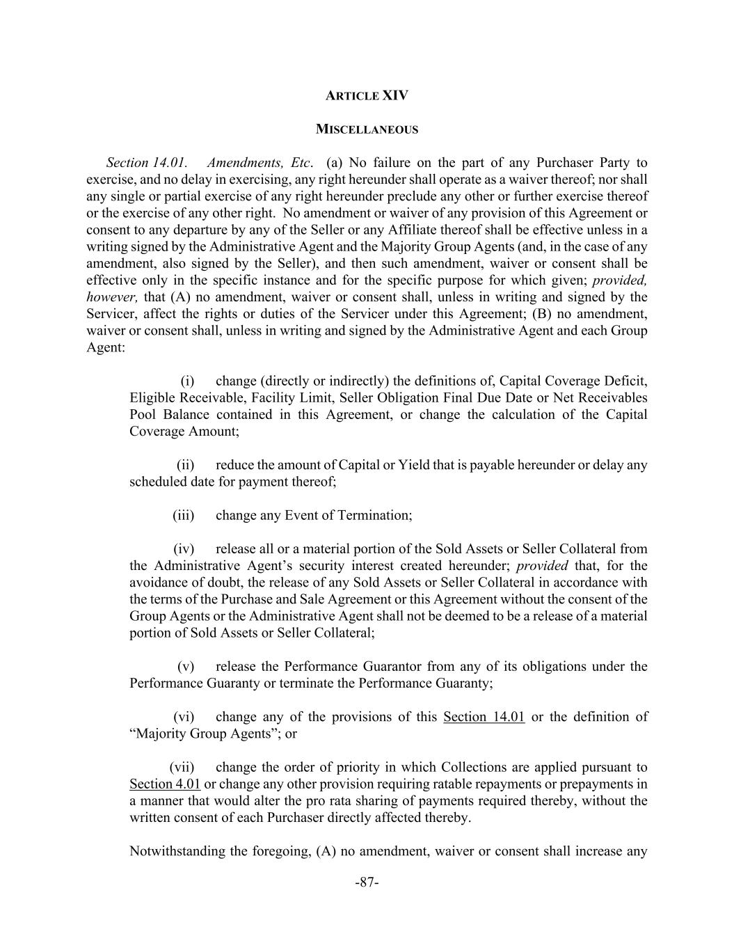 -87- ARTICLE XIV MISCELLANEOUS Section 14.01. Amendments, Etc. (a) No failure on the part of any Purchaser Party to exercise, and no delay in exercising, any right hereunder shall operate as a waiver thereof; nor shall any single or partial exercise of any right hereunder preclude any other or further exercise thereof or the exercise of any other right. No amendment or waiver of any provision of this Agreement or consent to any departure by any of the Seller or any Affiliate thereof shall be effective unless in a writing signed by the Administrative Agent and the Majority Group Agents (and, in the case of any amendment, also signed by the Seller), and then such amendment, waiver or consent shall be effective only in the specific instance and for the specific purpose for which given; provided, however, that (A) no amendment, waiver or consent shall, unless in writing and signed by the Servicer, affect the rights or duties of the Servicer under this Agreement; (B) no amendment, waiver or consent shall, unless in writing and signed by the Administrative Agent and each Group Agent: (i) change (directly or indirectly) the definitions of, Capital Coverage Deficit, Eligible Receivable, Facility Limit, Seller Obligation Final Due Date or Net Receivables Pool Balance contained in this Agreement, or change the calculation of the Capital Coverage Amount; (ii) reduce the amount of Capital or Yield that is payable hereunder or delay any scheduled date for payment thereof; (iii) change any Event of Termination; (iv) release all or a material portion of the Sold Assets or Seller Collateral from the Administrative Agent’s security interest created hereunder; provided that, for the avoidance of doubt, the release of any Sold Assets or Seller Collateral in accordance with the terms of the Purchase and Sale Agreement or this Agreement without the consent of the Group Agents or the Administrative Agent shall not be deemed to be a release of a material portion of Sold Assets or Seller Collateral; (v) release the Performance Guarantor from any of its obligations under the Performance Guaranty or terminate the Performance Guaranty; (vi) change any of the provisions of this Section 14.01 or the definition of “Majority Group Agents”; or (vii) change the order of priority in which Collections are applied pursuant to Section 4.01 or change any other provision requiring ratable repayments or prepayments in a manner that would alter the pro rata sharing of payments required thereby, without the written consent of each Purchaser directly affected thereby. Notwithstanding the foregoing, (A) no amendment, waiver or consent shall increase any