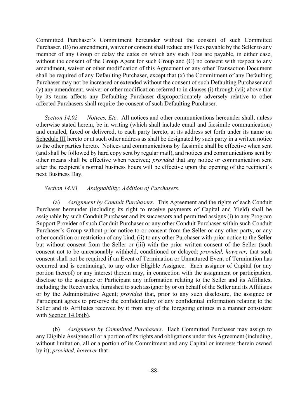 -88- Committed Purchaser’s Commitment hereunder without the consent of such Committed Purchaser, (B) no amendment, waiver or consent shall reduce any Fees payable by the Seller to any member of any Group or delay the dates on which any such Fees are payable, in either case, without the consent of the Group Agent for such Group and (C) no consent with respect to any amendment, waiver or other modification of this Agreement or any other Transaction Document shall be required of any Defaulting Purchaser, except that (x) the Commitment of any Defaulting Purchaser may not be increased or extended without the consent of such Defaulting Purchaser and (y) any amendment, waiver or other modification referred to in clauses (i) through (vii) above that by its terms affects any Defaulting Purchaser disproportionately adversely relative to other affected Purchasers shall require the consent of such Defaulting Purchaser. Section 14.02. Notices, Etc. All notices and other communications hereunder shall, unless otherwise stated herein, be in writing (which shall include email and facsimile communication) and emailed, faxed or delivered, to each party hereto, at its address set forth under its name on Schedule III hereto or at such other address as shall be designated by such party in a written notice to the other parties hereto. Notices and communications by facsimile shall be effective when sent (and shall be followed by hard copy sent by regular mail), and notices and communications sent by other means shall be effective when received; provided that any notice or communication sent after the recipient’s normal business hours will be effective upon the opening of the recipient’s next Business Day. Section 14.03. Assignability; Addition of Purchasers. (a) Assignment by Conduit Purchasers. This Agreement and the rights of each Conduit Purchaser hereunder (including its right to receive payments of Capital and Yield) shall be assignable by such Conduit Purchaser and its successors and permitted assigns (i) to any Program Support Provider of such Conduit Purchaser or any other Conduit Purchaser within such Conduit Purchaser’s Group without prior notice to or consent from the Seller or any other party, or any other condition or restriction of any kind, (ii) to any other Purchaser with prior notice to the Seller but without consent from the Seller or (iii) with the prior written consent of the Seller (such consent not to be unreasonably withheld, conditioned or delayed; provided, however, that such consent shall not be required if an Event of Termination or Unmatured Event of Termination has occurred and is continuing), to any other Eligible Assignee. Each assignor of Capital (or any portion thereof) or any interest therein may, in connection with the assignment or participation, disclose to the assignee or Participant any information relating to the Seller and its Affiliates, including the Receivables, furnished to such assignor by or on behalf of the Seller and its Affiliates or by the Administrative Agent; provided that, prior to any such disclosure, the assignee or Participant agrees to preserve the confidentiality of any confidential information relating to the Seller and its Affiliates received by it from any of the foregoing entities in a manner consistent with Section 14.06(b). (b) Assignment by Committed Purchasers. Each Committed Purchaser may assign to any Eligible Assignee all or a portion of its rights and obligations under this Agreement (including, without limitation, all or a portion of its Commitment and any Capital or interests therein owned by it); provided, however that