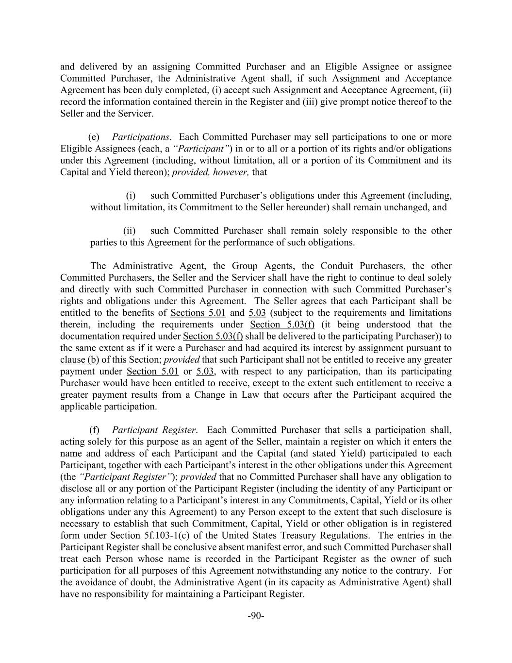 -90- and delivered by an assigning Committed Purchaser and an Eligible Assignee or assignee Committed Purchaser, the Administrative Agent shall, if such Assignment and Acceptance Agreement has been duly completed, (i) accept such Assignment and Acceptance Agreement, (ii) record the information contained therein in the Register and (iii) give prompt notice thereof to the Seller and the Servicer. (e) Participations. Each Committed Purchaser may sell participations to one or more Eligible Assignees (each, a “Participant”) in or to all or a portion of its rights and/or obligations under this Agreement (including, without limitation, all or a portion of its Commitment and its Capital and Yield thereon); provided, however, that (i) such Committed Purchaser’s obligations under this Agreement (including, without limitation, its Commitment to the Seller hereunder) shall remain unchanged, and (ii) such Committed Purchaser shall remain solely responsible to the other parties to this Agreement for the performance of such obligations. The Administrative Agent, the Group Agents, the Conduit Purchasers, the other Committed Purchasers, the Seller and the Servicer shall have the right to continue to deal solely and directly with such Committed Purchaser in connection with such Committed Purchaser’s rights and obligations under this Agreement. The Seller agrees that each Participant shall be entitled to the benefits of Sections 5.01 and 5.03 (subject to the requirements and limitations therein, including the requirements under Section 5.03(f) (it being understood that the documentation required under Section 5.03(f) shall be delivered to the participating Purchaser)) to the same extent as if it were a Purchaser and had acquired its interest by assignment pursuant to clause (b) of this Section; provided that such Participant shall not be entitled to receive any greater payment under Section 5.01 or 5.03, with respect to any participation, than its participating Purchaser would have been entitled to receive, except to the extent such entitlement to receive a greater payment results from a Change in Law that occurs after the Participant acquired the applicable participation. (f) Participant Register. Each Committed Purchaser that sells a participation shall, acting solely for this purpose as an agent of the Seller, maintain a register on which it enters the name and address of each Participant and the Capital (and stated Yield) participated to each Participant, together with each Participant’s interest in the other obligations under this Agreement (the “Participant Register”); provided that no Committed Purchaser shall have any obligation to disclose all or any portion of the Participant Register (including the identity of any Participant or any information relating to a Participant’s interest in any Commitments, Capital, Yield or its other obligations under any this Agreement) to any Person except to the extent that such disclosure is necessary to establish that such Commitment, Capital, Yield or other obligation is in registered form under Section 5f.103-1(c) of the United States Treasury Regulations. The entries in the Participant Register shall be conclusive absent manifest error, and such Committed Purchaser shall treat each Person whose name is recorded in the Participant Register as the owner of such participation for all purposes of this Agreement notwithstanding any notice to the contrary. For the avoidance of doubt, the Administrative Agent (in its capacity as Administrative Agent) shall have no responsibility for maintaining a Participant Register.