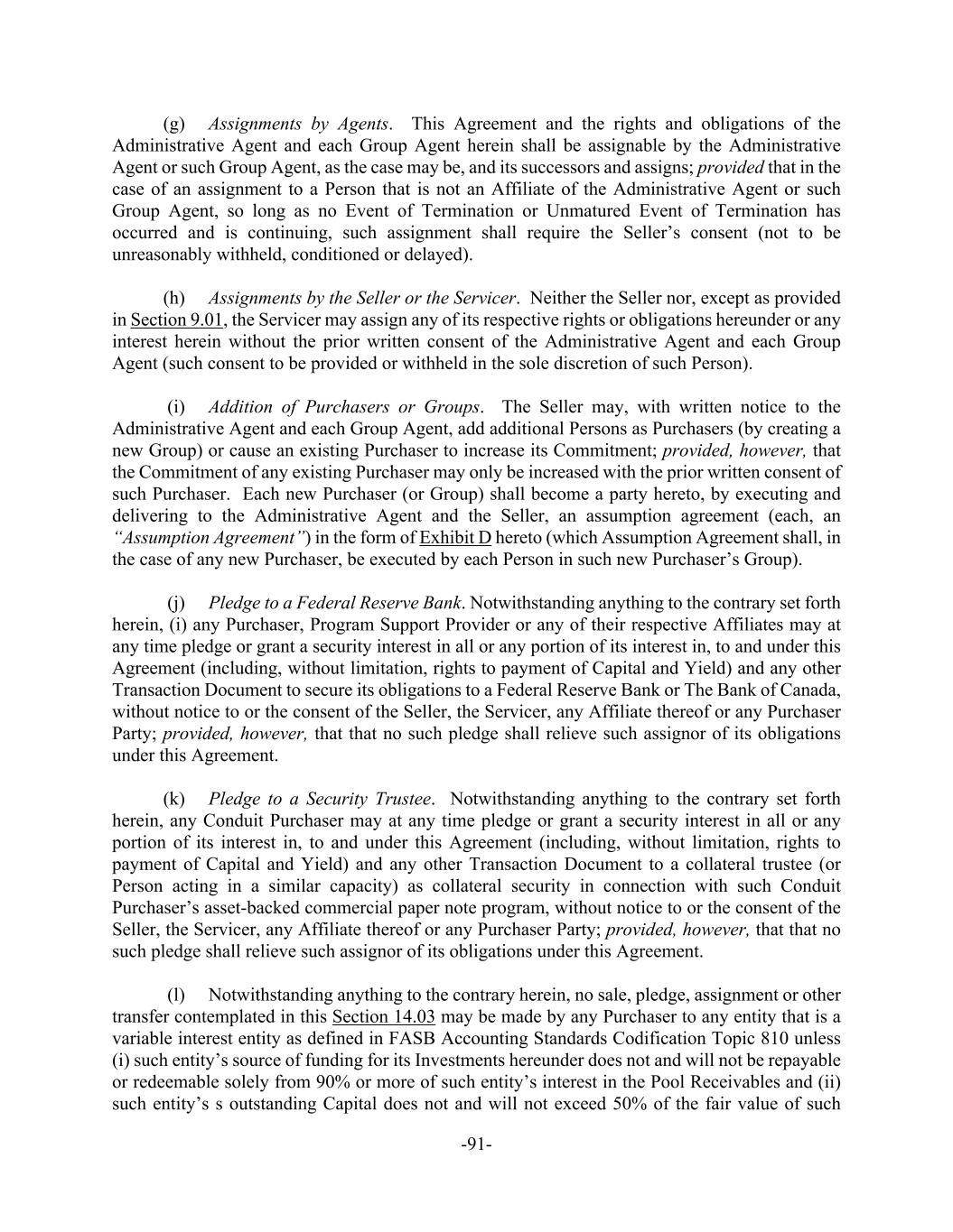 -91- (g) Assignments by Agents. This Agreement and the rights and obligations of the Administrative Agent and each Group Agent herein shall be assignable by the Administrative Agent or such Group Agent, as the case may be, and its successors and assigns; provided that in the case of an assignment to a Person that is not an Affiliate of the Administrative Agent or such Group Agent, so long as no Event of Termination or Unmatured Event of Termination has occurred and is continuing, such assignment shall require the Seller’s consent (not to be unreasonably withheld, conditioned or delayed). (h) Assignments by the Seller or the Servicer. Neither the Seller nor, except as provided in Section 9.01, the Servicer may assign any of its respective rights or obligations hereunder or any interest herein without the prior written consent of the Administrative Agent and each Group Agent (such consent to be provided or withheld in the sole discretion of such Person). (i) Addition of Purchasers or Groups. The Seller may, with written notice to the Administrative Agent and each Group Agent, add additional Persons as Purchasers (by creating a new Group) or cause an existing Purchaser to increase its Commitment; provided, however, that the Commitment of any existing Purchaser may only be increased with the prior written consent of such Purchaser. Each new Purchaser (or Group) shall become a party hereto, by executing and delivering to the Administrative Agent and the Seller, an assumption agreement (each, an “Assumption Agreement”) in the form of Exhibit D hereto (which Assumption Agreement shall, in the case of any new Purchaser, be executed by each Person in such new Purchaser’s Group). (j) Pledge to a Federal Reserve Bank. Notwithstanding anything to the contrary set forth herein, (i) any Purchaser, Program Support Provider or any of their respective Affiliates may at any time pledge or grant a security interest in all or any portion of its interest in, to and under this Agreement (including, without limitation, rights to payment of Capital and Yield) and any other Transaction Document to secure its obligations to a Federal Reserve Bank or The Bank of Canada, without notice to or the consent of the Seller, the Servicer, any Affiliate thereof or any Purchaser Party; provided, however, that that no such pledge shall relieve such assignor of its obligations under this Agreement. (k) Pledge to a Security Trustee. Notwithstanding anything to the contrary set forth herein, any Conduit Purchaser may at any time pledge or grant a security interest in all or any portion of its interest in, to and under this Agreement (including, without limitation, rights to payment of Capital and Yield) and any other Transaction Document to a collateral trustee (or Person acting in a similar capacity) as collateral security in connection with such Conduit Purchaser’s asset-backed commercial paper note program, without notice to or the consent of the Seller, the Servicer, any Affiliate thereof or any Purchaser Party; provided, however, that that no such pledge shall relieve such assignor of its obligations under this Agreement. (l) Notwithstanding anything to the contrary herein, no sale, pledge, assignment or other transfer contemplated in this Section 14.03 may be made by any Purchaser to any entity that is a variable interest entity as defined in FASB Accounting Standards Codification Topic 810 unless (i) such entity’s source of funding for its Investments hereunder does not and will not be repayable or redeemable solely from 90% or more of such entity’s interest in the Pool Receivables and (ii) such entity’s s outstanding Capital does not and will not exceed 50% of the fair value of such