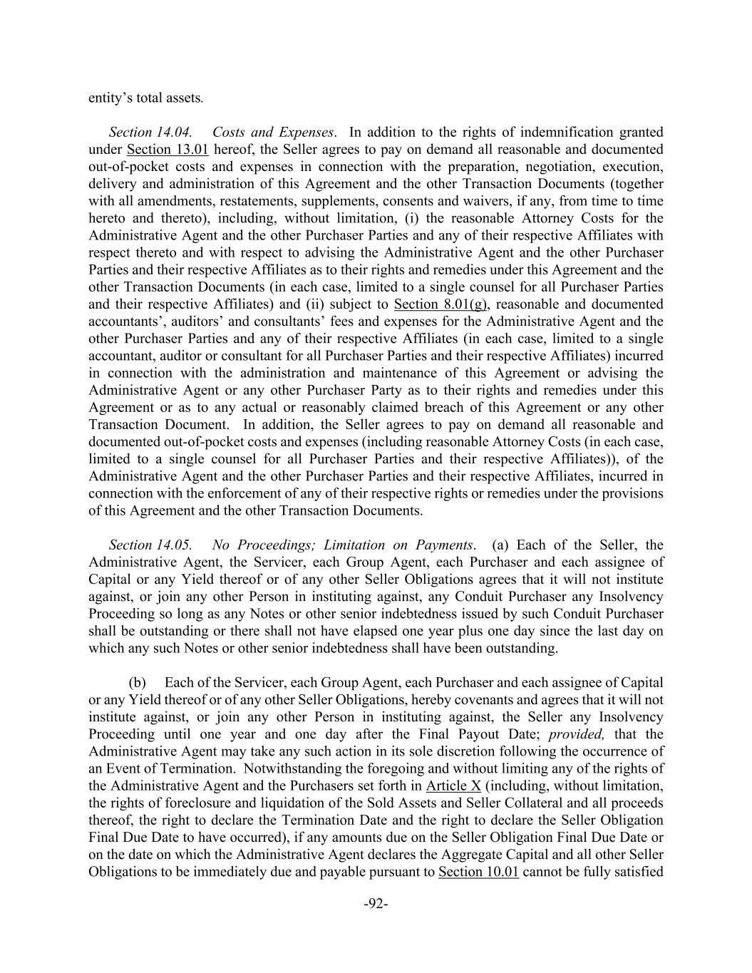 -92- entity’s total assets. Section 14.04. Costs and Expenses. In addition to the rights of indemnification granted under Section 13.01 hereof, the Seller agrees to pay on demand all reasonable and documented out-of-pocket costs and expenses in connection with the preparation, negotiation, execution, delivery and administration of this Agreement and the other Transaction Documents (together with all amendments, restatements, supplements, consents and waivers, if any, from time to time hereto and thereto), including, without limitation, (i) the reasonable Attorney Costs for the Administrative Agent and the other Purchaser Parties and any of their respective Affiliates with respect thereto and with respect to advising the Administrative Agent and the other Purchaser Parties and their respective Affiliates as to their rights and remedies under this Agreement and the other Transaction Documents (in each case, limited to a single counsel for all Purchaser Parties and their respective Affiliates) and (ii) subject to Section 8.01(g), reasonable and documented accountants’, auditors’ and consultants’ fees and expenses for the Administrative Agent and the other Purchaser Parties and any of their respective Affiliates (in each case, limited to a single accountant, auditor or consultant for all Purchaser Parties and their respective Affiliates) incurred in connection with the administration and maintenance of this Agreement or advising the Administrative Agent or any other Purchaser Party as to their rights and remedies under this Agreement or as to any actual or reasonably claimed breach of this Agreement or any other Transaction Document. In addition, the Seller agrees to pay on demand all reasonable and documented out-of-pocket costs and expenses (including reasonable Attorney Costs (in each case, limited to a single counsel for all Purchaser Parties and their respective Affiliates)), of the Administrative Agent and the other Purchaser Parties and their respective Affiliates, incurred in connection with the enforcement of any of their respective rights or remedies under the provisions of this Agreement and the other Transaction Documents. Section 14.05. No Proceedings; Limitation on Payments. (a) Each of the Seller, the Administrative Agent, the Servicer, each Group Agent, each Purchaser and each assignee of Capital or any Yield thereof or of any other Seller Obligations agrees that it will not institute against, or join any other Person in instituting against, any Conduit Purchaser any Insolvency Proceeding so long as any Notes or other senior indebtedness issued by such Conduit Purchaser shall be outstanding or there shall not have elapsed one year plus one day since the last day on which any such Notes or other senior indebtedness shall have been outstanding. (b) Each of the Servicer, each Group Agent, each Purchaser and each assignee of Capital or any Yield thereof or of any other Seller Obligations, hereby covenants and agrees that it will not institute against, or join any other Person in instituting against, the Seller any Insolvency Proceeding until one year and one day after the Final Payout Date; provided, that the Administrative Agent may take any such action in its sole discretion following the occurrence of an Event of Termination. Notwithstanding the foregoing and without limiting any of the rights of the Administrative Agent and the Purchasers set forth in Article X (including, without limitation, the rights of foreclosure and liquidation of the Sold Assets and Seller Collateral and all proceeds thereof, the right to declare the Termination Date and the right to declare the Seller Obligation Final Due Date to have occurred), if any amounts due on the Seller Obligation Final Due Date or on the date on which the Administrative Agent declares the Aggregate Capital and all other Seller Obligations to be immediately due and payable pursuant to Section 10.01 cannot be fully satisfied