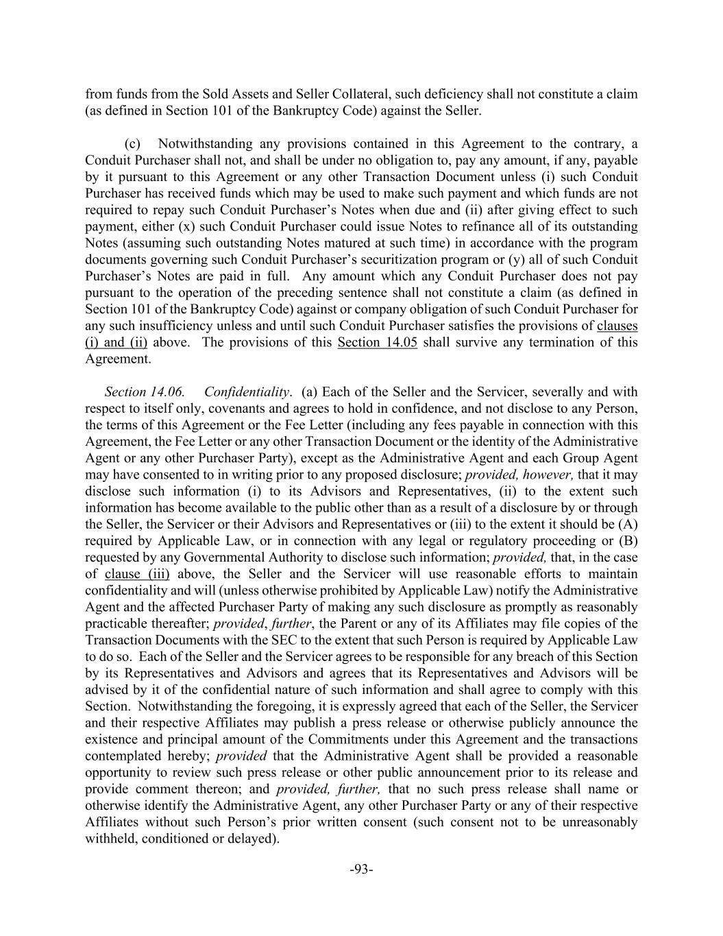 -93- from funds from the Sold Assets and Seller Collateral, such deficiency shall not constitute a claim (as defined in Section 101 of the Bankruptcy Code) against the Seller. (c) Notwithstanding any provisions contained in this Agreement to the contrary, a Conduit Purchaser shall not, and shall be under no obligation to, pay any amount, if any, payable by it pursuant to this Agreement or any other Transaction Document unless (i) such Conduit Purchaser has received funds which may be used to make such payment and which funds are not required to repay such Conduit Purchaser’s Notes when due and (ii) after giving effect to such payment, either (x) such Conduit Purchaser could issue Notes to refinance all of its outstanding Notes (assuming such outstanding Notes matured at such time) in accordance with the program documents governing such Conduit Purchaser’s securitization program or (y) all of such Conduit Purchaser’s Notes are paid in full. Any amount which any Conduit Purchaser does not pay pursuant to the operation of the preceding sentence shall not constitute a claim (as defined in Section 101 of the Bankruptcy Code) against or company obligation of such Conduit Purchaser for any such insufficiency unless and until such Conduit Purchaser satisfies the provisions of clauses (i) and (ii) above. The provisions of this Section 14.05 shall survive any termination of this Agreement. Section 14.06. Confidentiality. (a) Each of the Seller and the Servicer, severally and with respect to itself only, covenants and agrees to hold in confidence, and not disclose to any Person, the terms of this Agreement or the Fee Letter (including any fees payable in connection with this Agreement, the Fee Letter or any other Transaction Document or the identity of the Administrative Agent or any other Purchaser Party), except as the Administrative Agent and each Group Agent may have consented to in writing prior to any proposed disclosure; provided, however, that it may disclose such information (i) to its Advisors and Representatives, (ii) to the extent such information has become available to the public other than as a result of a disclosure by or through the Seller, the Servicer or their Advisors and Representatives or (iii) to the extent it should be (A) required by Applicable Law, or in connection with any legal or regulatory proceeding or (B) requested by any Governmental Authority to disclose such information; provided, that, in the case of clause (iii) above, the Seller and the Servicer will use reasonable efforts to maintain confidentiality and will (unless otherwise prohibited by Applicable Law) notify the Administrative Agent and the affected Purchaser Party of making any such disclosure as promptly as reasonably practicable thereafter; provided, further, the Parent or any of its Affiliates may file copies of the Transaction Documents with the SEC to the extent that such Person is required by Applicable Law to do so. Each of the Seller and the Servicer agrees to be responsible for any breach of this Section by its Representatives and Advisors and agrees that its Representatives and Advisors will be advised by it of the confidential nature of such information and shall agree to comply with this Section. Notwithstanding the foregoing, it is expressly agreed that each of the Seller, the Servicer and their respective Affiliates may publish a press release or otherwise publicly announce the existence and principal amount of the Commitments under this Agreement and the transactions contemplated hereby; provided that the Administrative Agent shall be provided a reasonable opportunity to review such press release or other public announcement prior to its release and provide comment thereon; and provided, further, that no such press release shall name or otherwise identify the Administrative Agent, any other Purchaser Party or any of their respective Affiliates without such Person’s prior written consent (such consent not to be unreasonably withheld, conditioned or delayed).