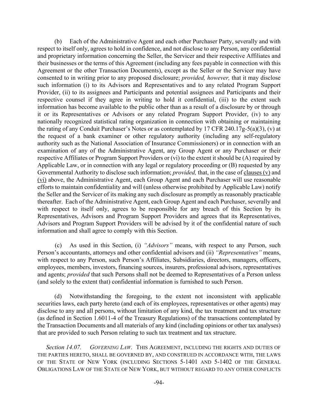 -94- (b) Each of the Administrative Agent and each other Purchaser Party, severally and with respect to itself only, agrees to hold in confidence, and not disclose to any Person, any confidential and proprietary information concerning the Seller, the Servicer and their respective Affiliates and their businesses or the terms of this Agreement (including any fees payable in connection with this Agreement or the other Transaction Documents), except as the Seller or the Servicer may have consented to in writing prior to any proposed disclosure; provided, however, that it may disclose such information (i) to its Advisors and Representatives and to any related Program Support Provider, (ii) to its assignees and Participants and potential assignees and Participants and their respective counsel if they agree in writing to hold it confidential, (iii) to the extent such information has become available to the public other than as a result of a disclosure by or through it or its Representatives or Advisors or any related Program Support Provider, (iv) to any nationally recognized statistical rating organization in connection with obtaining or maintaining the rating of any Conduit Purchaser’s Notes or as contemplated by 17 CFR 240.17g-5(a)(3), (v) at the request of a bank examiner or other regulatory authority (including any self-regulatory authority such as the National Association of Insurance Commissioners) or in connection with an examination of any of the Administrative Agent, any Group Agent or any Purchaser or their respective Affiliates or Program Support Providers or (vi) to the extent it should be (A) required by Applicable Law, or in connection with any legal or regulatory proceeding or (B) requested by any Governmental Authority to disclose such information; provided, that, in the case of clauses (v) and (vi) above, the Administrative Agent, each Group Agent and each Purchaser will use reasonable efforts to maintain confidentiality and will (unless otherwise prohibited by Applicable Law) notify the Seller and the Servicer of its making any such disclosure as promptly as reasonably practicable thereafter. Each of the Administrative Agent, each Group Agent and each Purchaser, severally and with respect to itself only, agrees to be responsible for any breach of this Section by its Representatives, Advisors and Program Support Providers and agrees that its Representatives, Advisors and Program Support Providers will be advised by it of the confidential nature of such information and shall agree to comply with this Section. (c) As used in this Section, (i) “Advisors” means, with respect to any Person, such Person’s accountants, attorneys and other confidential advisors and (ii) “Representatives” means, with respect to any Person, such Person’s Affiliates, Subsidiaries, directors, managers, officers, employees, members, investors, financing sources, insurers, professional advisors, representatives and agents; provided that such Persons shall not be deemed to Representatives of a Person unless (and solely to the extent that) confidential information is furnished to such Person. (d) Notwithstanding the foregoing, to the extent not inconsistent with applicable securities laws, each party hereto (and each of its employees, representatives or other agents) may disclose to any and all persons, without limitation of any kind, the tax treatment and tax structure (as defined in Section 1.6011-4 of the Treasury Regulations) of the transactions contemplated by the Transaction Documents and all materials of any kind (including opinions or other tax analyses) that are provided to such Person relating to such tax treatment and tax structure. Section 14.07. GOVERNING LAW. THIS AGREEMENT, INCLUDING THE RIGHTS AND DUTIES OF THE PARTIES HERETO, SHALL BE GOVERNED BY, AND CONSTRUED IN ACCORDANCE WITH, THE LAWS OF THE STATE OF NEW YORK (INCLUDING SECTIONS 5-1401 AND 5-1402 OF THE GENERAL OBLIGATIONS LAW OF THE STATE OF NEW YORK, BUT WITHOUT REGARD TO ANY OTHER CONFLICTS