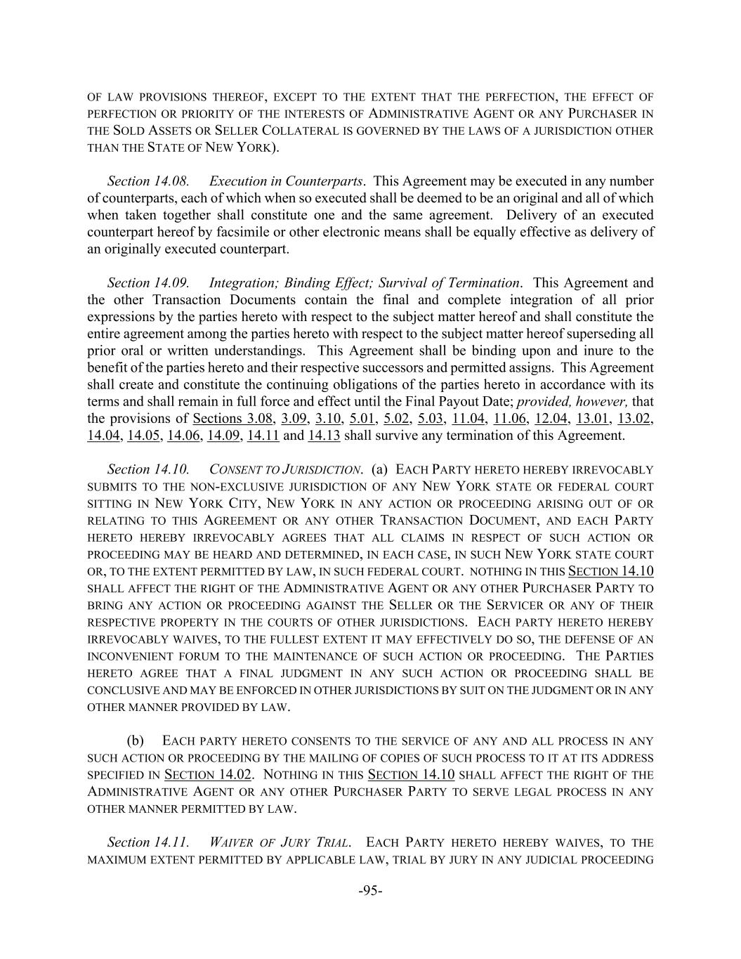 -95- OF LAW PROVISIONS THEREOF, EXCEPT TO THE EXTENT THAT THE PERFECTION, THE EFFECT OF PERFECTION OR PRIORITY OF THE INTERESTS OF ADMINISTRATIVE AGENT OR ANY PURCHASER IN THE SOLD ASSETS OR SELLER COLLATERAL IS GOVERNED BY THE LAWS OF A JURISDICTION OTHER THAN THE STATE OF NEW YORK). Section 14.08. Execution in Counterparts. This Agreement may be executed in any number of counterparts, each of which when so executed shall be deemed to be an original and all of which when taken together shall constitute one and the same agreement. Delivery of an executed counterpart hereof by facsimile or other electronic means shall be equally effective as delivery of an originally executed counterpart. Section 14.09. Integration; Binding Effect; Survival of Termination. This Agreement and the other Transaction Documents contain the final and complete integration of all prior expressions by the parties hereto with respect to the subject matter hereof and shall constitute the entire agreement among the parties hereto with respect to the subject matter hereof superseding all prior oral or written understandings. This Agreement shall be binding upon and inure to the benefit of the parties hereto and their respective successors and permitted assigns. This Agreement shall create and constitute the continuing obligations of the parties hereto in accordance with its terms and shall remain in full force and effect until the Final Payout Date; provided, however, that the provisions of Sections 3.08, 3.09, 3.10, 5.01, 5.02, 5.03, 11.04, 11.06, 12.04, 13.01, 13.02, 14.04, 14.05, 14.06, 14.09, 14.11 and 14.13 shall survive any termination of this Agreement. Section 14.10. CONSENT TO JURISDICTION. (a) EACH PARTY HERETO HEREBY IRREVOCABLY SUBMITS TO THE NON-EXCLUSIVE JURISDICTION OF ANY NEW YORK STATE OR FEDERAL COURT SITTING IN NEW YORK CITY, NEW YORK IN ANY ACTION OR PROCEEDING ARISING OUT OF OR RELATING TO THIS AGREEMENT OR ANY OTHER TRANSACTION DOCUMENT, AND EACH PARTY HERETO HEREBY IRREVOCABLY AGREES THAT ALL CLAIMS IN RESPECT OF SUCH ACTION OR PROCEEDING MAY BE HEARD AND DETERMINED, IN EACH CASE, IN SUCH NEW YORK STATE COURT OR, TO THE EXTENT PERMITTED BY LAW, IN SUCH FEDERAL COURT. NOTHING IN THIS SECTION 14.10 SHALL AFFECT THE RIGHT OF THE ADMINISTRATIVE AGENT OR ANY OTHER PURCHASER PARTY TO BRING ANY ACTION OR PROCEEDING AGAINST THE SELLER OR THE SERVICER OR ANY OF THEIR RESPECTIVE PROPERTY IN THE COURTS OF OTHER JURISDICTIONS. EACH PARTY HERETO HEREBY IRREVOCABLY WAIVES, TO THE FULLEST EXTENT IT MAY EFFECTIVELY DO SO, THE DEFENSE OF AN INCONVENIENT FORUM TO THE MAINTENANCE OF SUCH ACTION OR PROCEEDING. THE PARTIES HERETO AGREE THAT A FINAL JUDGMENT IN ANY SUCH ACTION OR PROCEEDING SHALL BE CONCLUSIVE AND MAY BE ENFORCED IN OTHER JURISDICTIONS BY SUIT ON THE JUDGMENT OR IN ANY OTHER MANNER PROVIDED BY LAW. (b) EACH PARTY HERETO CONSENTS TO THE SERVICE OF ANY AND ALL PROCESS IN ANY SUCH ACTION OR PROCEEDING BY THE MAILING OF COPIES OF SUCH PROCESS TO IT AT ITS ADDRESS SPECIFIED IN SECTION 14.02. NOTHING IN THIS SECTION 14.10 SHALL AFFECT THE RIGHT OF THE ADMINISTRATIVE AGENT OR ANY OTHER PURCHASER PARTY TO SERVE LEGAL PROCESS IN ANY OTHER MANNER PERMITTED BY LAW. Section 14.11. WAIVER OF JURY TRIAL. EACH PARTY HERETO HEREBY WAIVES, TO THE MAXIMUM EXTENT PERMITTED BY APPLICABLE LAW, TRIAL BY JURY IN ANY JUDICIAL PROCEEDING
