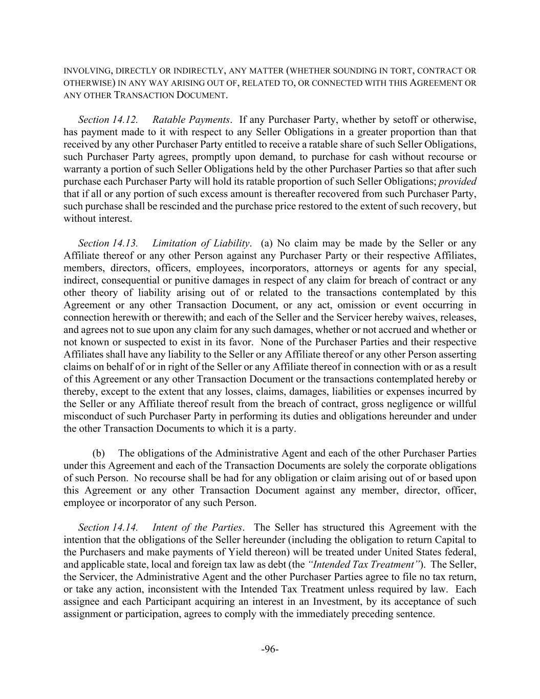 -96- INVOLVING, DIRECTLY OR INDIRECTLY, ANY MATTER (WHETHER SOUNDING IN TORT, CONTRACT OR OTHERWISE) IN ANY WAY ARISING OUT OF, RELATED TO, OR CONNECTED WITH THIS AGREEMENT OR ANY OTHER TRANSACTION DOCUMENT. Section 14.12. Ratable Payments. If any Purchaser Party, whether by setoff or otherwise, has payment made to it with respect to any Seller Obligations in a greater proportion than that received by any other Purchaser Party entitled to receive a ratable share of such Seller Obligations, such Purchaser Party agrees, promptly upon demand, to purchase for cash without recourse or warranty a portion of such Seller Obligations held by the other Purchaser Parties so that after such purchase each Purchaser Party will hold its ratable proportion of such Seller Obligations; provided that if all or any portion of such excess amount is thereafter recovered from such Purchaser Party, such purchase shall be rescinded and the purchase price restored to the extent of such recovery, but without interest. Section 14.13. Limitation of Liability. (a) No claim may be made by the Seller or any Affiliate thereof or any other Person against any Purchaser Party or their respective Affiliates, members, directors, officers, employees, incorporators, attorneys or agents for any special, indirect, consequential or punitive damages in respect of any claim for breach of contract or any other theory of liability arising out of or related to the transactions contemplated by this Agreement or any other Transaction Document, or any act, omission or event occurring in connection herewith or therewith; and each of the Seller and the Servicer hereby waives, releases, and agrees not to sue upon any claim for any such damages, whether or not accrued and whether or not known or suspected to exist in its favor. None of the Purchaser Parties and their respective Affiliates shall have any liability to the Seller or any Affiliate thereof or any other Person asserting claims on behalf of or in right of the Seller or any Affiliate thereof in connection with or as a result of this Agreement or any other Transaction Document or the transactions contemplated hereby or thereby, except to the extent that any losses, claims, damages, liabilities or expenses incurred by the Seller or any Affiliate thereof result from the breach of contract, gross negligence or willful misconduct of such Purchaser Party in performing its duties and obligations hereunder and under the other Transaction Documents to which it is a party. (b) The obligations of the Administrative Agent and each of the other Purchaser Parties under this Agreement and each of the Transaction Documents are solely the corporate obligations of such Person. No recourse shall be had for any obligation or claim arising out of or based upon this Agreement or any other Transaction Document against any member, director, officer, employee or incorporator of any such Person. Section 14.14. Intent of the Parties. The Seller has structured this Agreement with the intention that the obligations of the Seller hereunder (including the obligation to return Capital to the Purchasers and make payments of Yield thereon) will be treated under United States federal, and applicable state, local and foreign tax law as debt (the “Intended Tax Treatment”). The Seller, the Servicer, the Administrative Agent and the other Purchaser Parties agree to file no tax return, or take any action, inconsistent with the Intended Tax Treatment unless required by law. Each assignee and each Participant acquiring an interest in an Investment, by its acceptance of such assignment or participation, agrees to comply with the immediately preceding sentence.