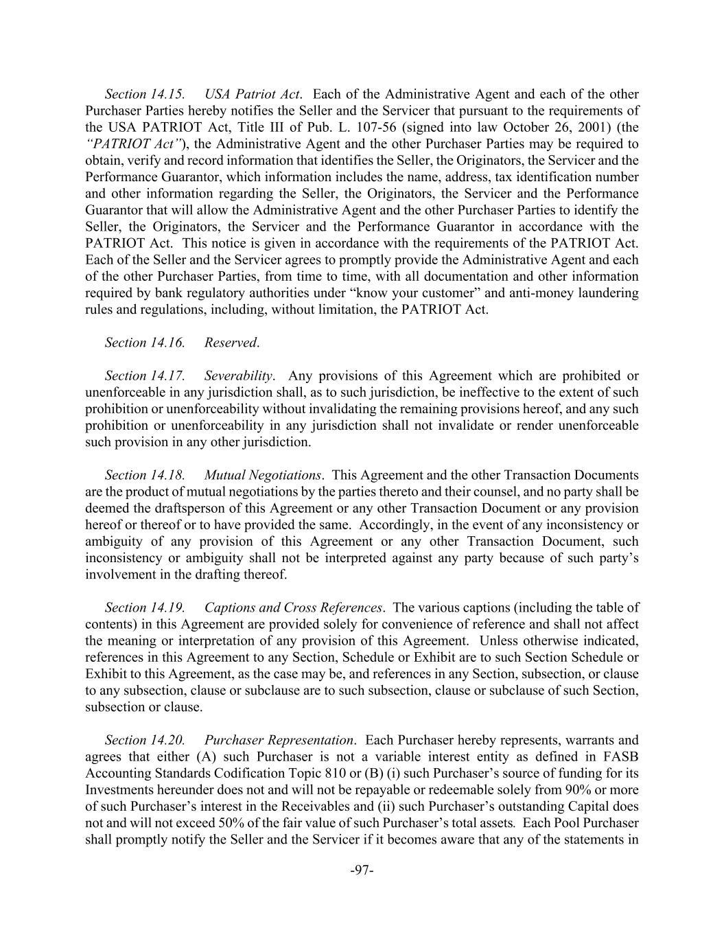 -97- Section 14.15. USA Patriot Act. Each of the Administrative Agent and each of the other Purchaser Parties hereby notifies the Seller and the Servicer that pursuant to the requirements of the USA PATRIOT Act, Title III of Pub. L. 107-56 (signed into law October 26, 2001) (the “PATRIOT Act”), the Administrative Agent and the other Purchaser Parties may be required to obtain, verify and record information that identifies the Seller, the Originators, the Servicer and the Performance Guarantor, which information includes the name, address, tax identification number and other information regarding the Seller, the Originators, the Servicer and the Performance Guarantor that will allow the Administrative Agent and the other Purchaser Parties to identify the Seller, the Originators, the Servicer and the Performance Guarantor in accordance with the PATRIOT Act. This notice is given in accordance with the requirements of the PATRIOT Act. Each of the Seller and the Servicer agrees to promptly provide the Administrative Agent and each of the other Purchaser Parties, from time to time, with all documentation and other information required by bank regulatory authorities under “know your customer” and anti-money laundering rules and regulations, including, without limitation, the PATRIOT Act. Section 14.16. Reserved. Section 14.17. Severability. Any provisions of this Agreement which are prohibited or unenforceable in any jurisdiction shall, as to such jurisdiction, be ineffective to the extent of such prohibition or unenforceability without invalidating the remaining provisions hereof, and any such prohibition or unenforceability in any jurisdiction shall not invalidate or render unenforceable such provision in any other jurisdiction. Section 14.18. Mutual Negotiations. This Agreement and the other Transaction Documents are the product of mutual negotiations by the parties thereto and their counsel, and no party shall be deemed the draftsperson of this Agreement or any other Transaction Document or any provision hereof or thereof or to have provided the same. Accordingly, in the event of any inconsistency or ambiguity of any provision of this Agreement or any other Transaction Document, such inconsistency or ambiguity shall not be interpreted against any party because of such party’s involvement in the drafting thereof. Section 14.19. Captions and Cross References. The various captions (including the table of contents) in this Agreement are provided solely for convenience of reference and shall not affect the meaning or interpretation of any provision of this Agreement. Unless otherwise indicated, references in this Agreement to any Section, Schedule or Exhibit are to such Section Schedule or Exhibit to this Agreement, as the case may be, and references in any Section, subsection, or clause to any subsection, clause or subclause are to such subsection, clause or subclause of such Section, subsection or clause. Section 14.20. Purchaser Representation. Each Purchaser hereby represents, warrants and agrees that either (A) such Purchaser is not a variable interest entity as defined in FASB Accounting Standards Codification Topic 810 or (B) (i) such Purchaser’s source of funding for its Investments hereunder does not and will not be repayable or redeemable solely from 90% or more of such Purchaser’s interest in the Receivables and (ii) such Purchaser’s outstanding Capital does not and will not exceed 50% of the fair value of such Purchaser’s total assets. Each Pool Purchaser shall promptly notify the Seller and the Servicer if it becomes aware that any of the statements in