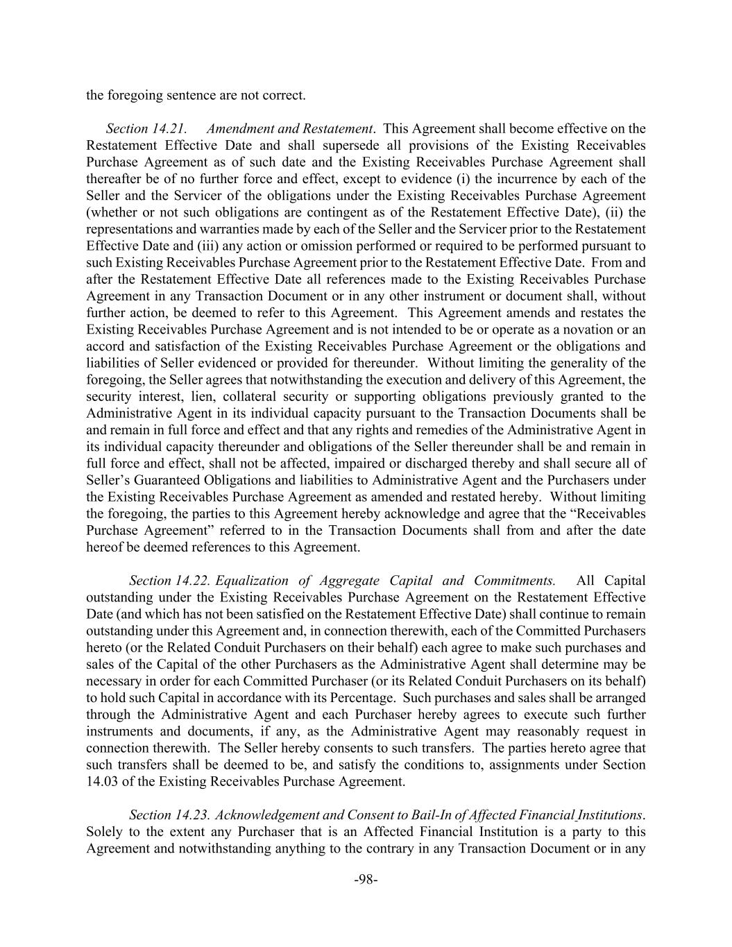 -98- the foregoing sentence are not correct. Section 14.21. Amendment and Restatement. This Agreement shall become effective on the Restatement Effective Date and shall supersede all provisions of the Existing Receivables Purchase Agreement as of such date and the Existing Receivables Purchase Agreement shall thereafter be of no further force and effect, except to evidence (i) the incurrence by each of the Seller and the Servicer of the obligations under the Existing Receivables Purchase Agreement (whether or not such obligations are contingent as of the Restatement Effective Date), (ii) the representations and warranties made by each of the Seller and the Servicer prior to the Restatement Effective Date and (iii) any action or omission performed or required to be performed pursuant to such Existing Receivables Purchase Agreement prior to the Restatement Effective Date. From and after the Restatement Effective Date all references made to the Existing Receivables Purchase Agreement in any Transaction Document or in any other instrument or document shall, without further action, be deemed to refer to this Agreement. This Agreement amends and restates the Existing Receivables Purchase Agreement and is not intended to be or operate as a novation or an accord and satisfaction of the Existing Receivables Purchase Agreement or the obligations and liabilities of Seller evidenced or provided for thereunder. Without limiting the generality of the foregoing, the Seller agrees that notwithstanding the execution and delivery of this Agreement, the security interest, lien, collateral security or supporting obligations previously granted to the Administrative Agent in its individual capacity pursuant to the Transaction Documents shall be and remain in full force and effect and that any rights and remedies of the Administrative Agent in its individual capacity thereunder and obligations of the Seller thereunder shall be and remain in full force and effect, shall not be affected, impaired or discharged thereby and shall secure all of Seller’s Guaranteed Obligations and liabilities to Administrative Agent and the Purchasers under the Existing Receivables Purchase Agreement as amended and restated hereby. Without limiting the foregoing, the parties to this Agreement hereby acknowledge and agree that the “Receivables Purchase Agreement” referred to in the Transaction Documents shall from and after the date hereof be deemed references to this Agreement. Section 14.22. Equalization of Aggregate Capital and Commitments. All Capital outstanding under the Existing Receivables Purchase Agreement on the Restatement Effective Date (and which has not been satisfied on the Restatement Effective Date) shall continue to remain outstanding under this Agreement and, in connection therewith, each of the Committed Purchasers hereto (or the Related Conduit Purchasers on their behalf) each agree to make such purchases and sales of the Capital of the other Purchasers as the Administrative Agent shall determine may be necessary in order for each Committed Purchaser (or its Related Conduit Purchasers on its behalf) to hold such Capital in accordance with its Percentage. Such purchases and sales shall be arranged through the Administrative Agent and each Purchaser hereby agrees to execute such further instruments and documents, if any, as the Administrative Agent may reasonably request in connection therewith. The Seller hereby consents to such transfers. The parties hereto agree that such transfers shall be deemed to be, and satisfy the conditions to, assignments under Section 14.03 of the Existing Receivables Purchase Agreement. Section 14.23. Acknowledgement and Consent to Bail-In of Affected Financial Institutions. Solely to the extent any Purchaser that is an Affected Financial Institution is a party to this Agreement and notwithstanding anything to the contrary in any Transaction Document or in any