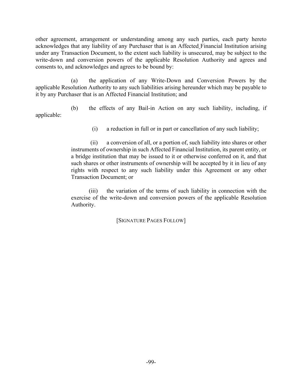 -99- other agreement, arrangement or understanding among any such parties, each party hereto acknowledges that any liability of any Purchaser that is an Affected Financial Institution arising under any Transaction Document, to the extent such liability is unsecured, may be subject to the write-down and conversion powers of the applicable Resolution Authority and agrees and consents to, and acknowledges and agrees to be bound by: (a) the application of any Write-Down and Conversion Powers by the applicable Resolution Authority to any such liabilities arising hereunder which may be payable to it by any Purchaser that is an Affected Financial Institution; and (b) the effects of any Bail-in Action on any such liability, including, if applicable: (i) a reduction in full or in part or cancellation of any such liability; (ii) a conversion of all, or a portion of, such liability into shares or other instruments of ownership in such Affected Financial Institution, its parent entity, or a bridge institution that may be issued to it or otherwise conferred on it, and that such shares or other instruments of ownership will be accepted by it in lieu of any rights with respect to any such liability under this Agreement or any other Transaction Document; or (iii) the variation of the terms of such liability in connection with the exercise of the write-down and conversion powers of the applicable Resolution Authority. [SIGNATURE PAGES FOLLOW]
