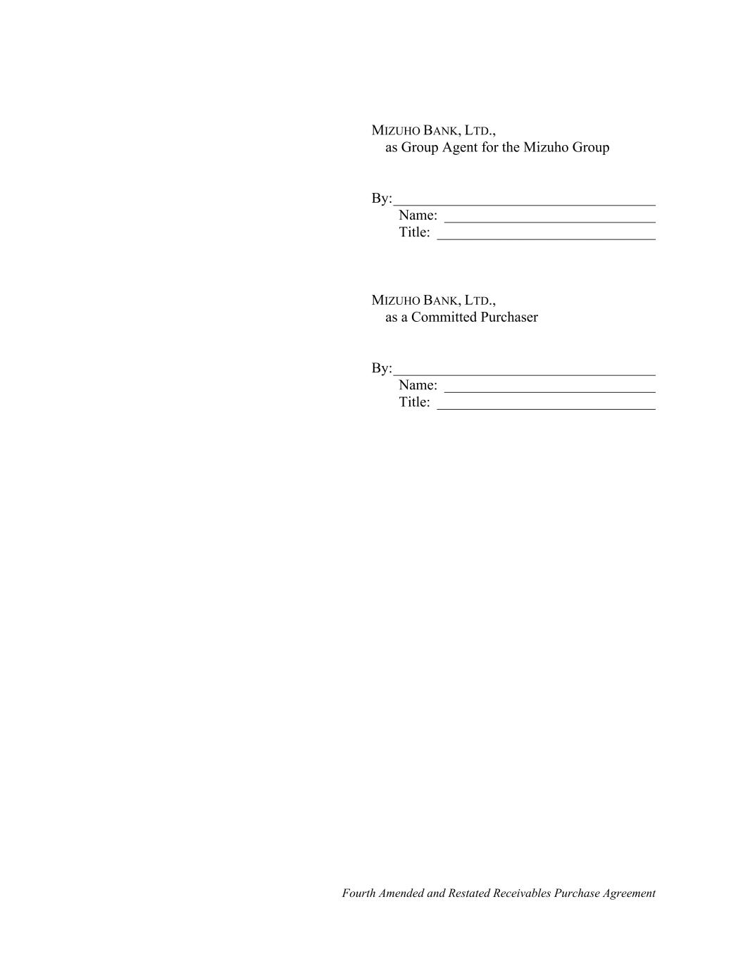 Fourth Amended and Restated Receivables Purchase Agreement MIZUHO BANK, LTD., as Group Agent for the Mizuho Group By:____________________________________ Name: _____________________________ Title: ______________________________ MIZUHO BANK, LTD., as a Committed Purchaser By:____________________________________ Name: _____________________________ Title: ______________________________