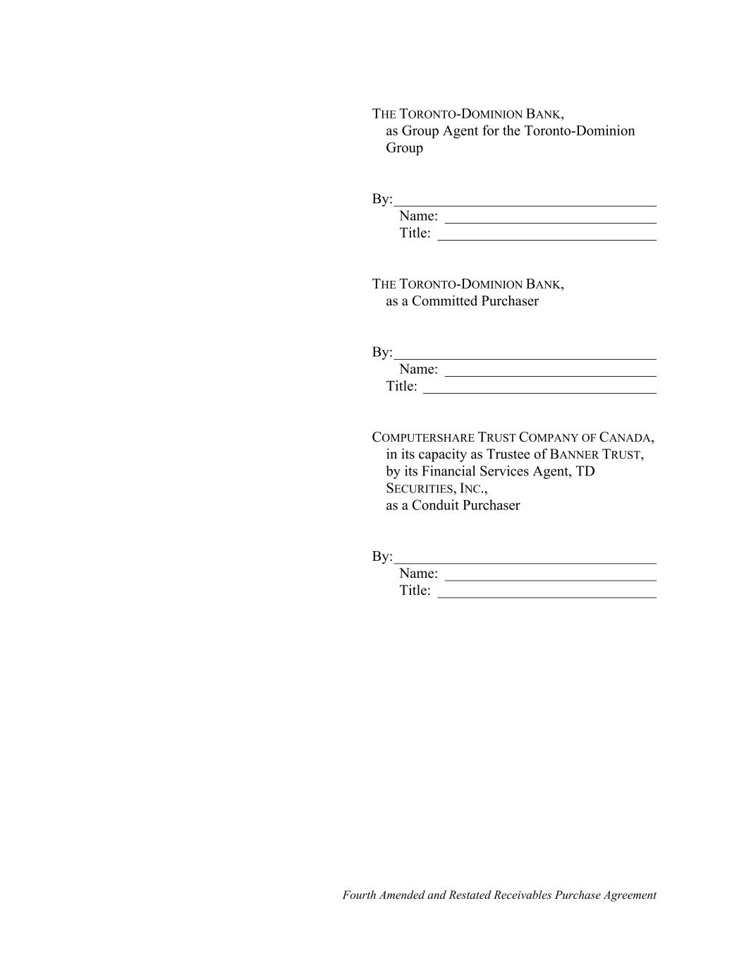 Fourth Amended and Restated Receivables Purchase Agreement THE TORONTO-DOMINION BANK, as Group Agent for the Toronto-Dominion Group By:____________________________________ Name: _____________________________ Title: ______________________________ THE TORONTO-DOMINION BANK, as a Committed Purchaser By:____________________________________ Name: _____________________________ Title: ________________________________ COMPUTERSHARE TRUST COMPANY OF CANADA, in its capacity as Trustee of BANNER TRUST, by its Financial Services Agent, TD SECURITIES, INC., as a Conduit Purchaser By:____________________________________ Name: _____________________________ Title: ______________________________