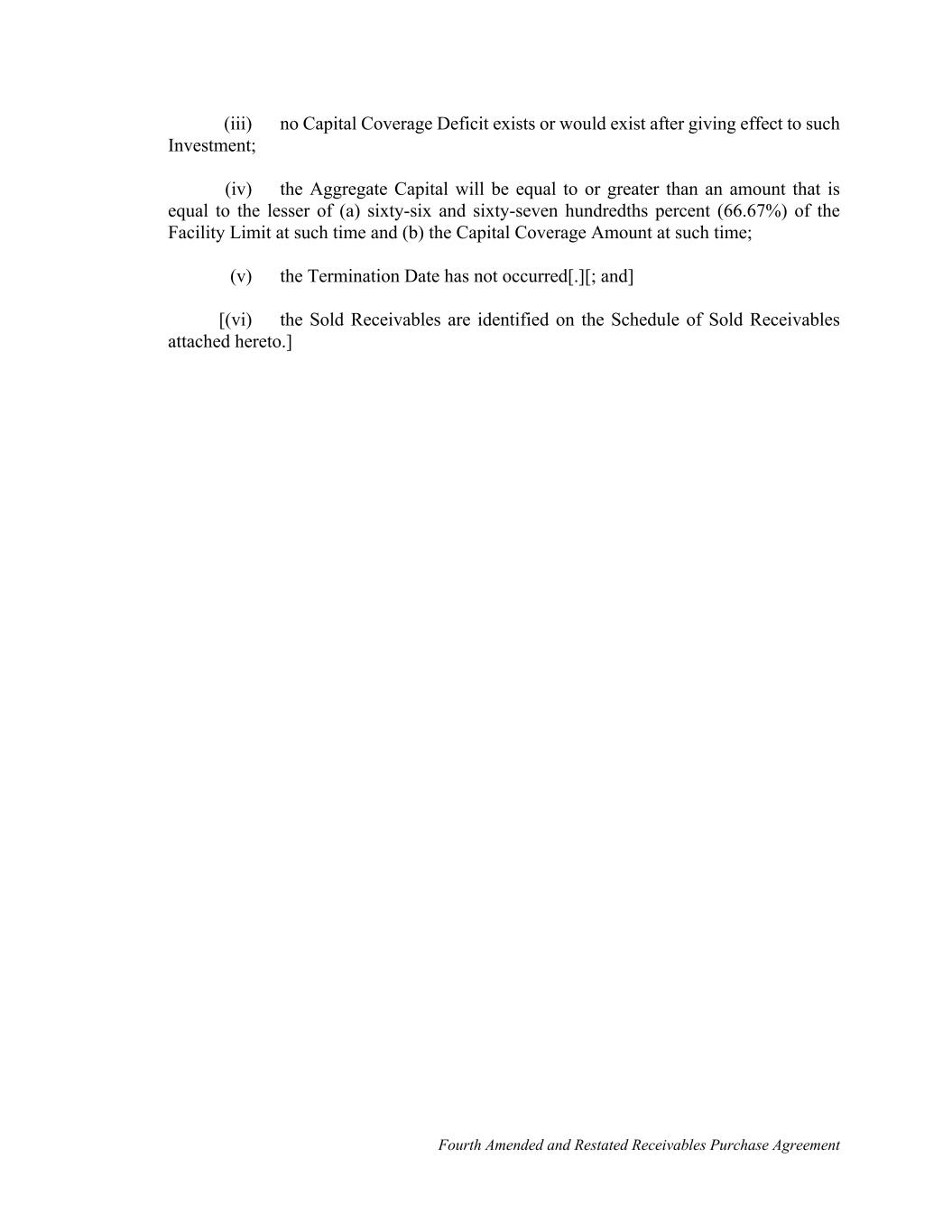 Fourth Amended and Restated Receivables Purchase Agreement (iii) no Capital Coverage Deficit exists or would exist after giving effect to such Investment; (iv) the Aggregate Capital will be equal to or greater than an amount that is equal to the lesser of (a) sixty-six and sixty-seven hundredths percent (66.67%) of the Facility Limit at such time and (b) the Capital Coverage Amount at such time; (v) the Termination Date has not occurred[.][; and] [(vi) the Sold Receivables are identified on the Schedule of Sold Receivables attached hereto.]