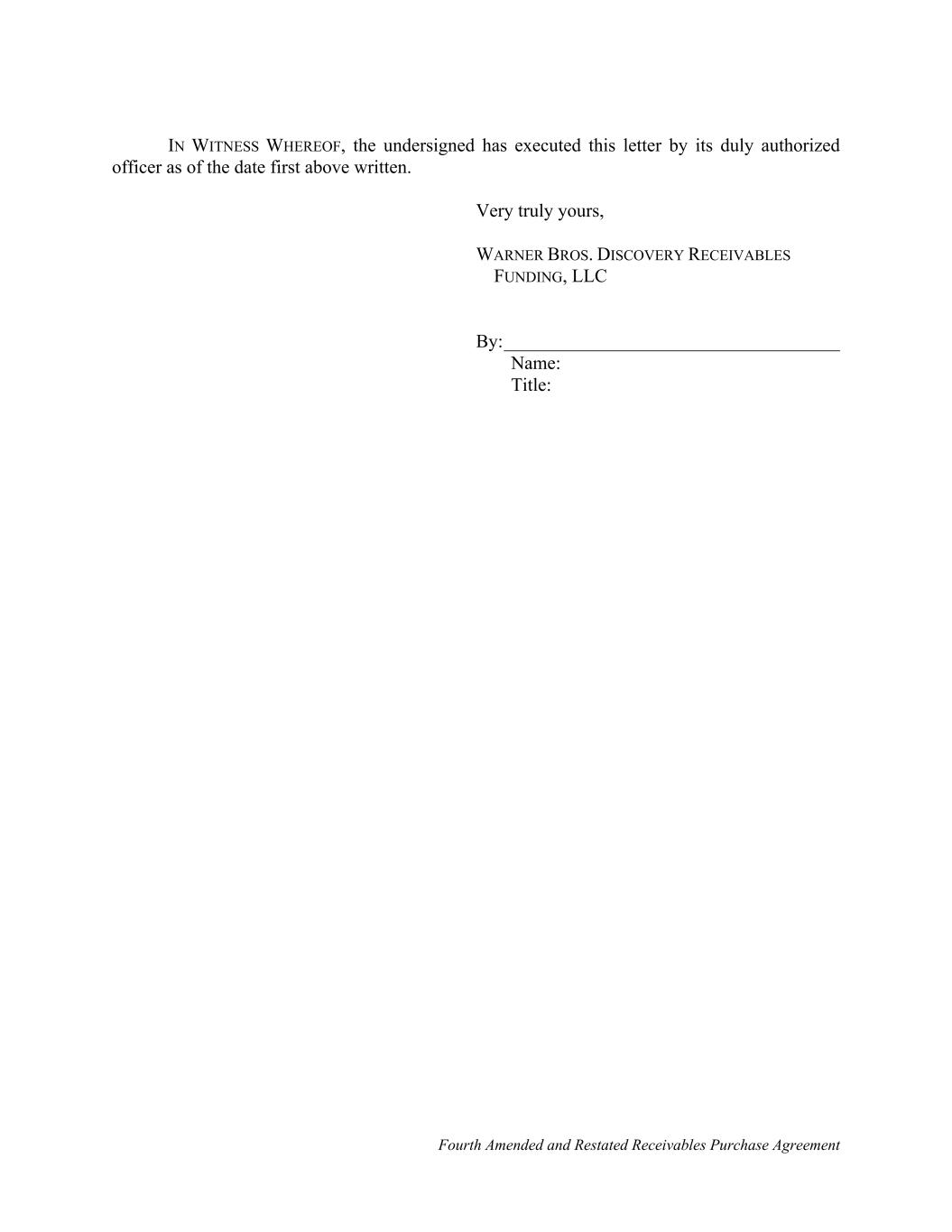 Fourth Amended and Restated Receivables Purchase Agreement IN WITNESS WHEREOF, the undersigned has executed this letter by its duly authorized officer as of the date first above written. Very truly yours, WARNER BROS. DISCOVERY RECEIVABLES FUNDING, LLC By:____________________________________ Name: Title: