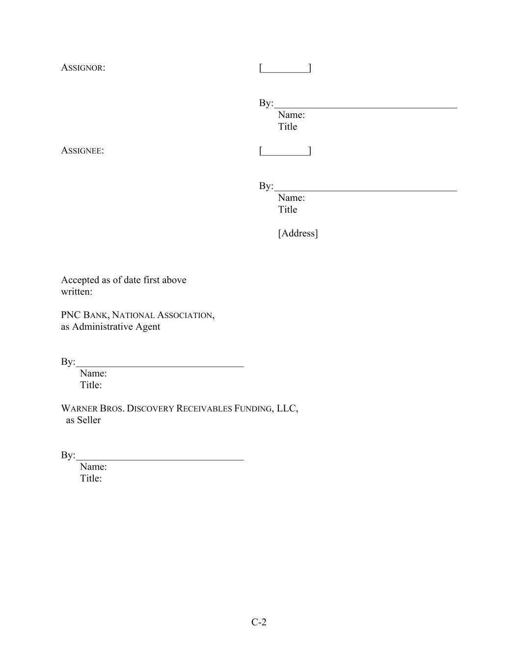 C-2 ASSIGNOR: [_________] By:____________________________________ Name: Title ASSIGNEE: [_________] By:____________________________________ Name: Title [Address] Accepted as of date first above written: PNC BANK, NATIONAL ASSOCIATION, as Administrative Agent By:_________________________________ Name: Title: WARNER BROS. DISCOVERY RECEIVABLES FUNDING, LLC, as Seller By:_________________________________ Name: Title: