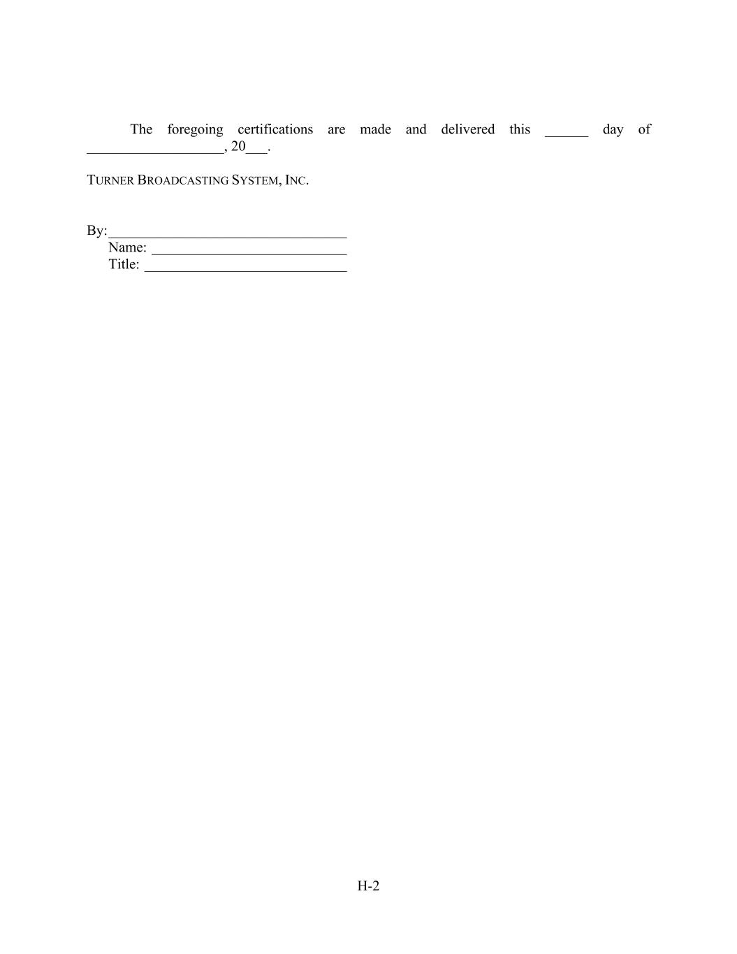 H-2 The foregoing certifications are made and delivered this ______ day of ___________________, 20___. TURNER BROADCASTING SYSTEM, INC. By:_________________________________ Name: ___________________________ Title: ____________________________