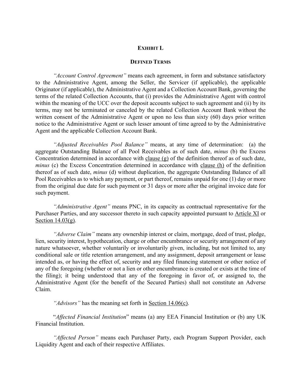 EXHIBIT L DEFINED TERMS “Account Control Agreement” means each agreement, in form and substance satisfactory to the Administrative Agent, among the Seller, the Servicer (if applicable), the applicable Originator (if applicable), the Administrative Agent and a Collection Account Bank, governing the terms of the related Collection Accounts, that (i) provides the Administrative Agent with control within the meaning of the UCC over the deposit accounts subject to such agreement and (ii) by its terms, may not be terminated or canceled by the related Collection Account Bank without the written consent of the Administrative Agent or upon no less than sixty (60) days prior written notice to the Administrative Agent or such lesser amount of time agreed to by the Administrative Agent and the applicable Collection Account Bank. “Adjusted Receivables Pool Balance” means, at any time of determination: (a) the aggregate Outstanding Balance of all Pool Receivables as of such date, minus (b) the Excess Concentration determined in accordance with clause (g) of the definition thereof as of such date, minus (c) the Excess Concentration determined in accordance with clause (h) of the definition thereof as of such date, minus (d) without duplication, the aggregate Outstanding Balance of all Pool Receivables as to which any payment, or part thereof, remains unpaid for one (1) day or more from the original due date for such payment or 31 days or more after the original invoice date for such payment. “Administrative Agent” means PNC, in its capacity as contractual representative for the Purchaser Parties, and any successor thereto in such capacity appointed pursuant to Article XI or Section 14.03(g). “Adverse Claim” means any ownership interest or claim, mortgage, deed of trust, pledge, lien, security interest, hypothecation, charge or other encumbrance or security arrangement of any nature whatsoever, whether voluntarily or involuntarily given, including, but not limited to, any conditional sale or title retention arrangement, and any assignment, deposit arrangement or lease intended as, or having the effect of, security and any filed financing statement or other notice of any of the foregoing (whether or not a lien or other encumbrance is created or exists at the time of the filing); it being understood that any of the foregoing in favor of, or assigned to, the Administrative Agent (for the benefit of the Secured Parties) shall not constitute an Adverse Claim. “Advisors” has the meaning set forth in Section 14.06(c). “Affected Financial Institution” means (a) any EEA Financial Institution or (b) any UK Financial Institution. “Affected Person” means each Purchaser Party, each Program Support Provider, each Liquidity Agent and each of their respective Affiliates.
